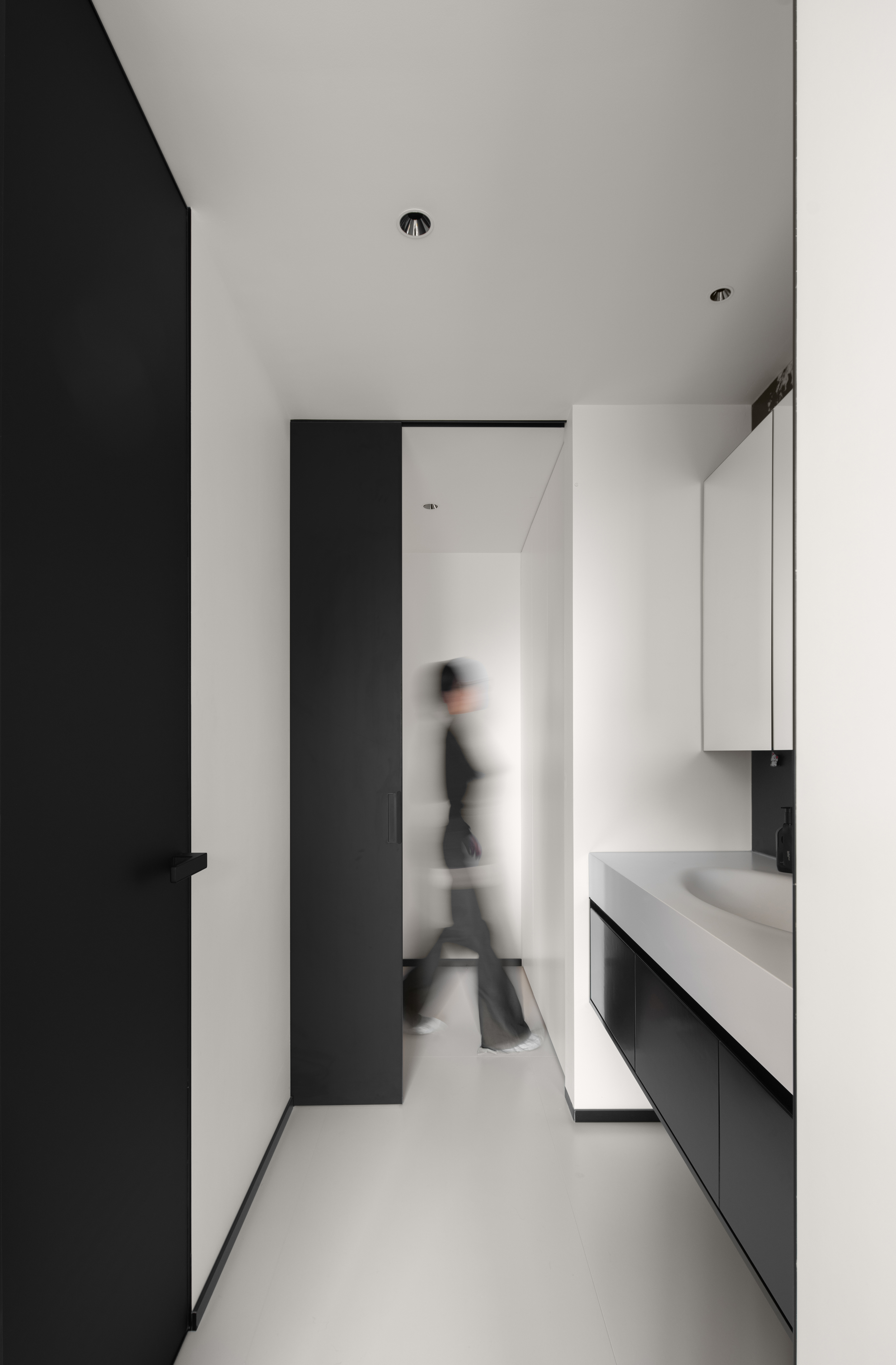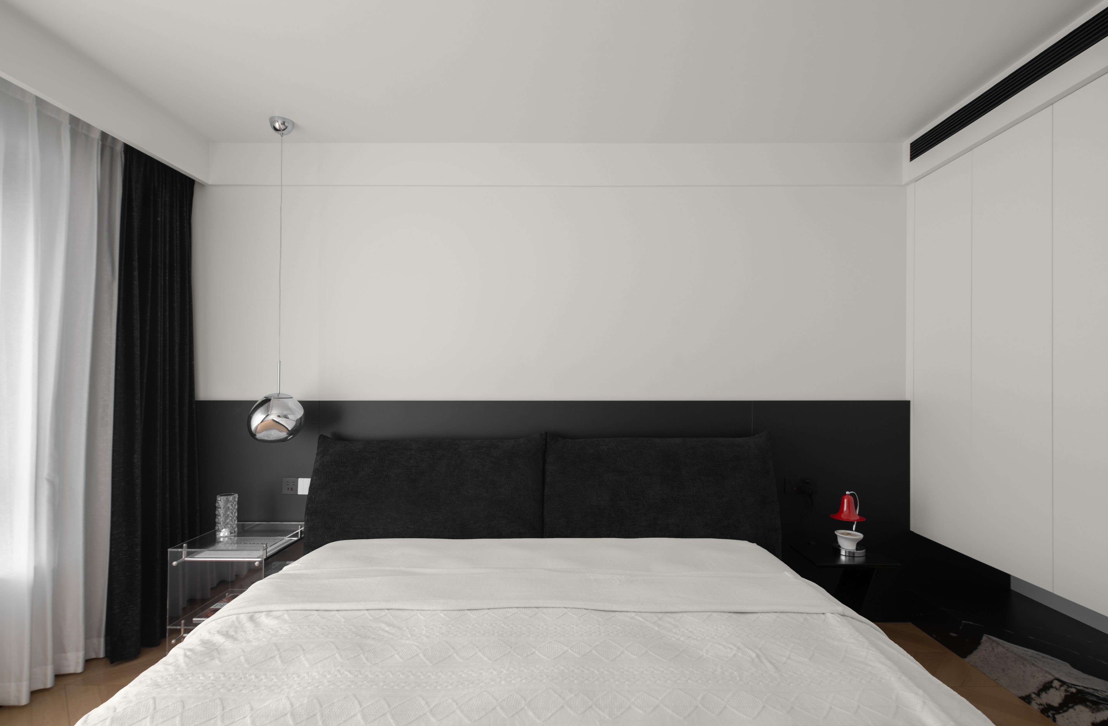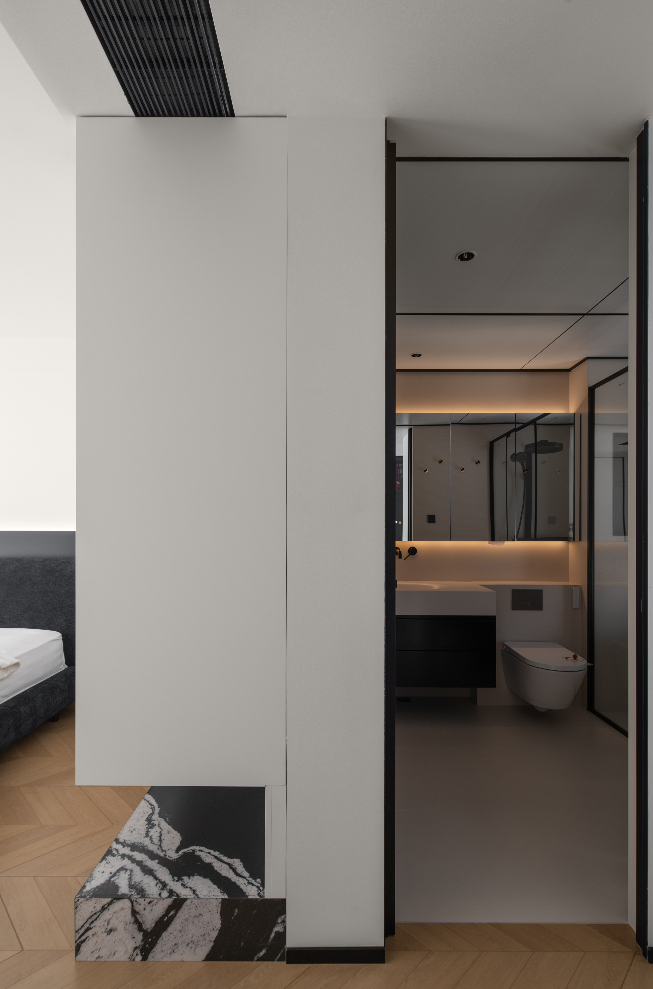 主卧同样遵循了公区的设计法则,黑白的色调和极简穿插式的设计,再搭配以少量的金属、玻璃等材质点缀,素净而高级。套间内的卫生间避免了门床对应,搭配无主灯设计,整个空间统一而又不失层次感。