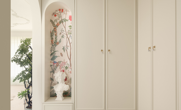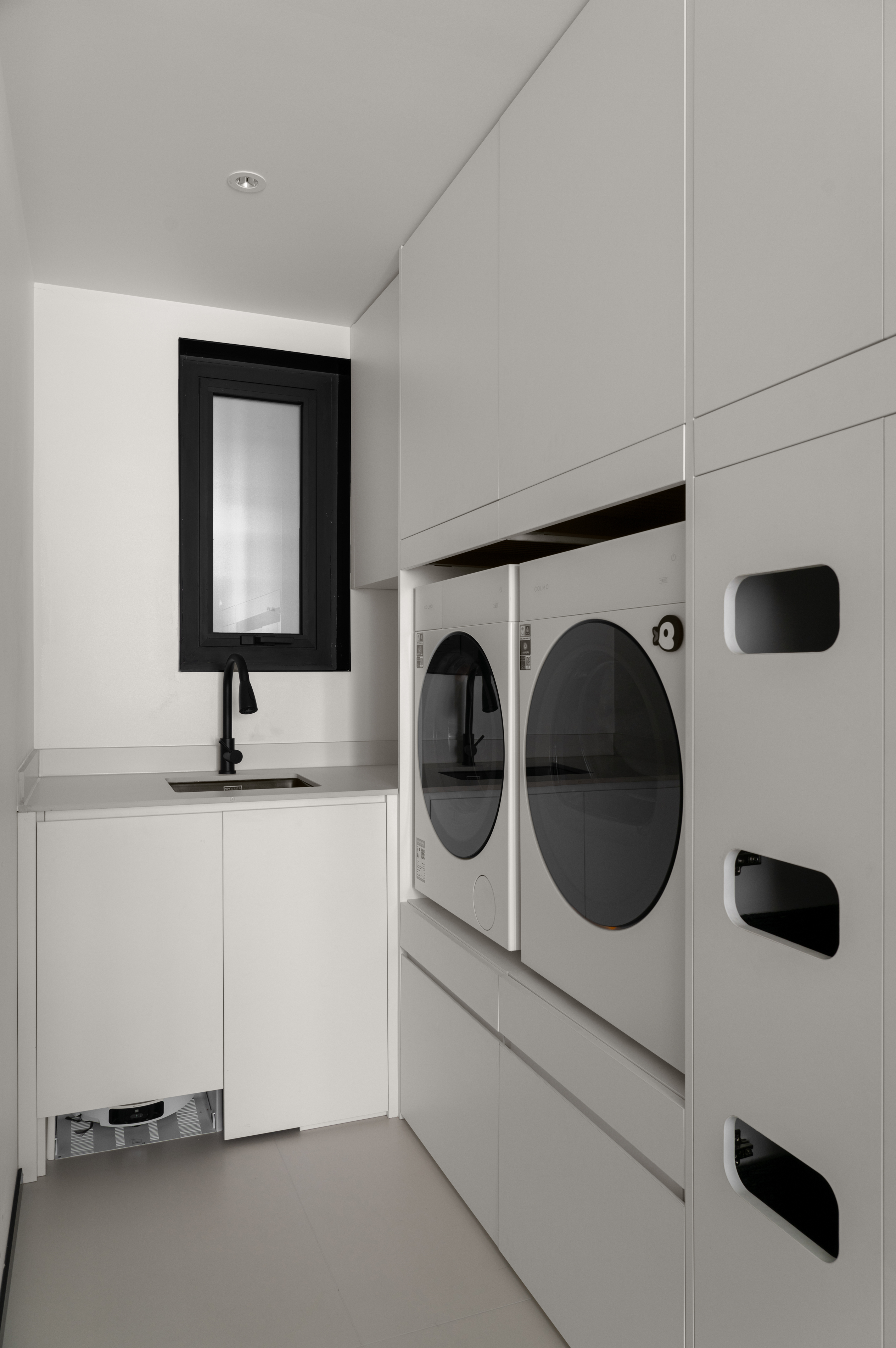 家政间以实用功能性为主,双排平放洗烘机,使用时不用弯腰更方便。上下做置物板,方便衣物临时挂取、摆放。多柜体设计增加储物空间。同时一侧的柜门做开孔设计,内置收纳置物篮,平时拿取家政小工具超方便!