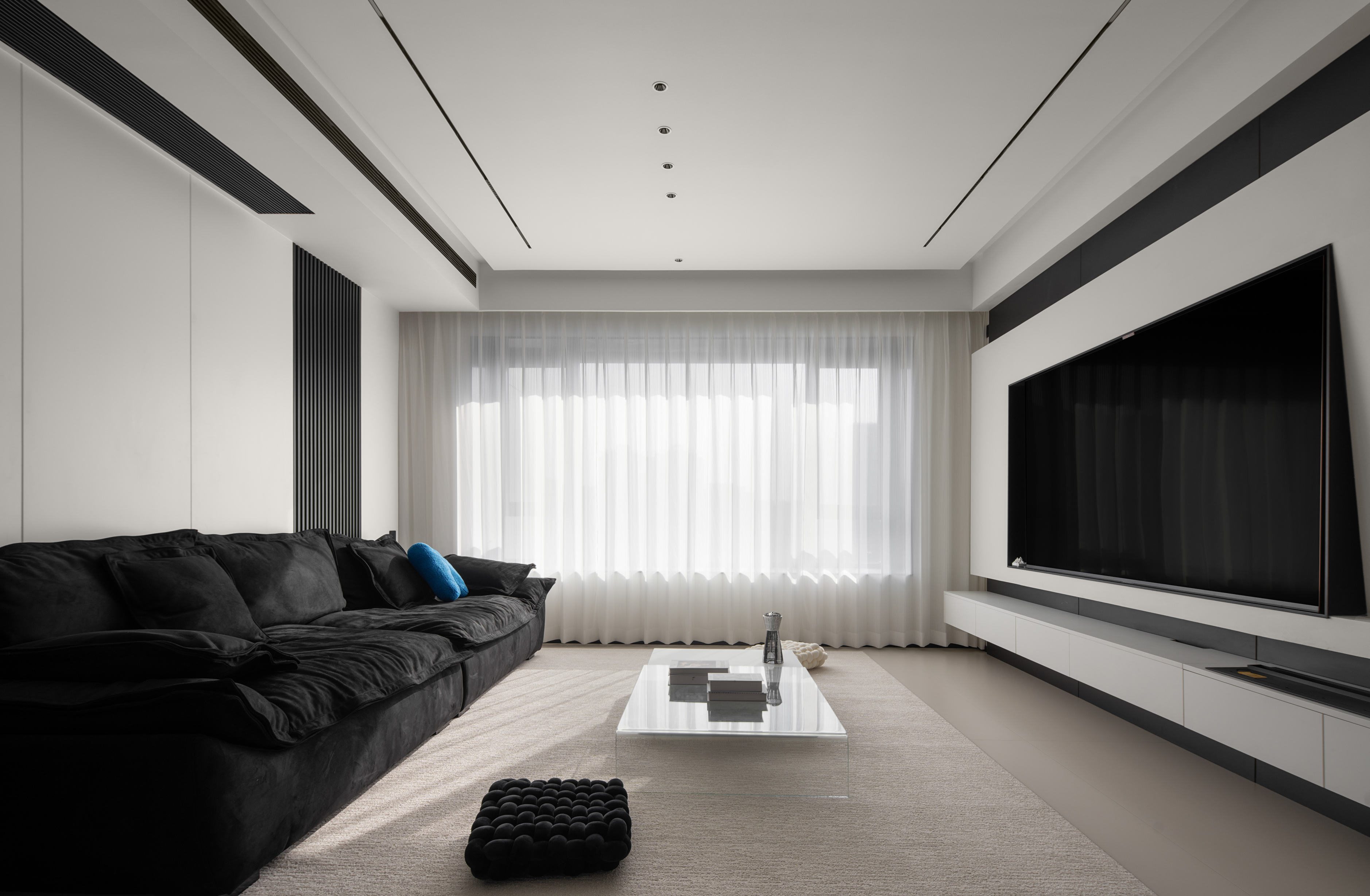 整体采用黑白调设计,黑色磨砂布材质沙发和透明茶几形成鲜明对比,极富现代工艺的美感和造型为家带来更多的年轻气息。电视背景墙以框型做出简明造型,分区明确,简洁耐看。