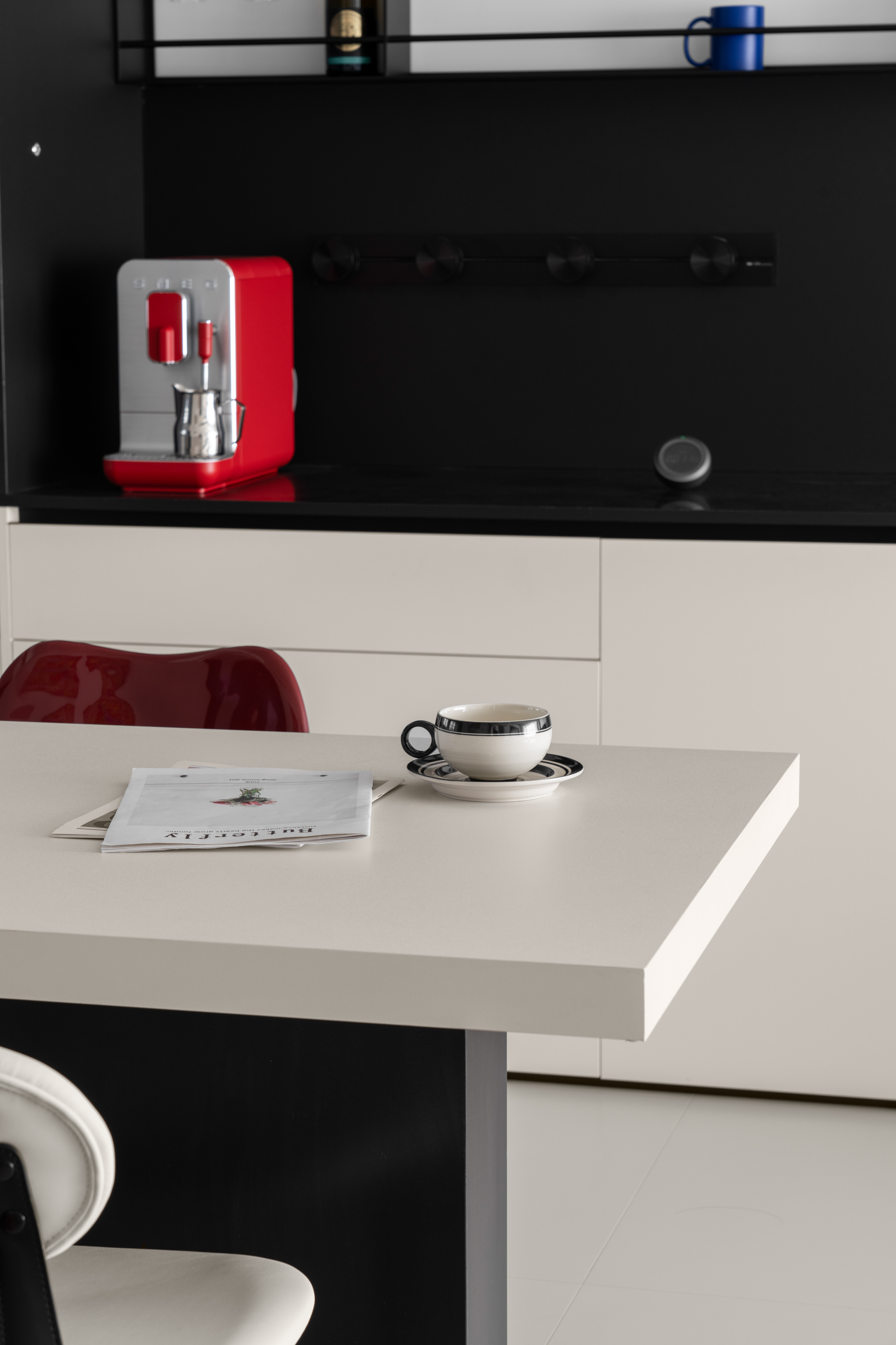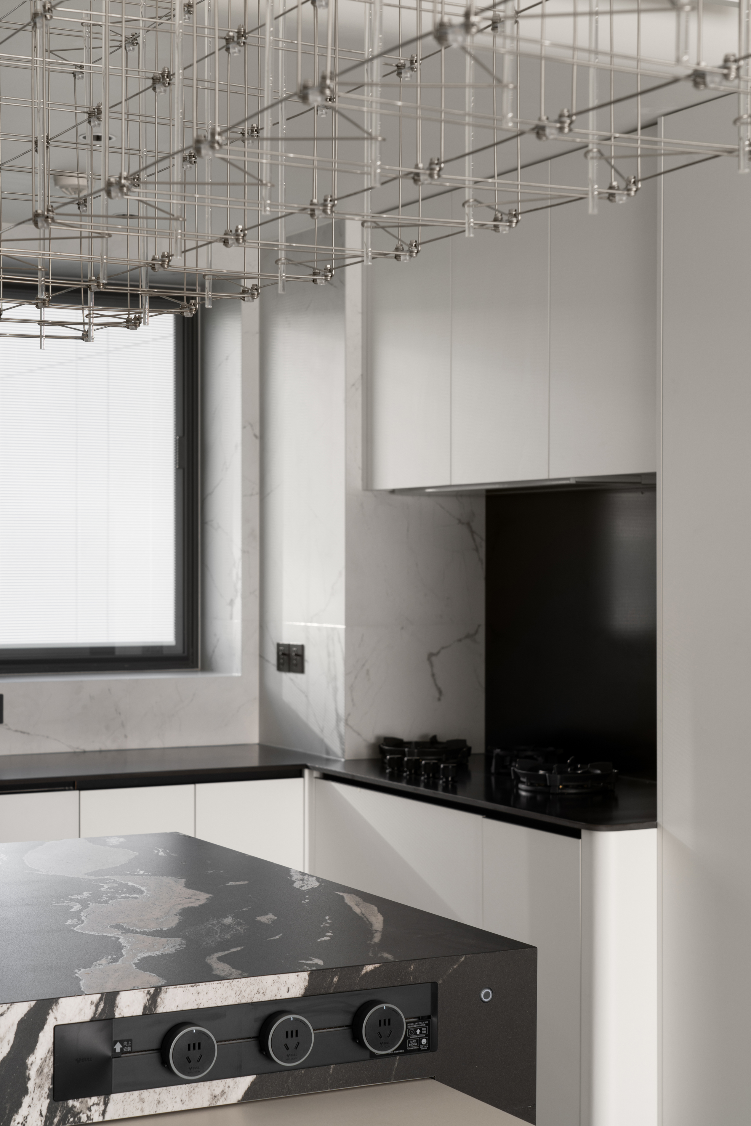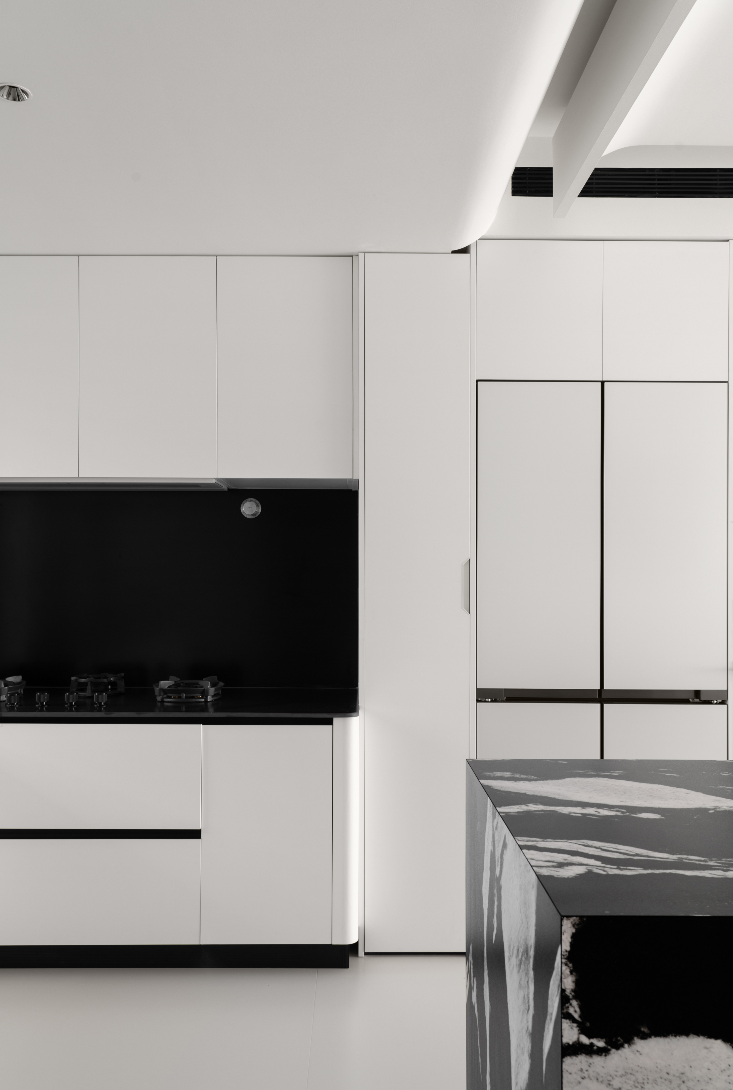 L型布局厨房将烹饪区、操作台清晰分割,嵌入式冰箱严丝合缝,强调极简美感。灶台上方置入升降烟机,不用时可以隐藏起来,简约方便。