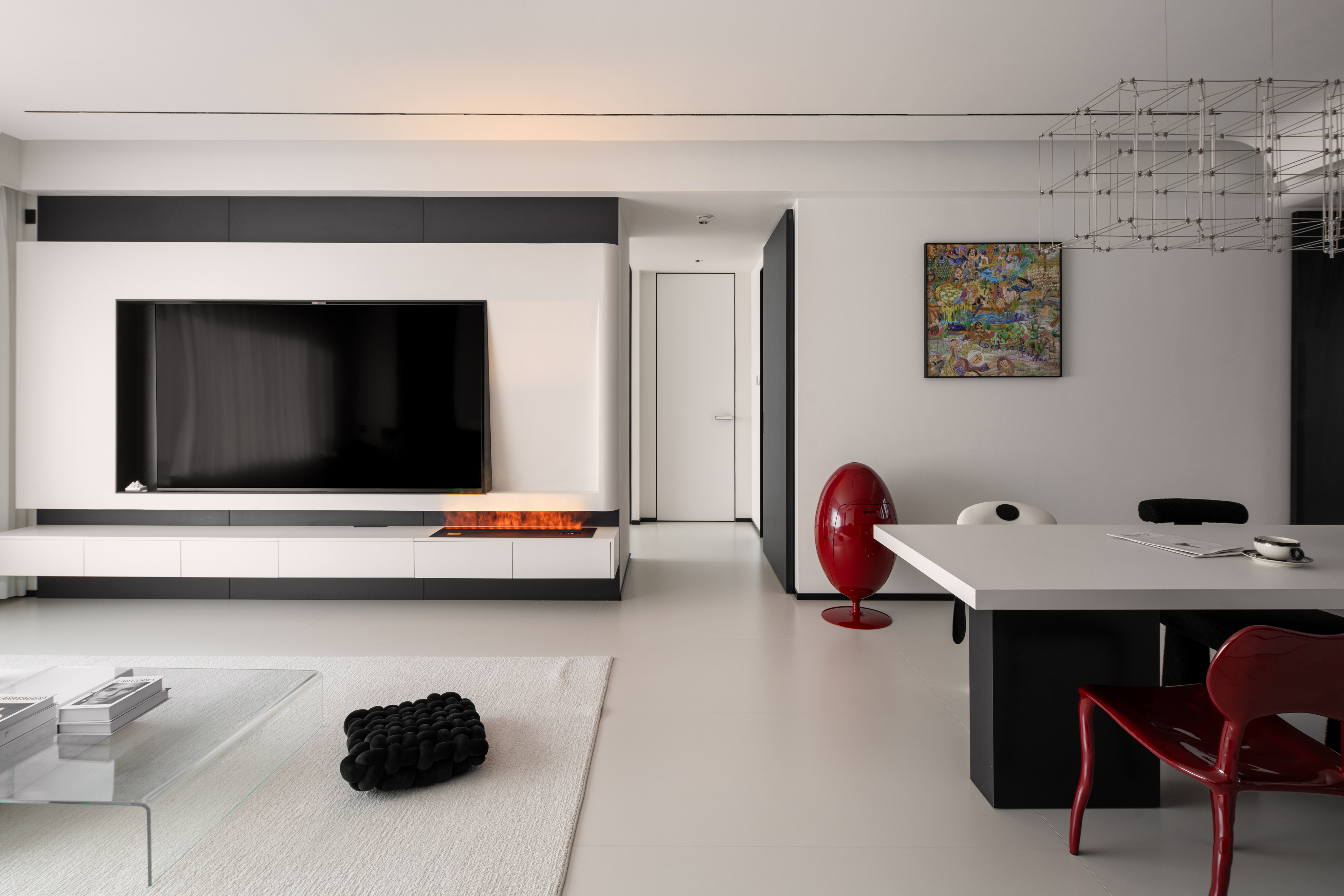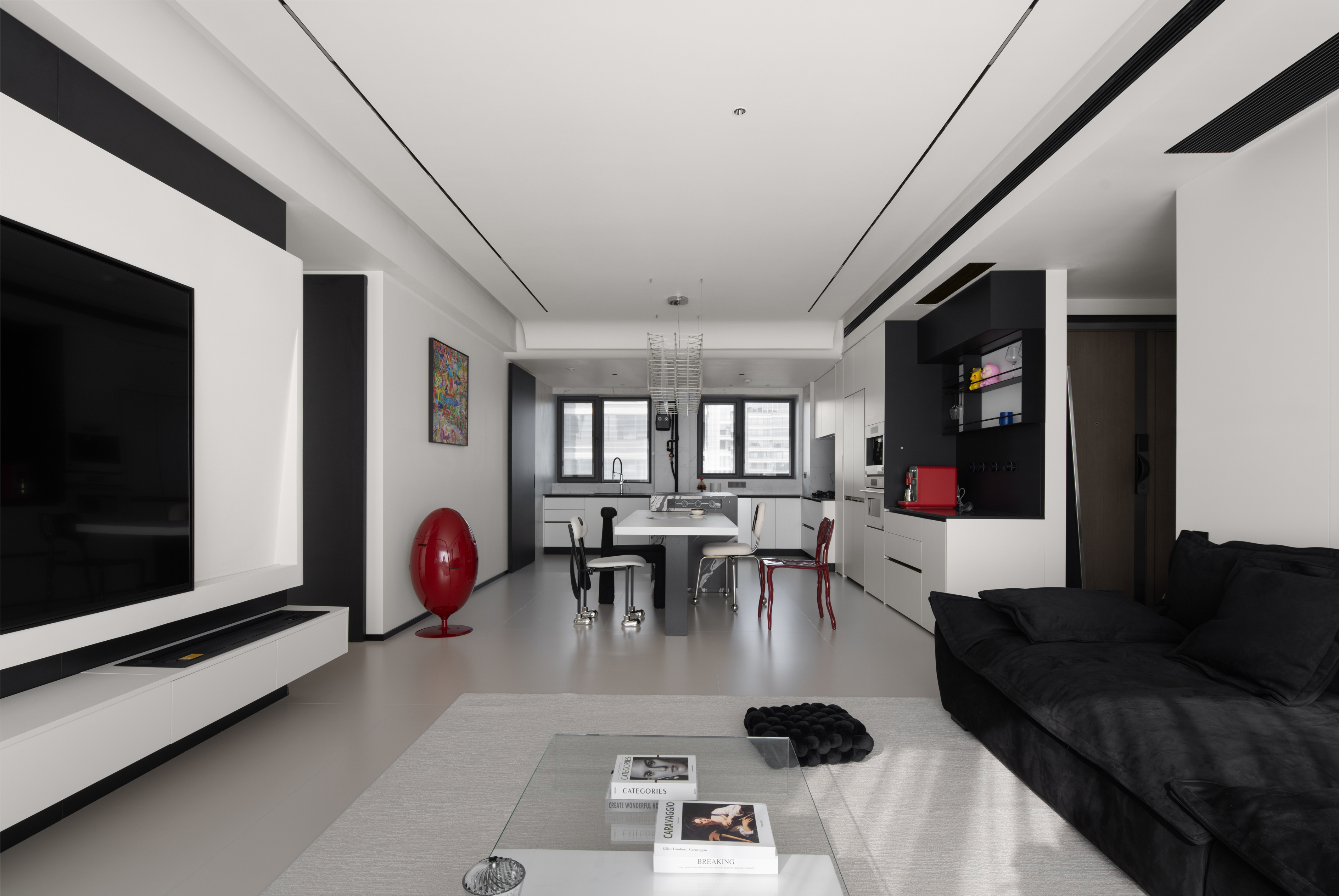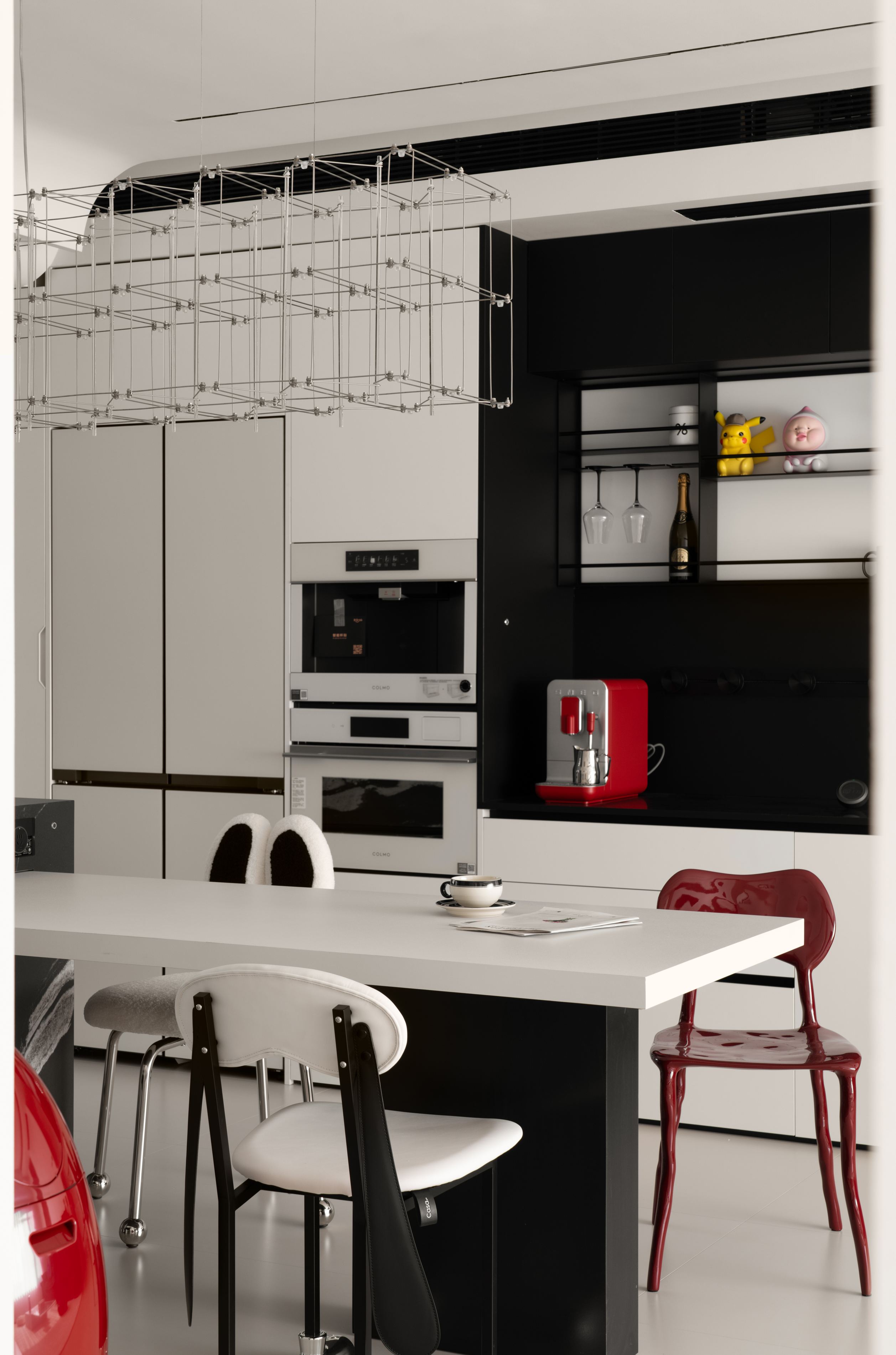 餐厅选用四把造型各异的椅子,单纯的黑白色调难免单调,因此设计师加入了少量高饱和红色作为点缀,让空间有了“点睛之笔”。极简的硬装,多变的软装,让空间形成一种恰到好处的平衡。