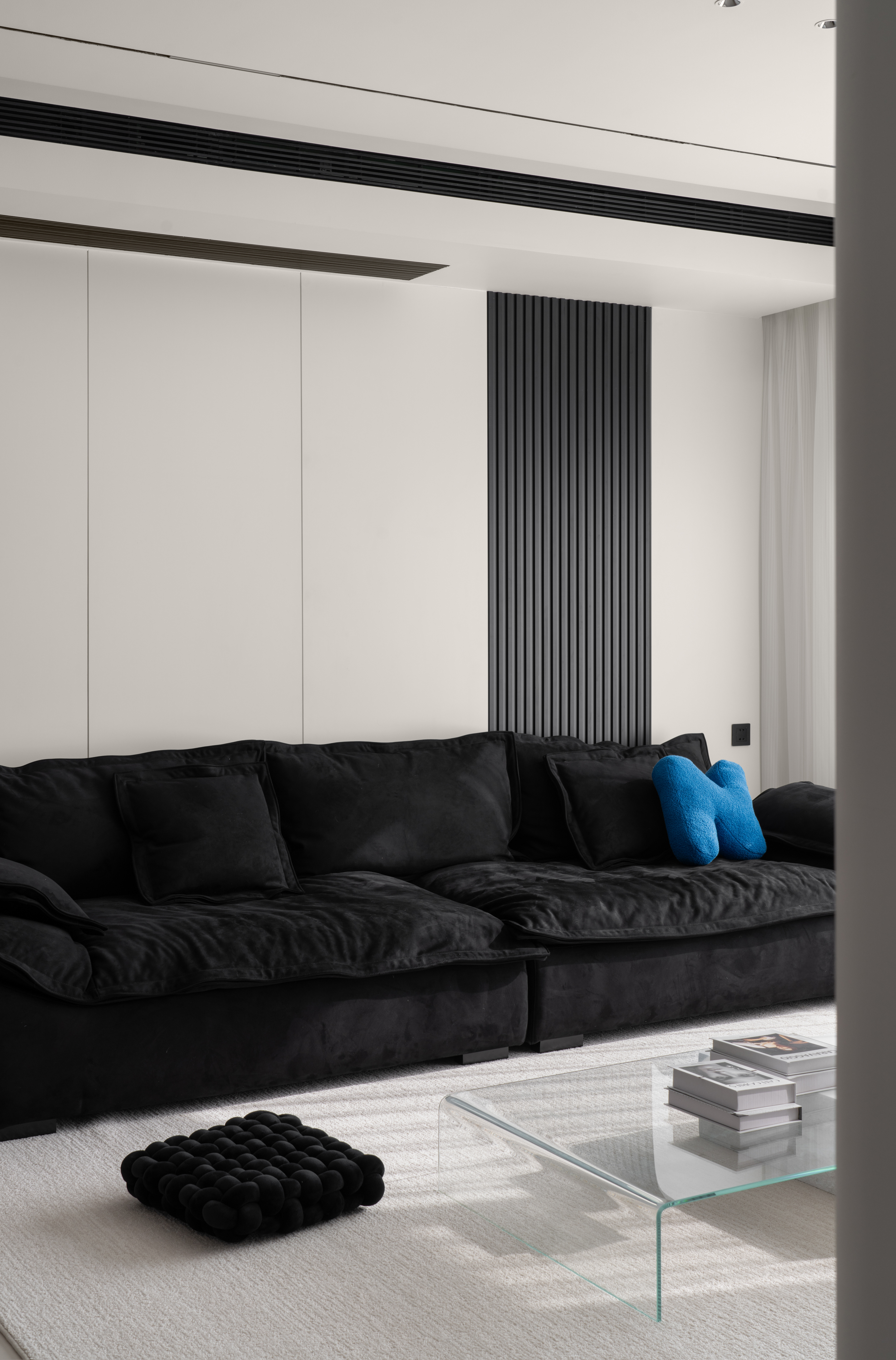沙发背景墙用护墙板和格栅板拼接而成,小面积的黑色让空间更为精致,形成呼应;大面积的白色则显得更为通透有呼吸感。
