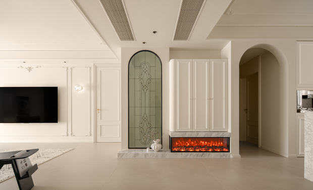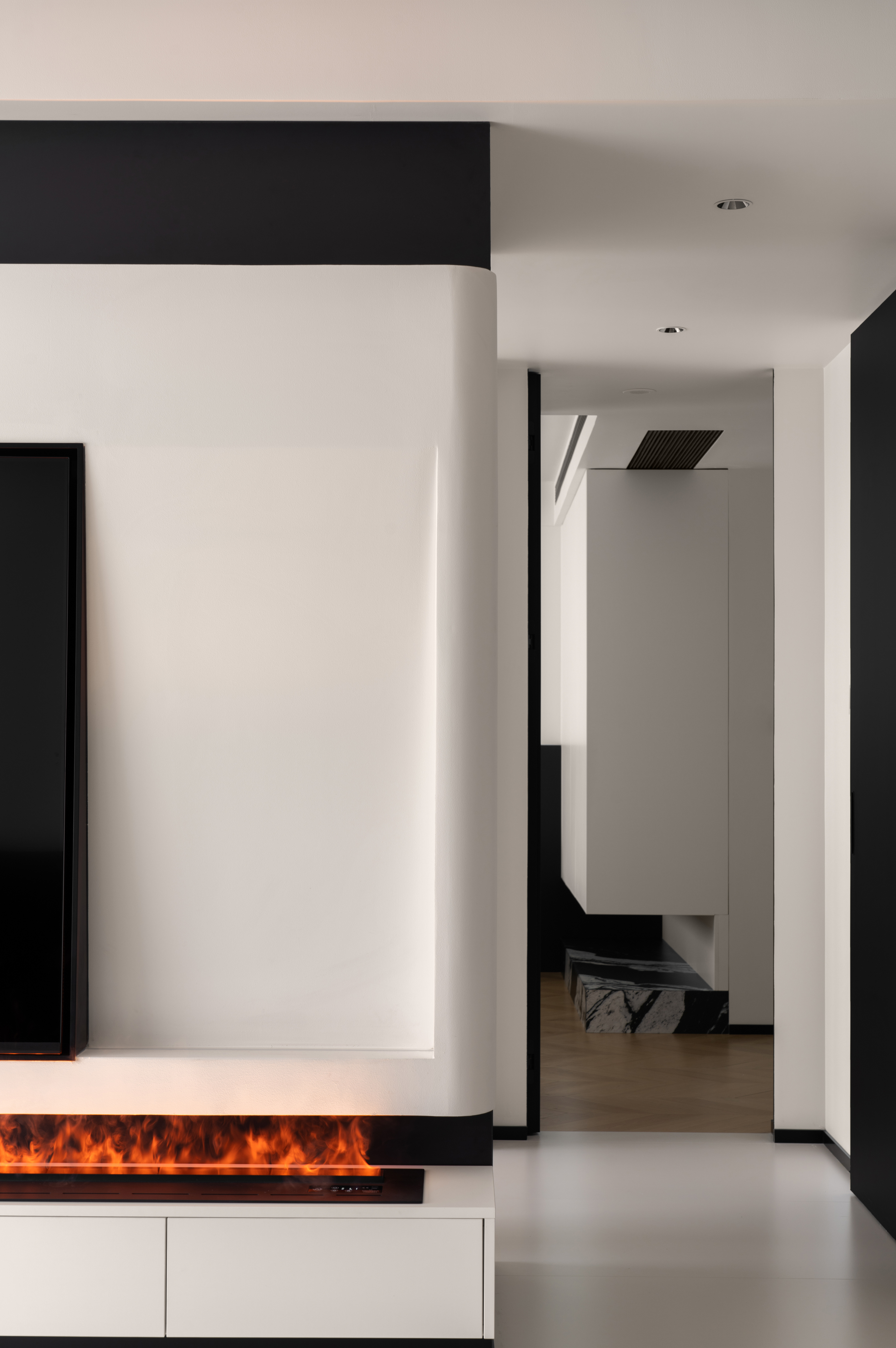 电视背景墙在侧边做了小角度倾斜,视觉上形成“卷轴”的感觉。悬空抽屉设计,再搭配壁炉,为空间增添更丰富的视觉体验。