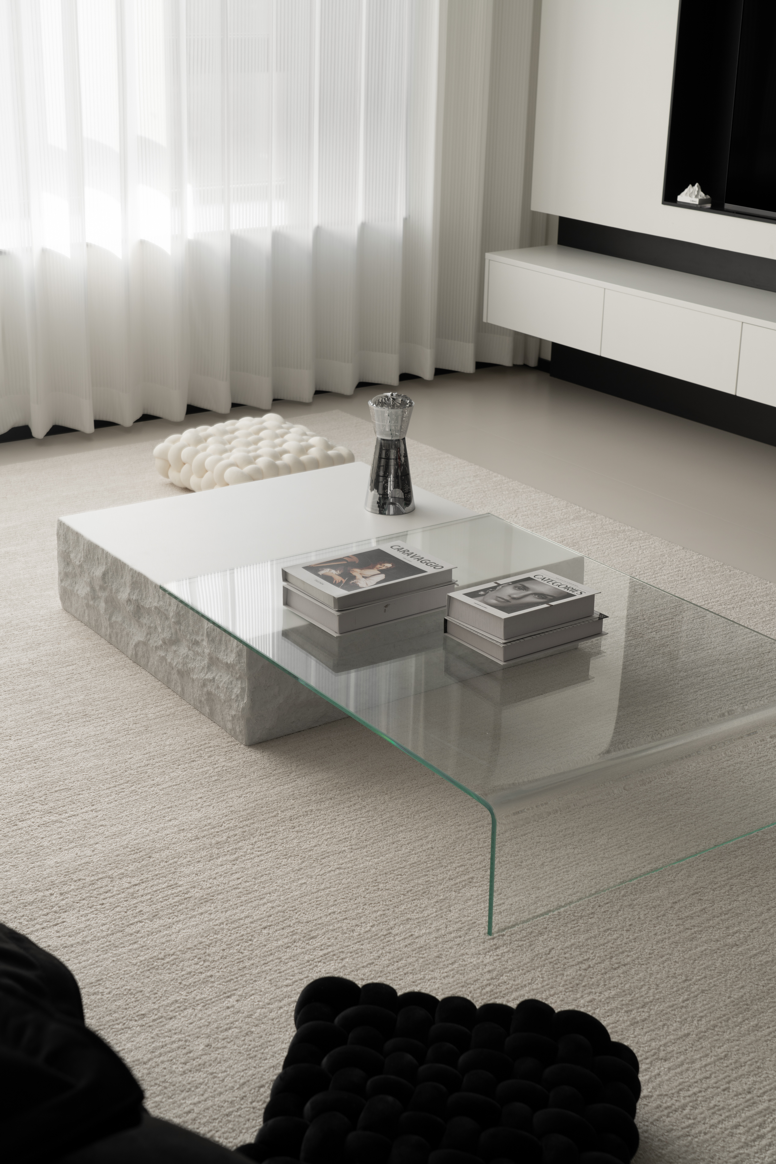 茶几选用石材和超白玻璃拼接而成的款式,简洁的线条,现代化的造型,特殊的材质,让“简单”中透露出“不简单”的独特品味。