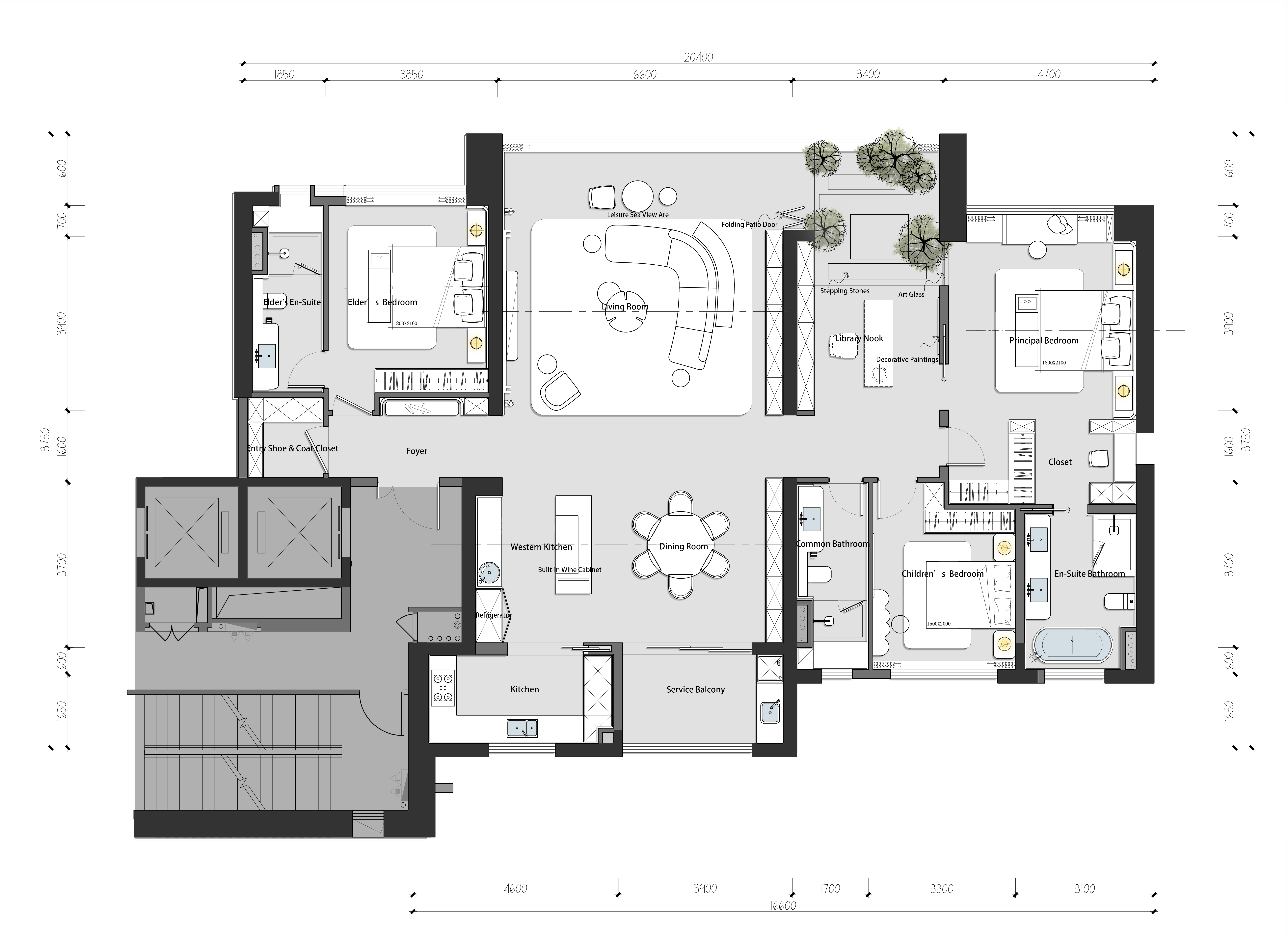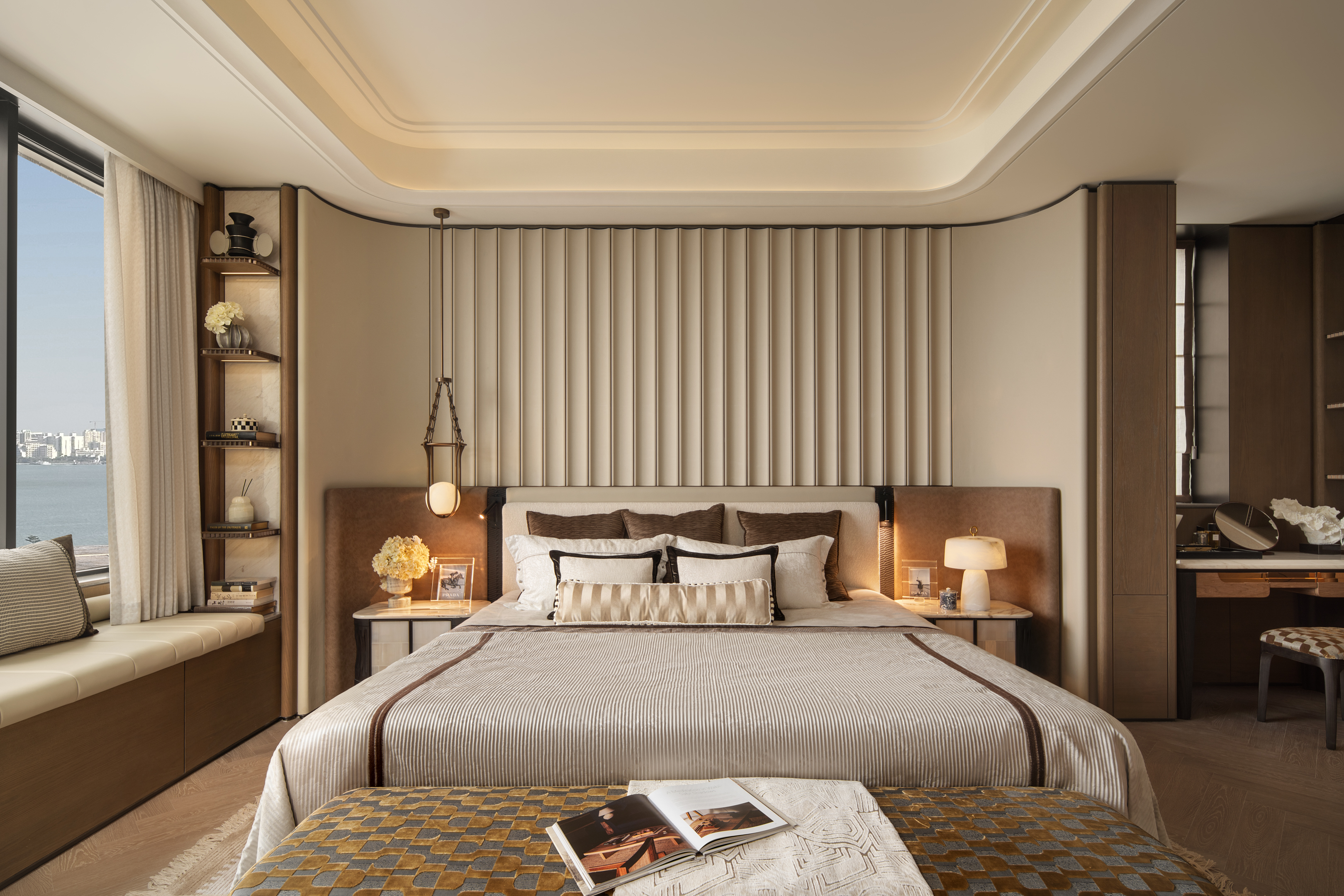 空间布局:客厅“海景向心式”布局搭配落地窗,实现沉浸式观海体验;餐厨一体以岛台衔接,兼顾互动与美学;多功能房“一室多能”提升空间弹性;儿童房飘窗台与定制家具相融,达成功能与美学共生;书房洄游动线,契合“漫游式场景”理念。