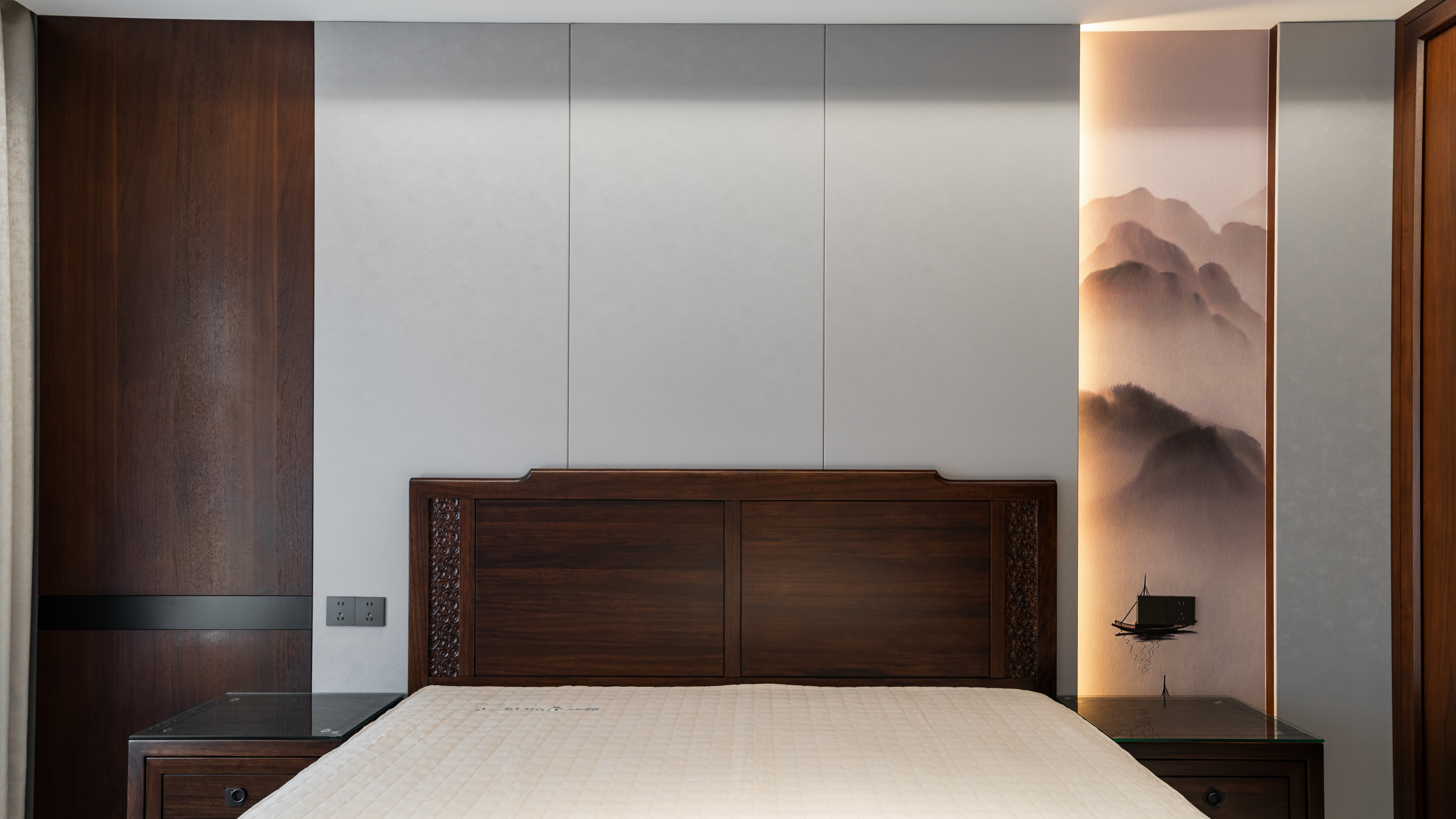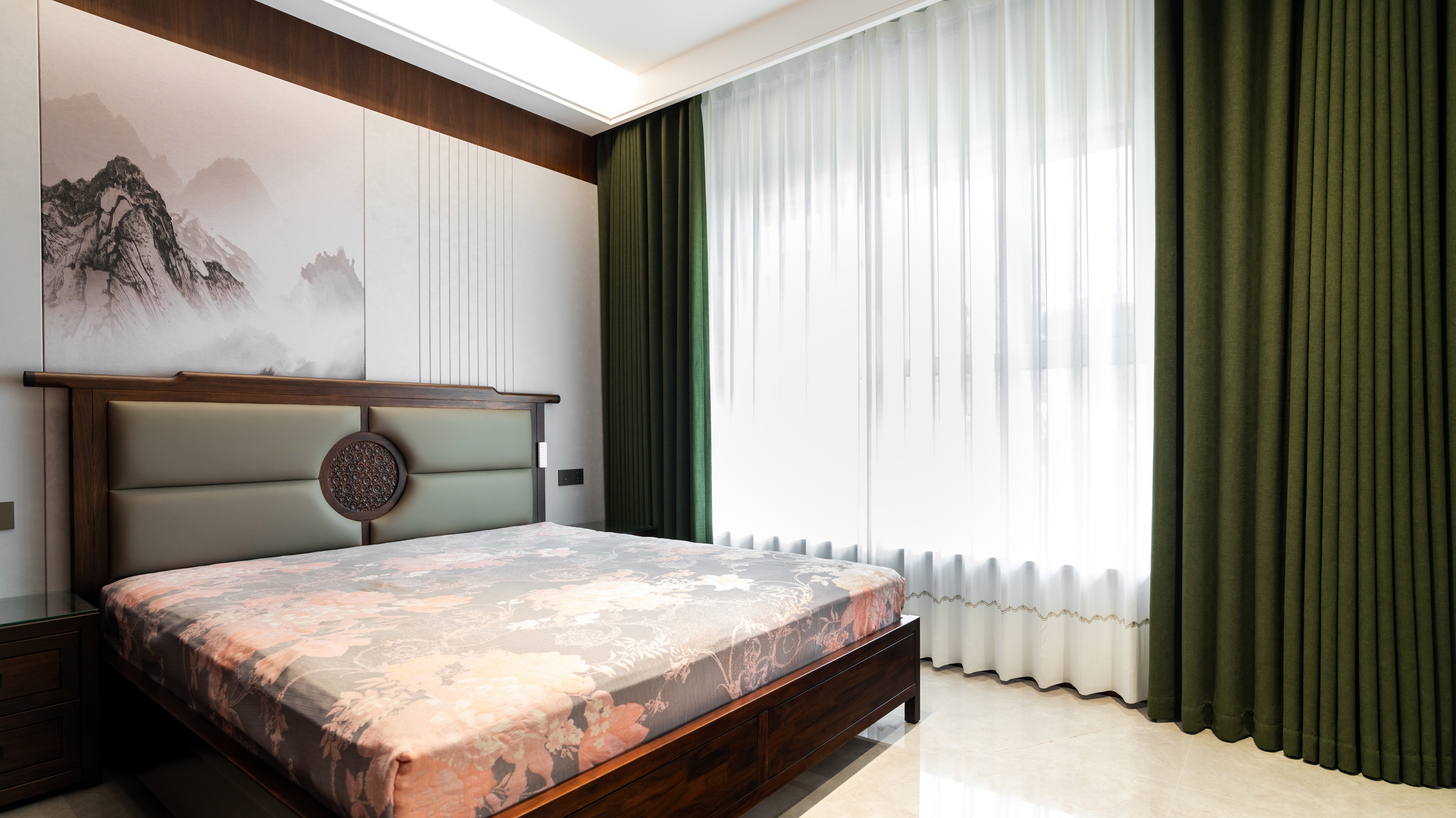 设计选材:空间材料主要以实木饰面,乳胶漆以及皮革,让空间的触感更加真实。