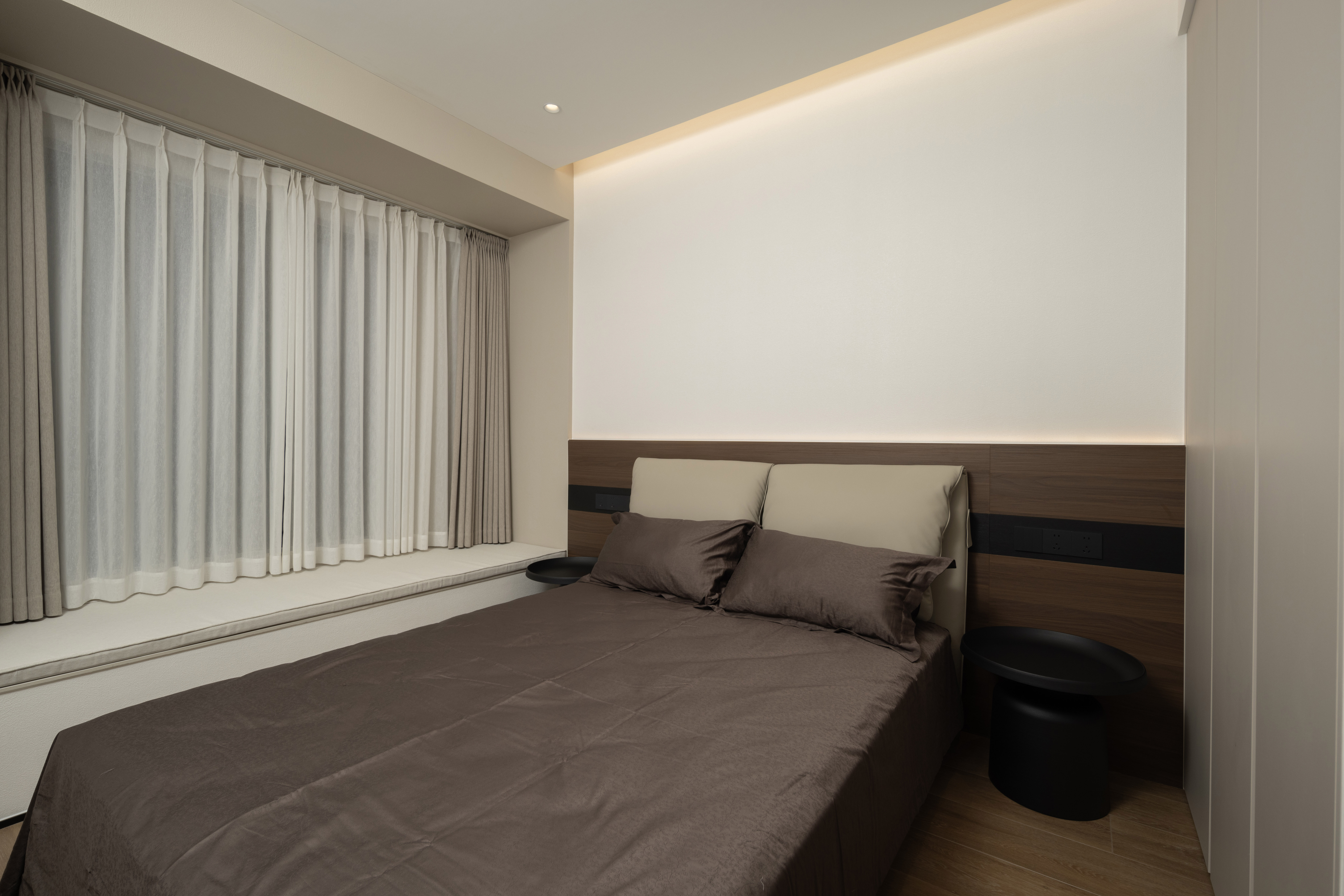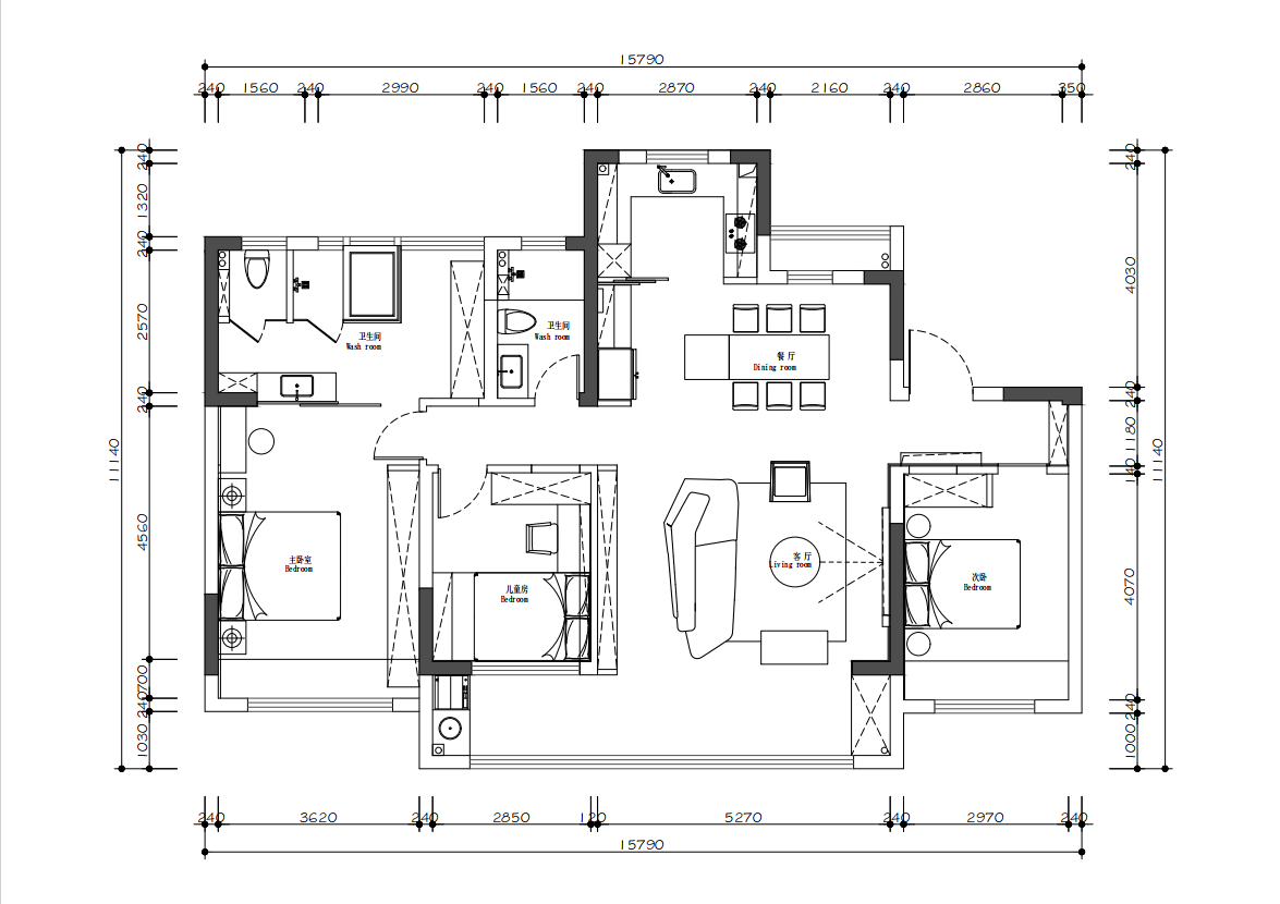 空间布局:①儿童房采用地台床布局,合理利用过道空间和床尾空间做了书桌和书柜。②主卧与北边房间,卫生间打通做套房。北边做了开阔明亮的四分离卫生间和衣帽间。
