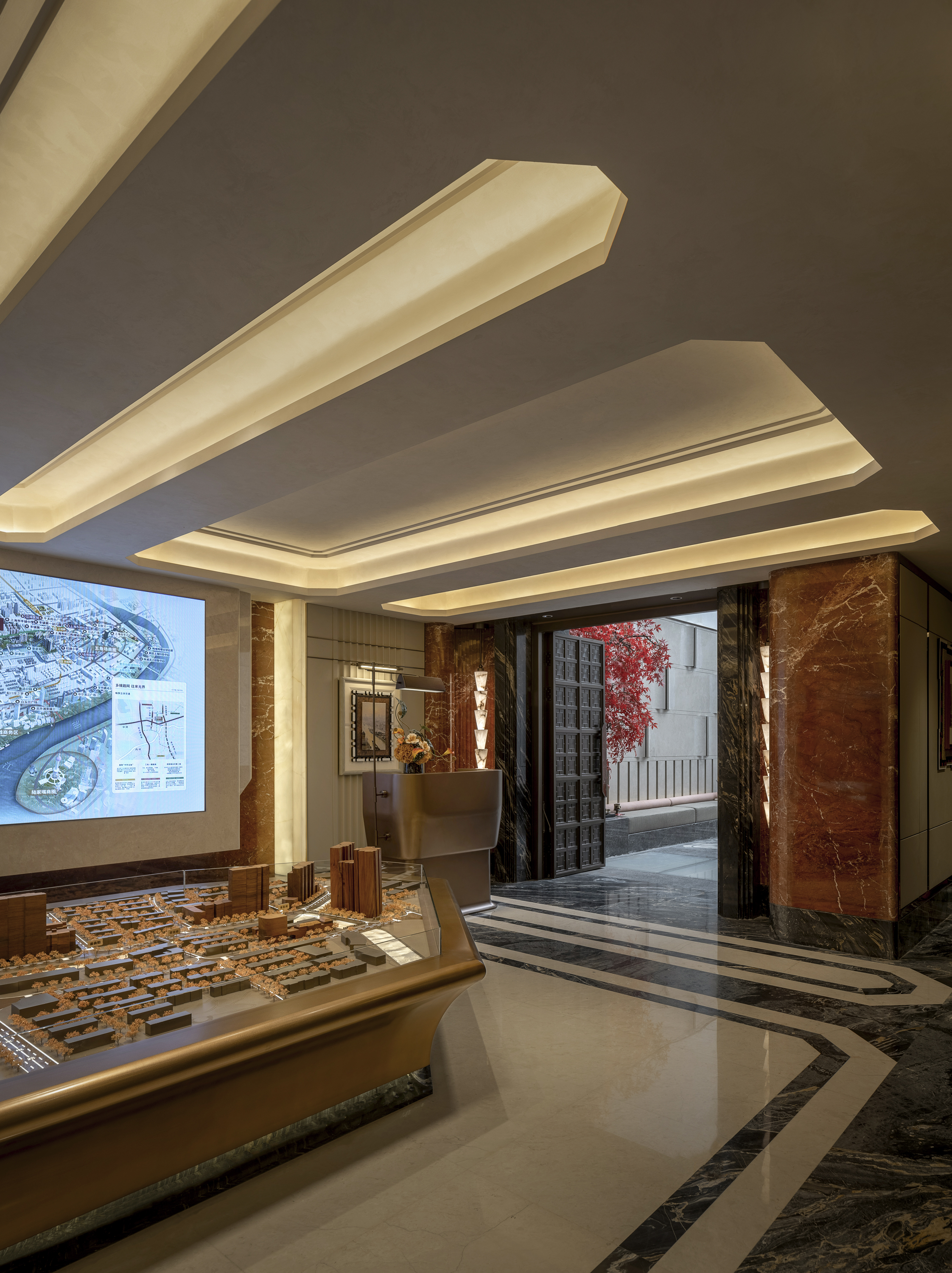 空间布局:万安映邸的空间布局创新,在于以“上海折叠”为理念,打破传统售楼处单一流线。它并非功能分区,而是将城市意象解构重组:沙盘区如都市广场,居于核心;庭院、阳台与露营区则如城市公园、私享露台与都市营地,环绕并渗透其中,形成“内景外透”的流动剧场。访客穿行其间,体验从宏大规划到私密栖居的无界转换,每一步都是对“浓缩上海”的沉浸式阅读,实现了从“观看模型”到“走入场景”的根本性颠覆。