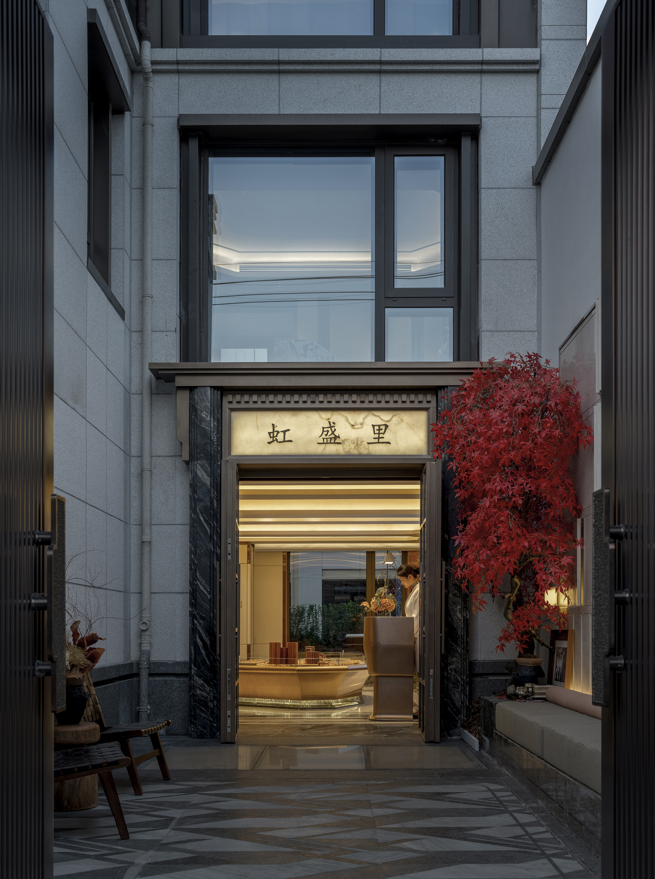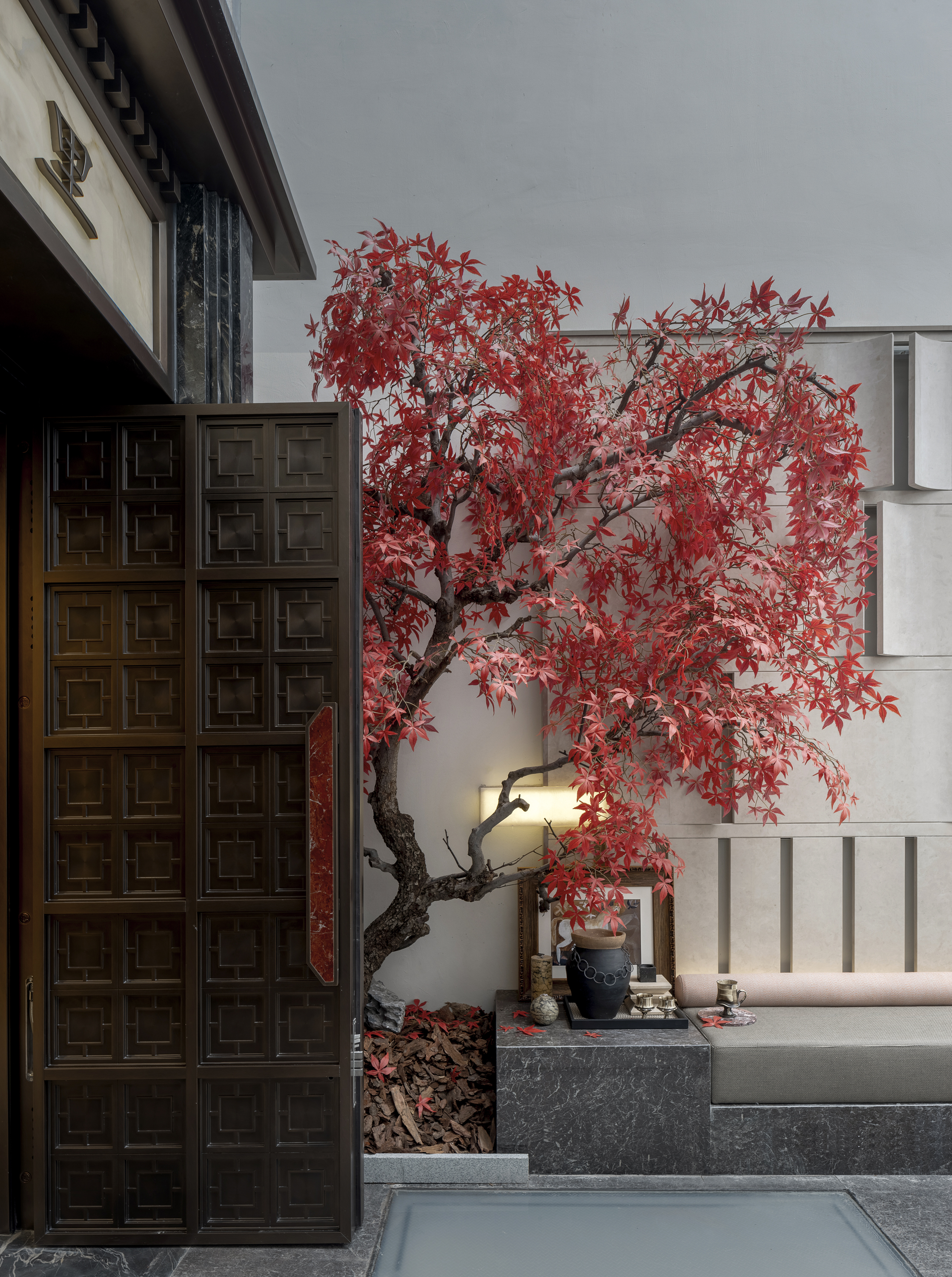 创新点:它可能并非传统中式园林,而是一个 “上海意象庭院”。地面铺装或许映射着黄浦江的流线,绿植选用梧桐与苔藓,搭配金属或玻璃的当代艺术装置,形成“摩登山水”。它不止是景观,更是一个承载城市记忆与未来想象的 “在地性艺术装置”。