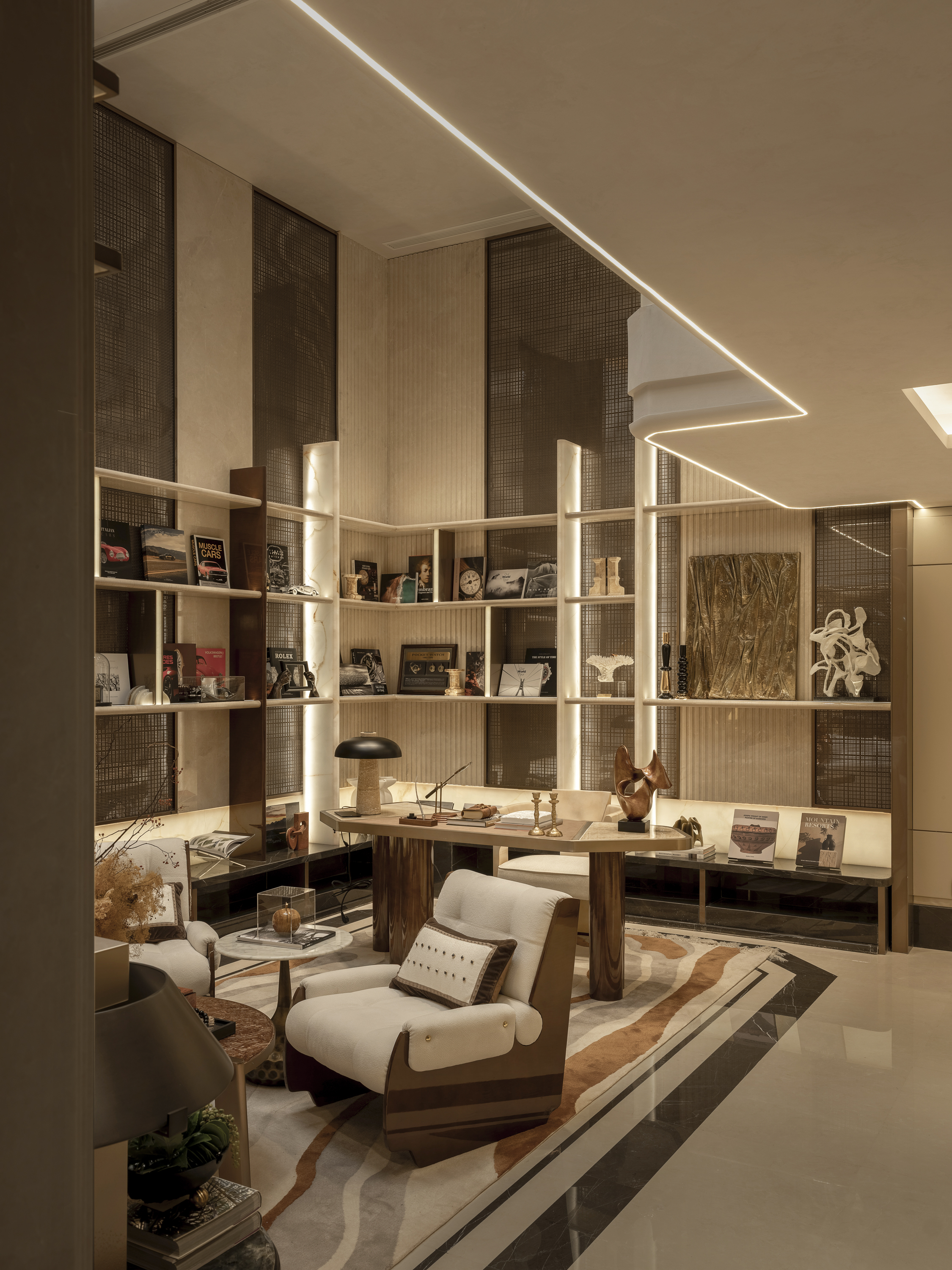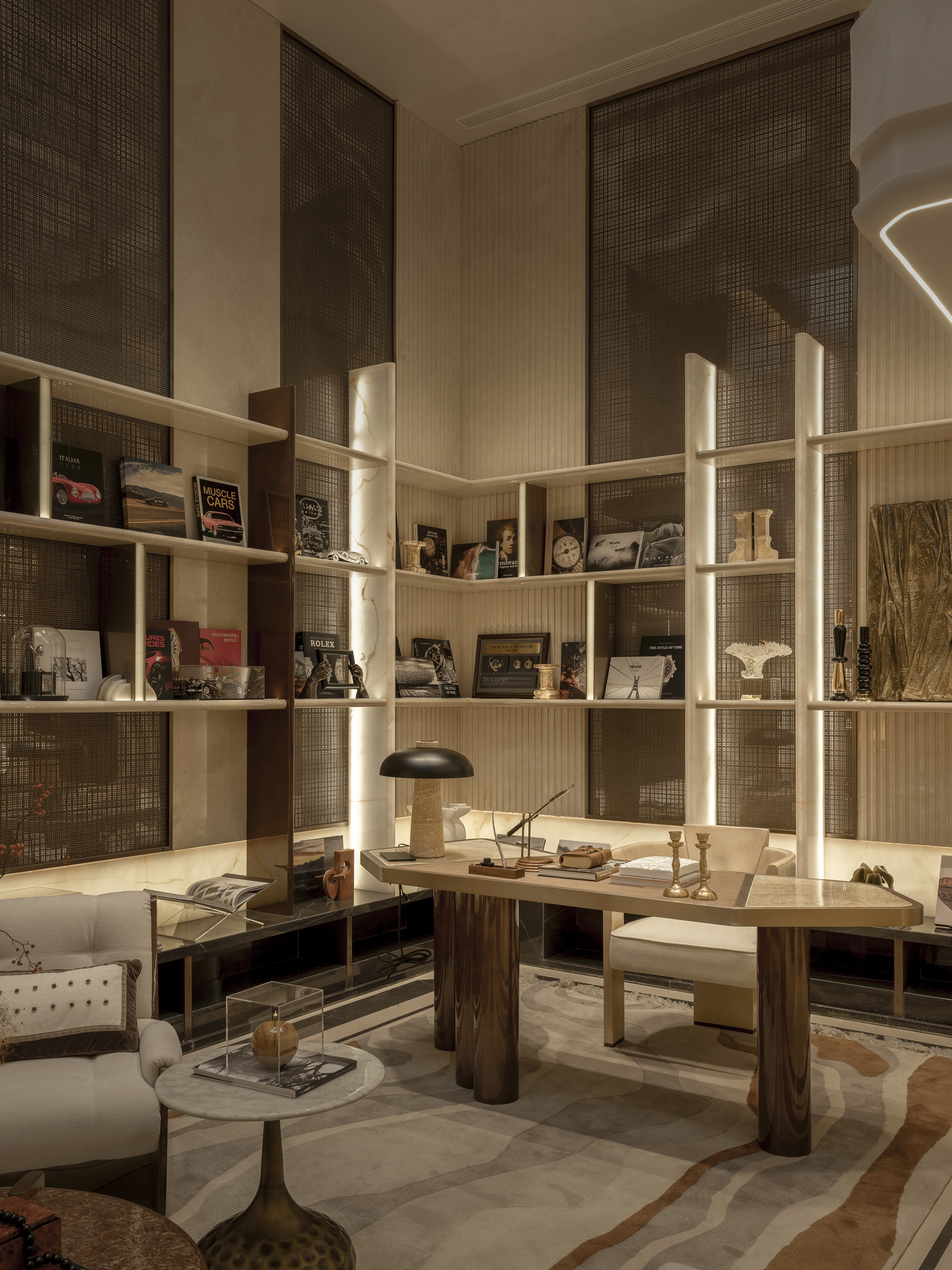 创新点:在极度精致的售楼处内植入露营区,制造了 “ curated wilderness(精心策划的野趣)” 的戏剧性反差。它用高级的材质(如夯土墙面、野奢装备)模拟自然粗犷感,实则极度精致。这呼应了上海精神中“在秩序中追求自由”的矛盾与浪漫,提供一种 “不出城郭而获山林之怡” 的当代解决方案。 -