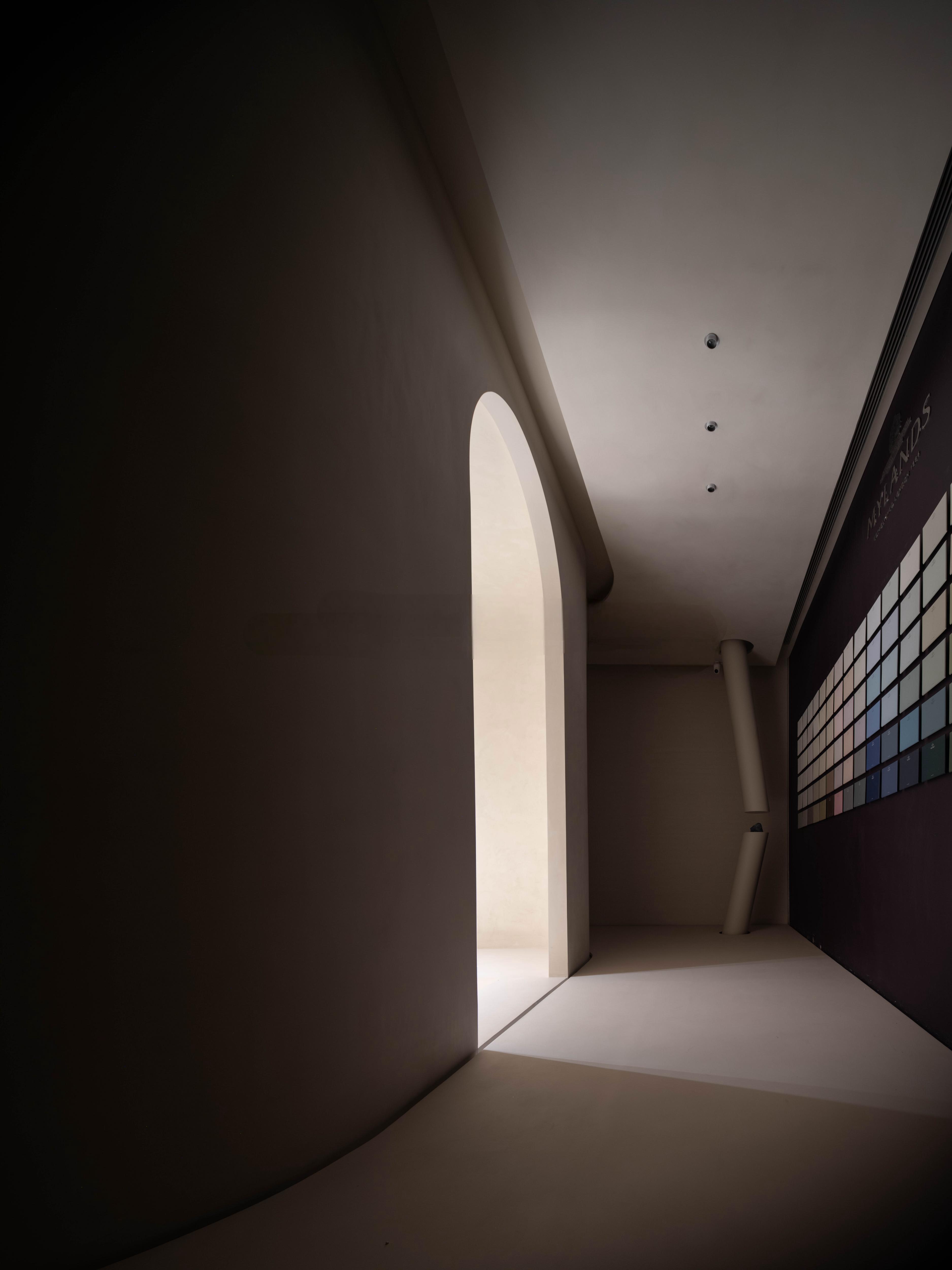 设计选材:展厅采用微水泥、微晶水泥、米兰丝绒等艺术涂料装点,纵横穿插的墙面和圆形天花以流动姿态展现时间与空间。展厅大堂的圆形彩色亚克力灯片宛如星辰点缀,灯光穿越彩色灯片轻轻抚摸墙面和地面,把空间幻化成梦幻的彩色宇宙。曲面墙体如艺术家的笔触在空中挥洒绚丽多彩的轨迹,每个空间都展示了不同的艺术涂料纹理,呈现出产品的多样性质感。