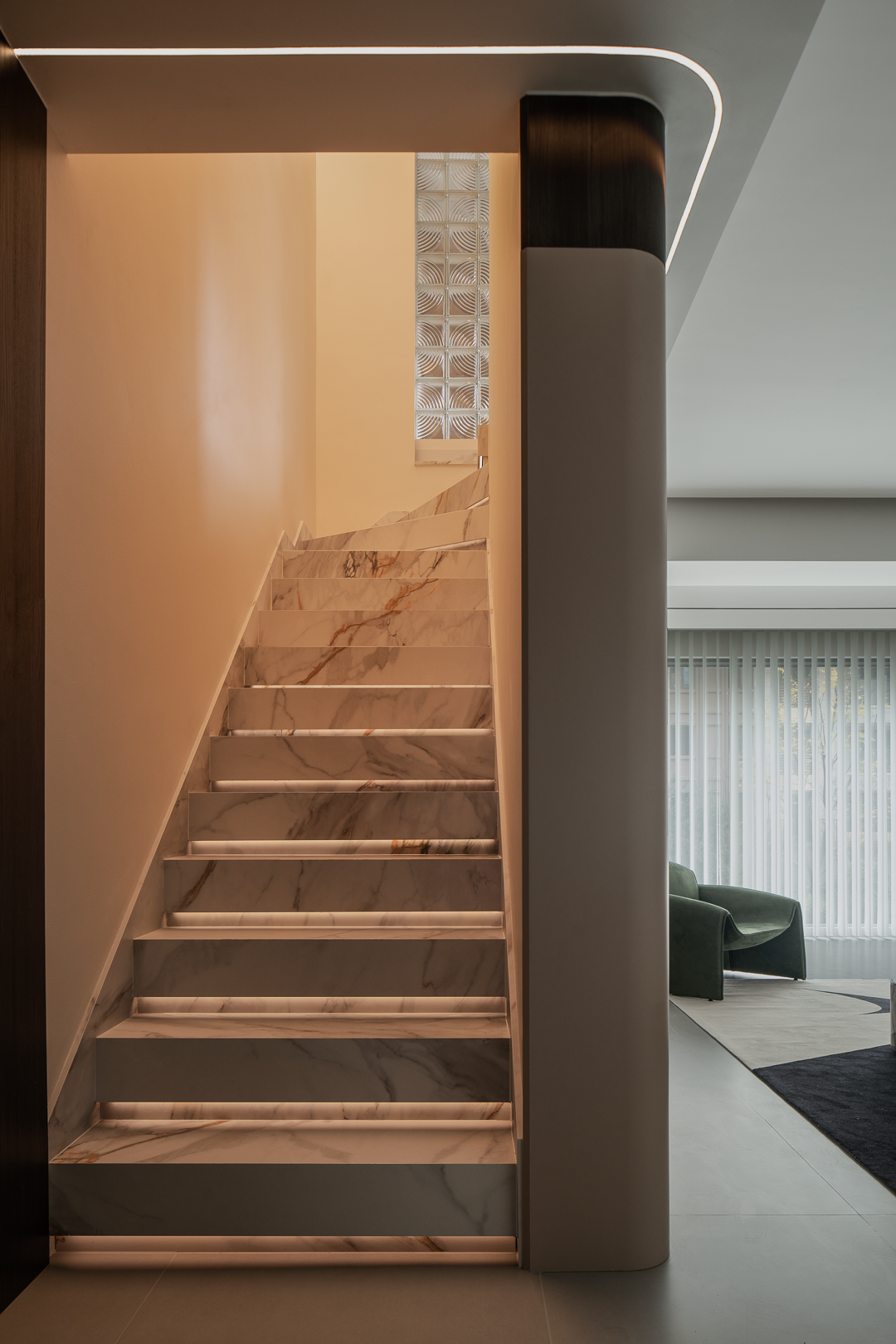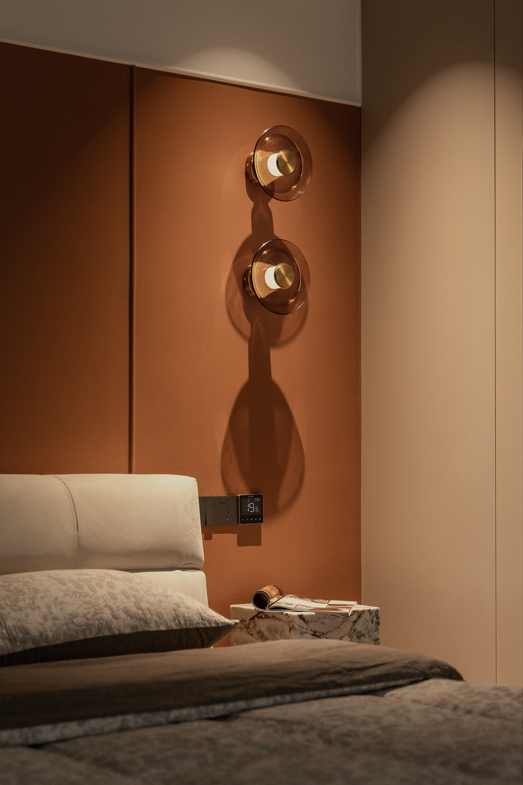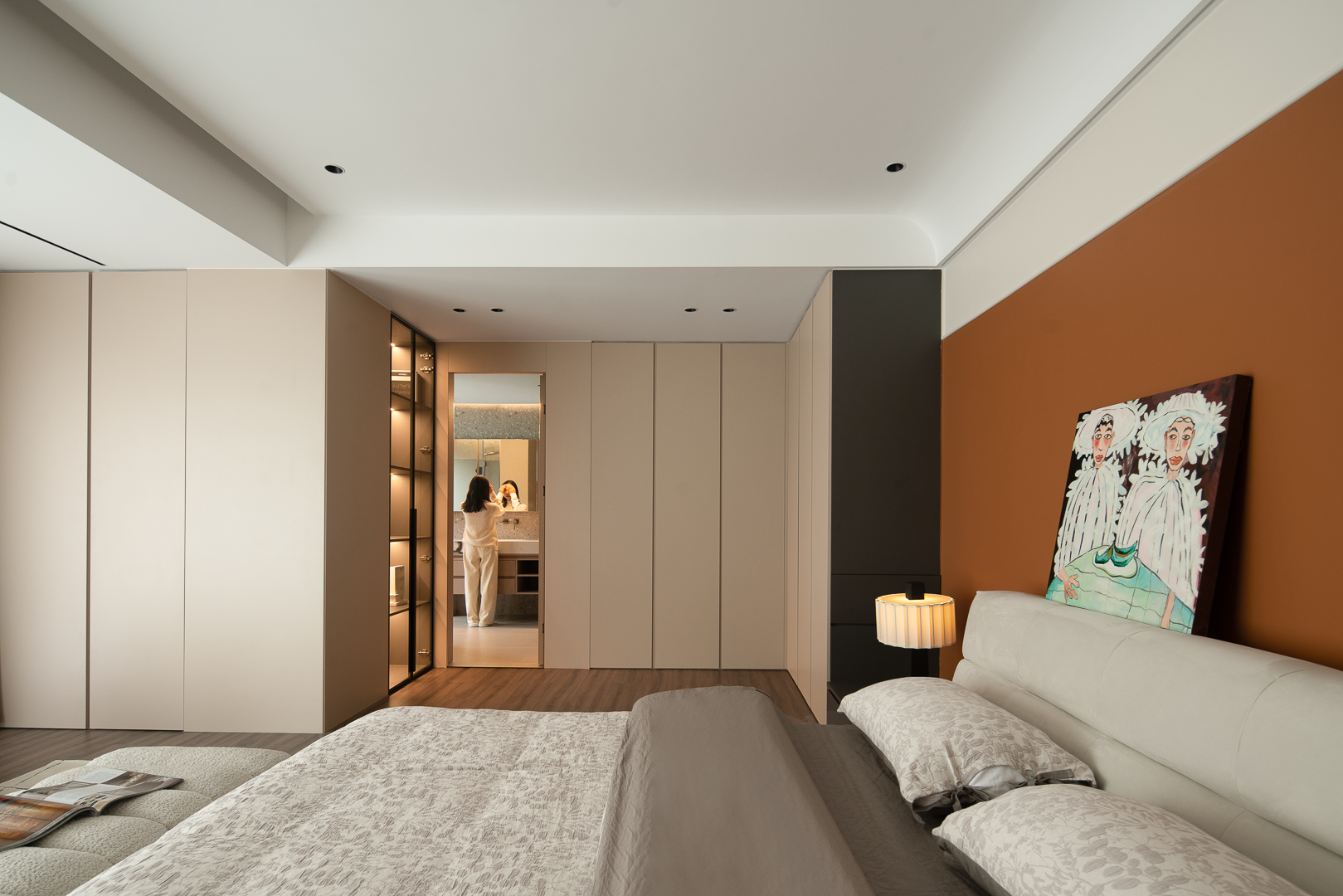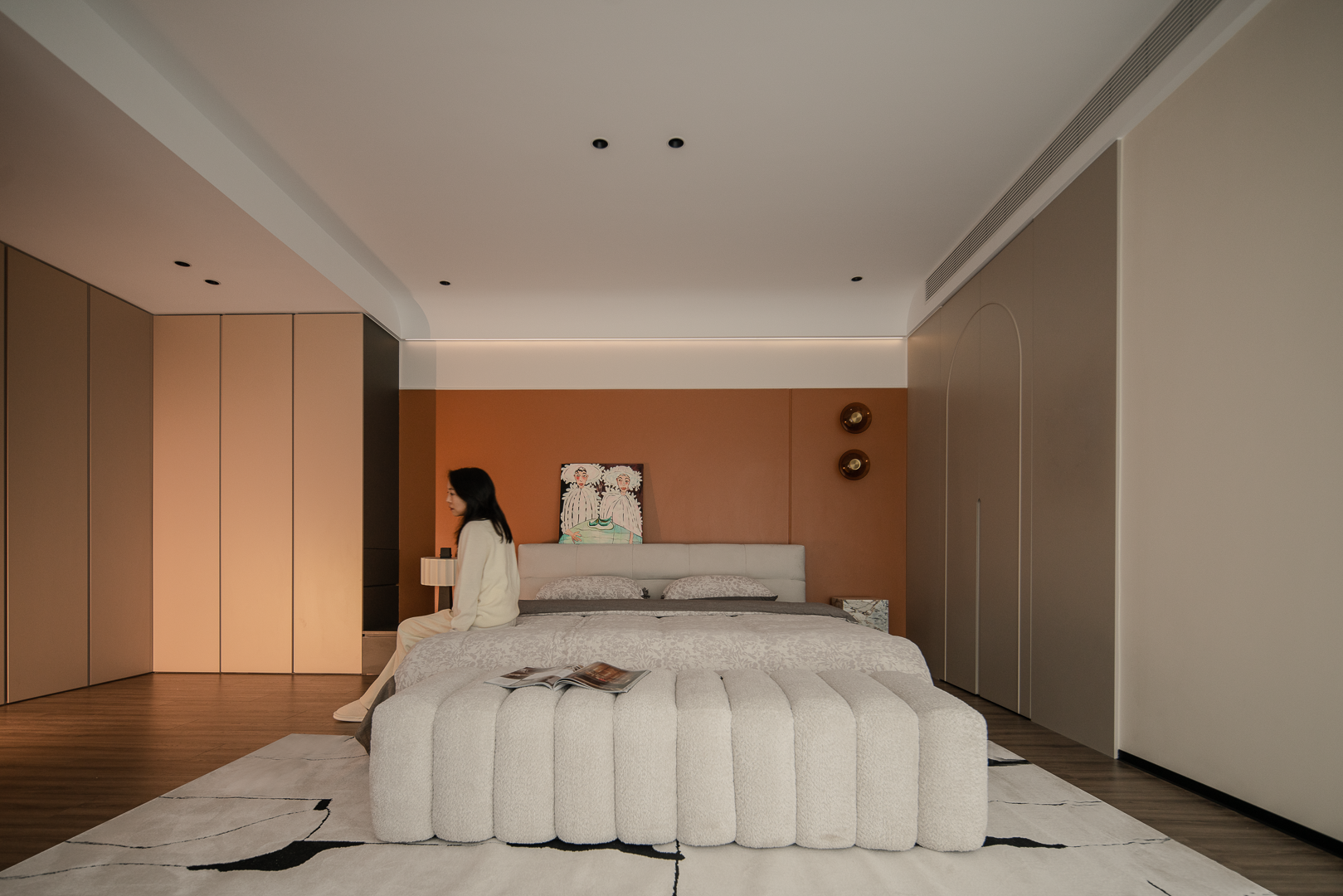 空间布局:整个户型是跃层复式的结构,结合业主自身的家庭结构,只保留3个常用起居室,2楼只保留1个起居室,女主人需要的独立衣帽间,空间开阔明亮,男主人需要的独立办公区域,互不影响休眠,业主比较偏爱柔和的元素,在造型的运用上面,我们从门板造型以及柜体设计上面,增添了弧形的造型,让整个空间更加圆润柔和,打造出现代温馨舒适的氛围感;空间色彩上面,业主喜欢鲜艳明亮的颜色;我们面积运用大地色米咖做主基调,用橙色做空间点缀色,提亮了整个空间的色彩层次,也让整个空间充满朝气和活力。