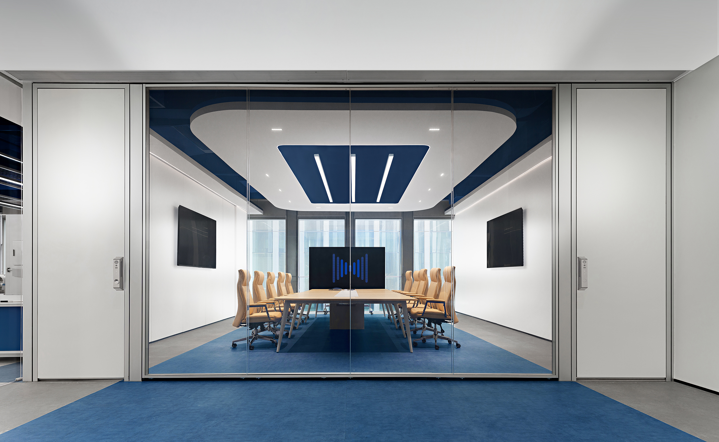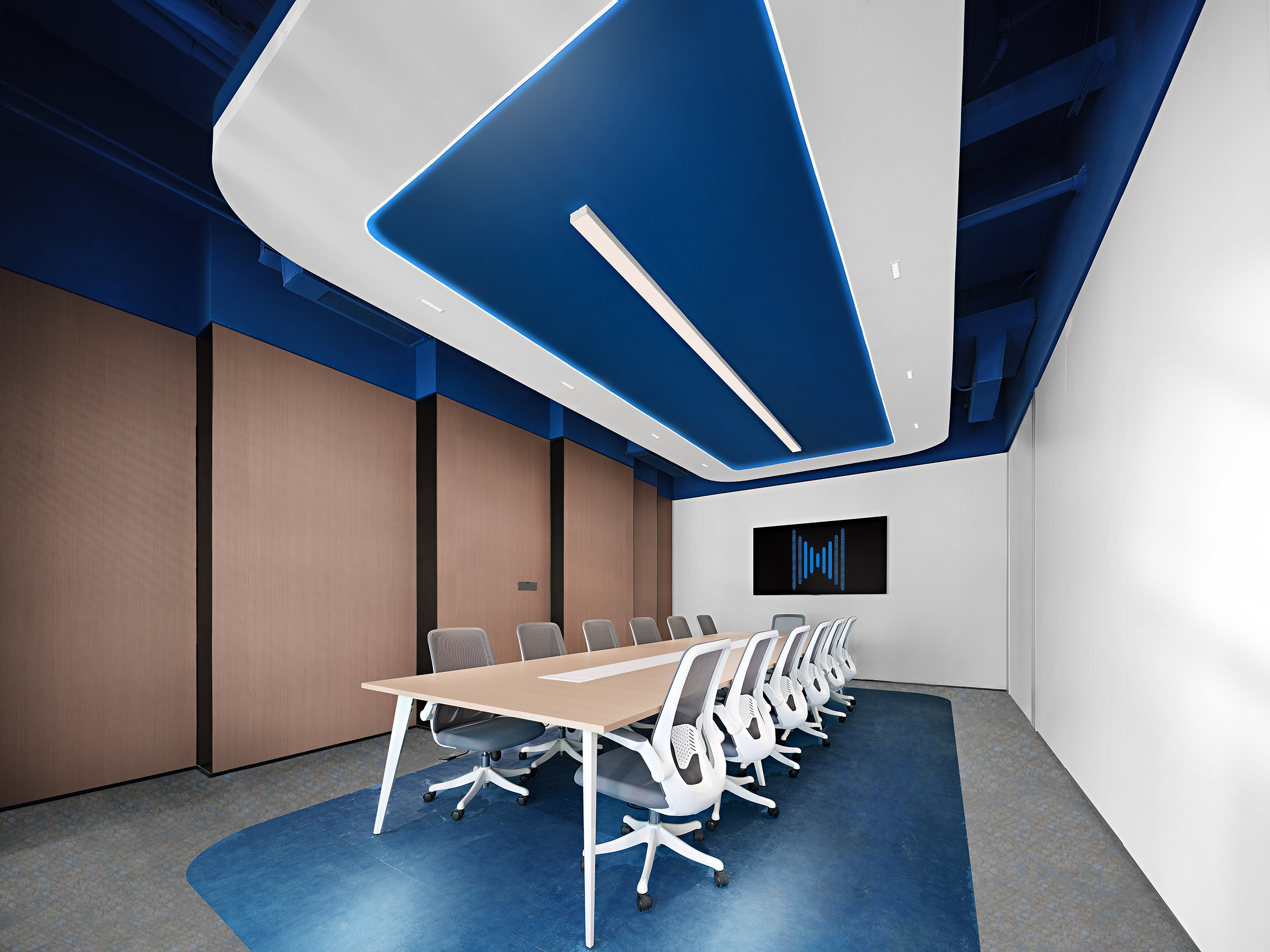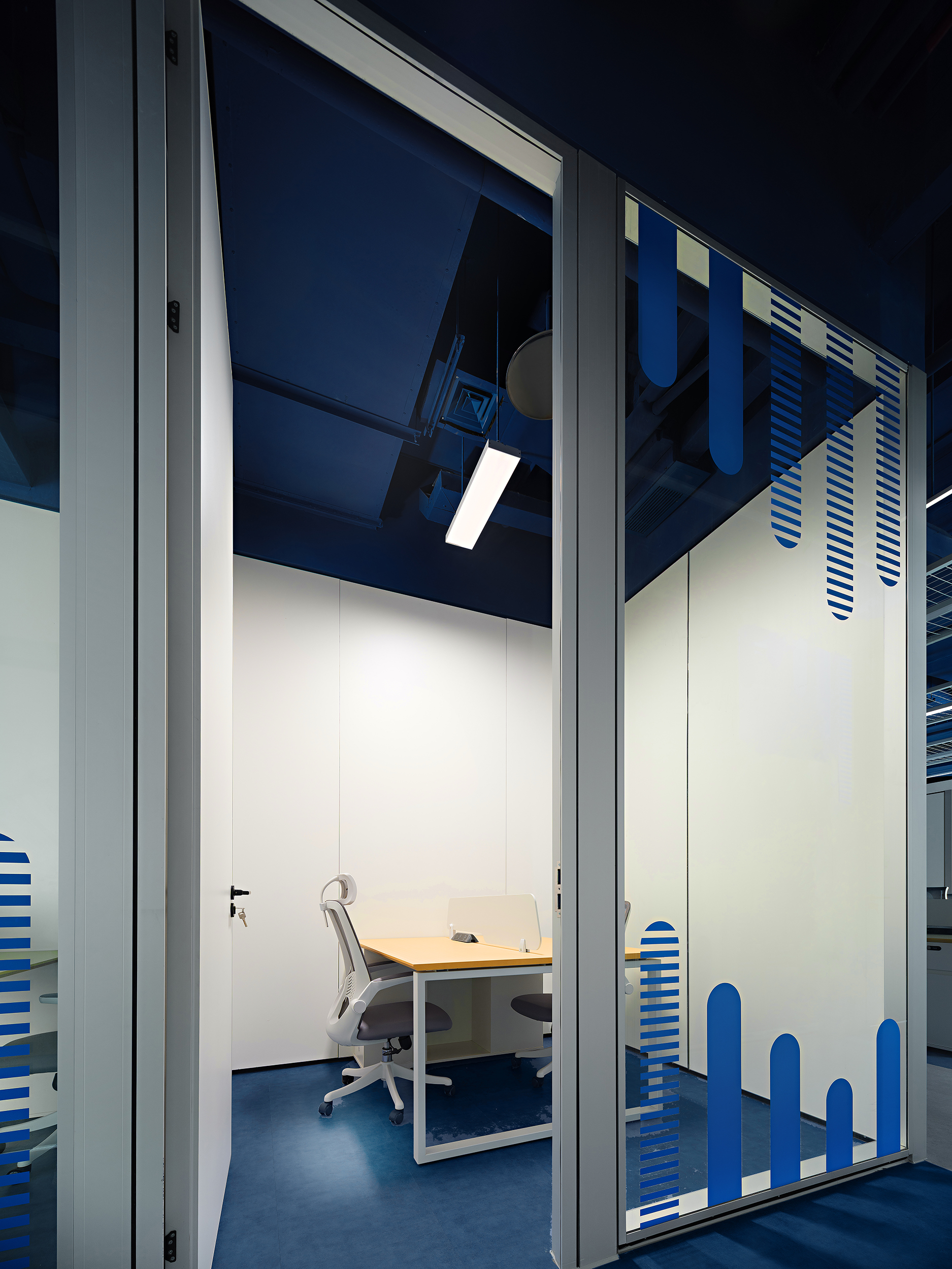 空间意境:简约工业风+科技感细节,裸露管线喷蓝漆,结合发光玻璃隔断,呼应生物科技行业的前沿性与务实特质
