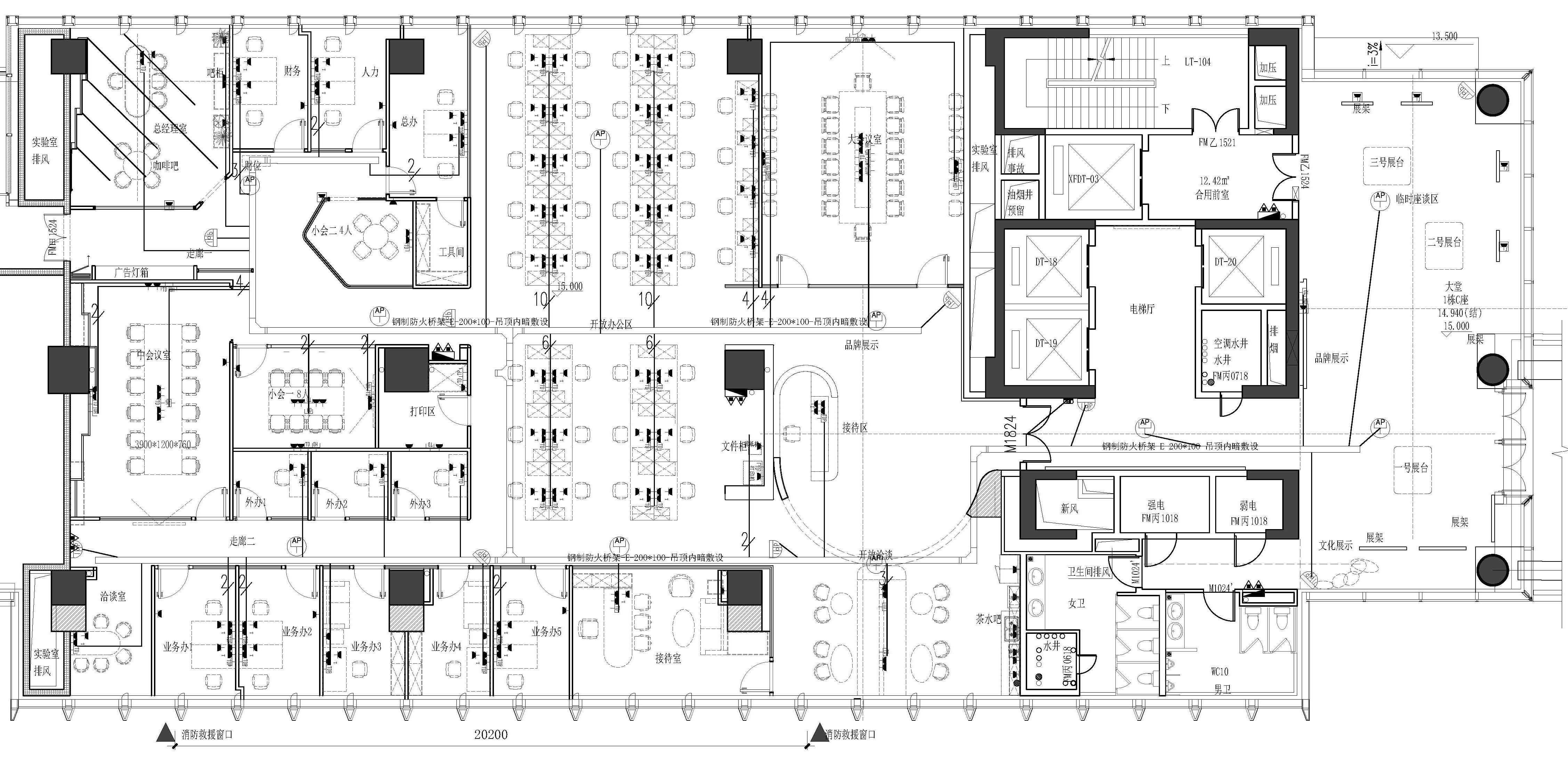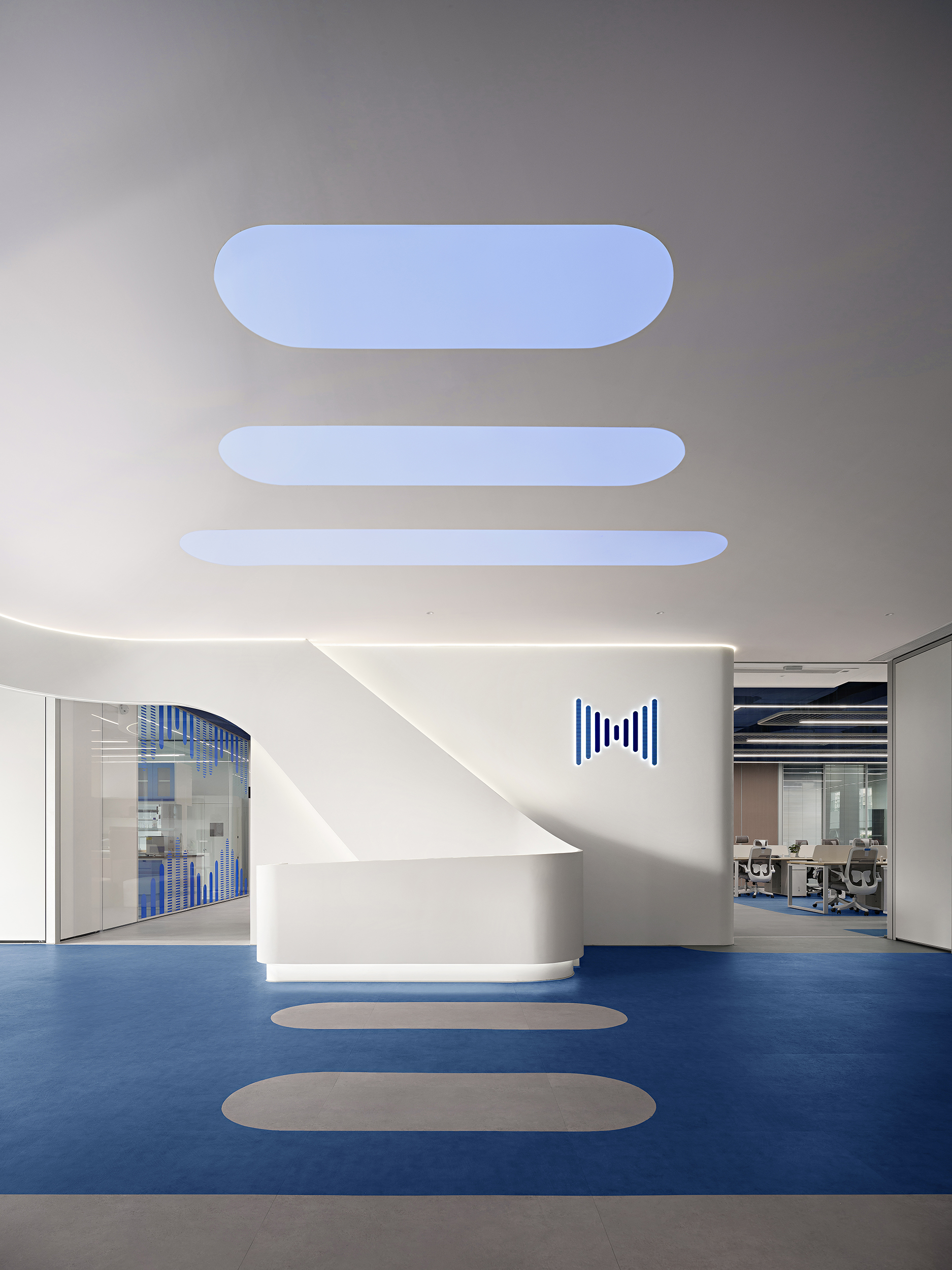 环形主动线连接研发、办公、休闲区,减少交叉干扰;智能导视系统嵌入蓝色光带引导。