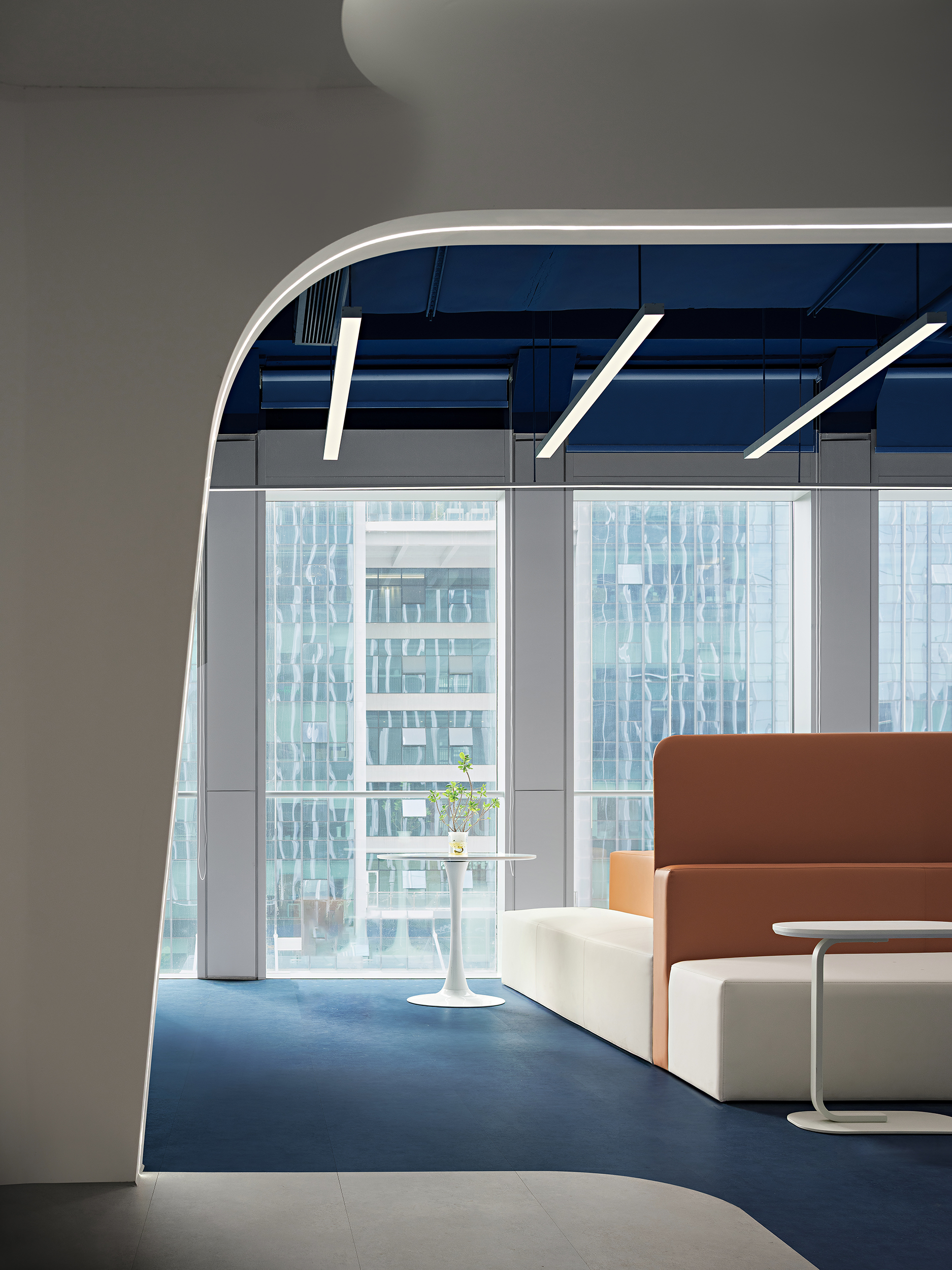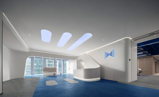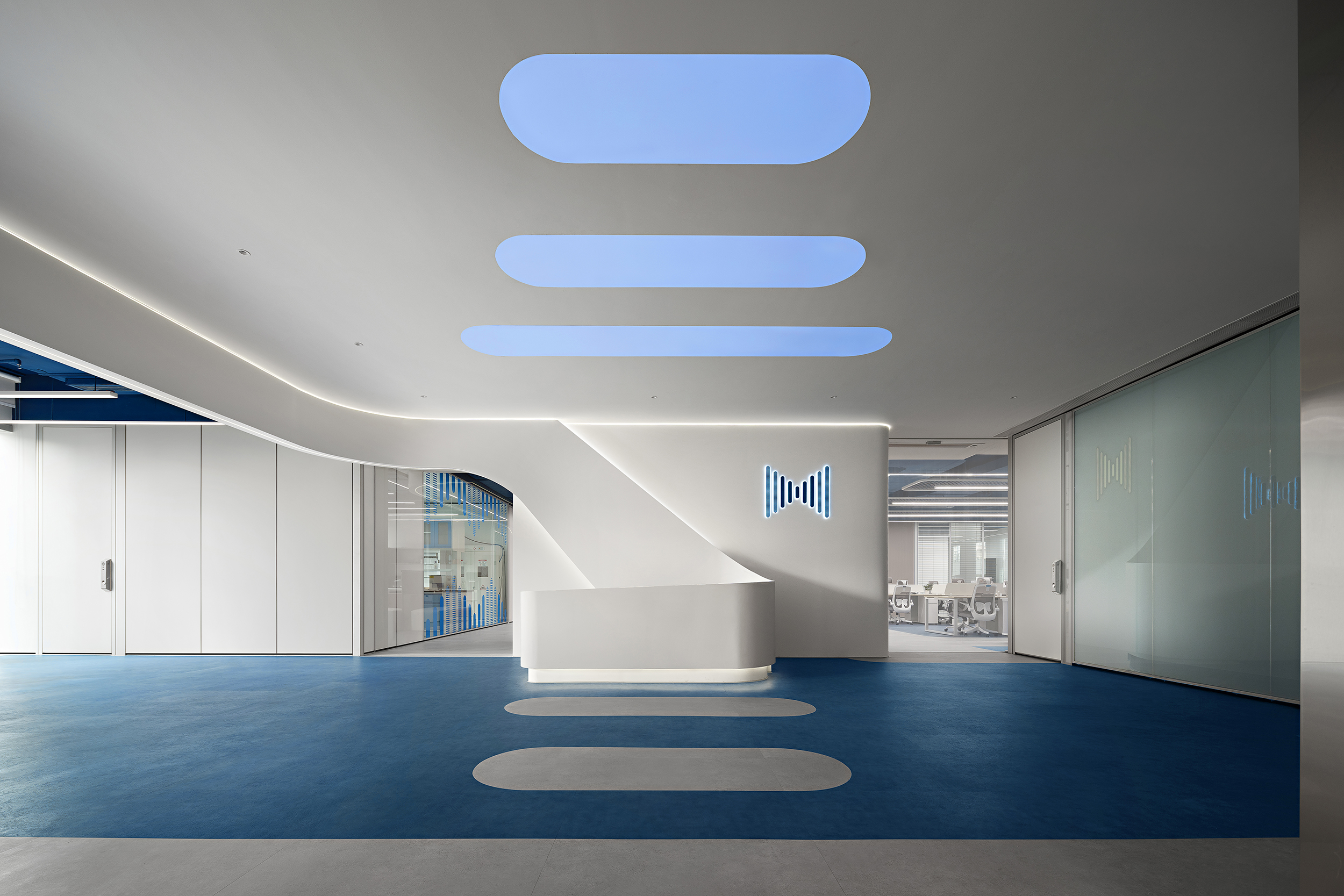 设计选材:通过色彩叙事(蓝/白/橘)、Logo符号的空间转译、以及低碳材料与灵活布局的创新结合,为生物科技企业构建兼具专业严谨性与人文关怀的办公环境,既满足研发功能需求,亦通过设计传递“探索生命科学,守护人类希望”的品牌价值