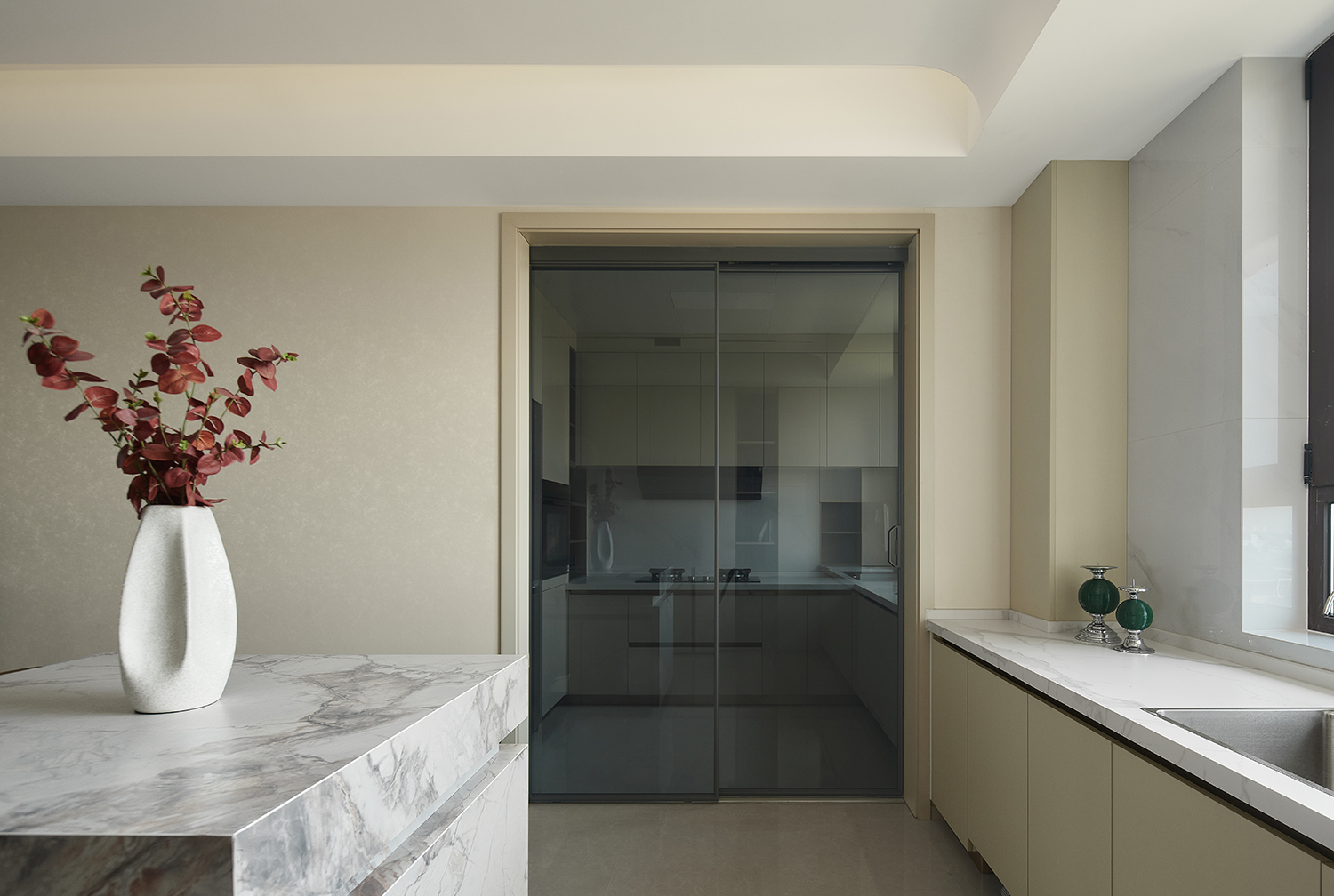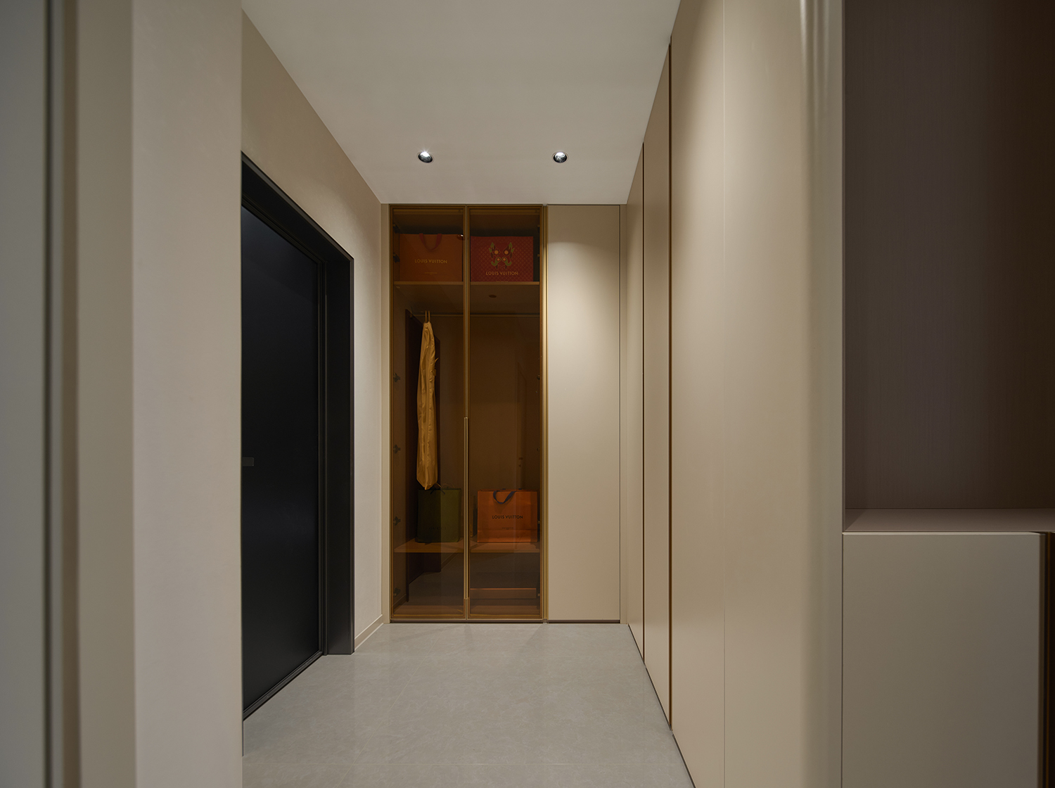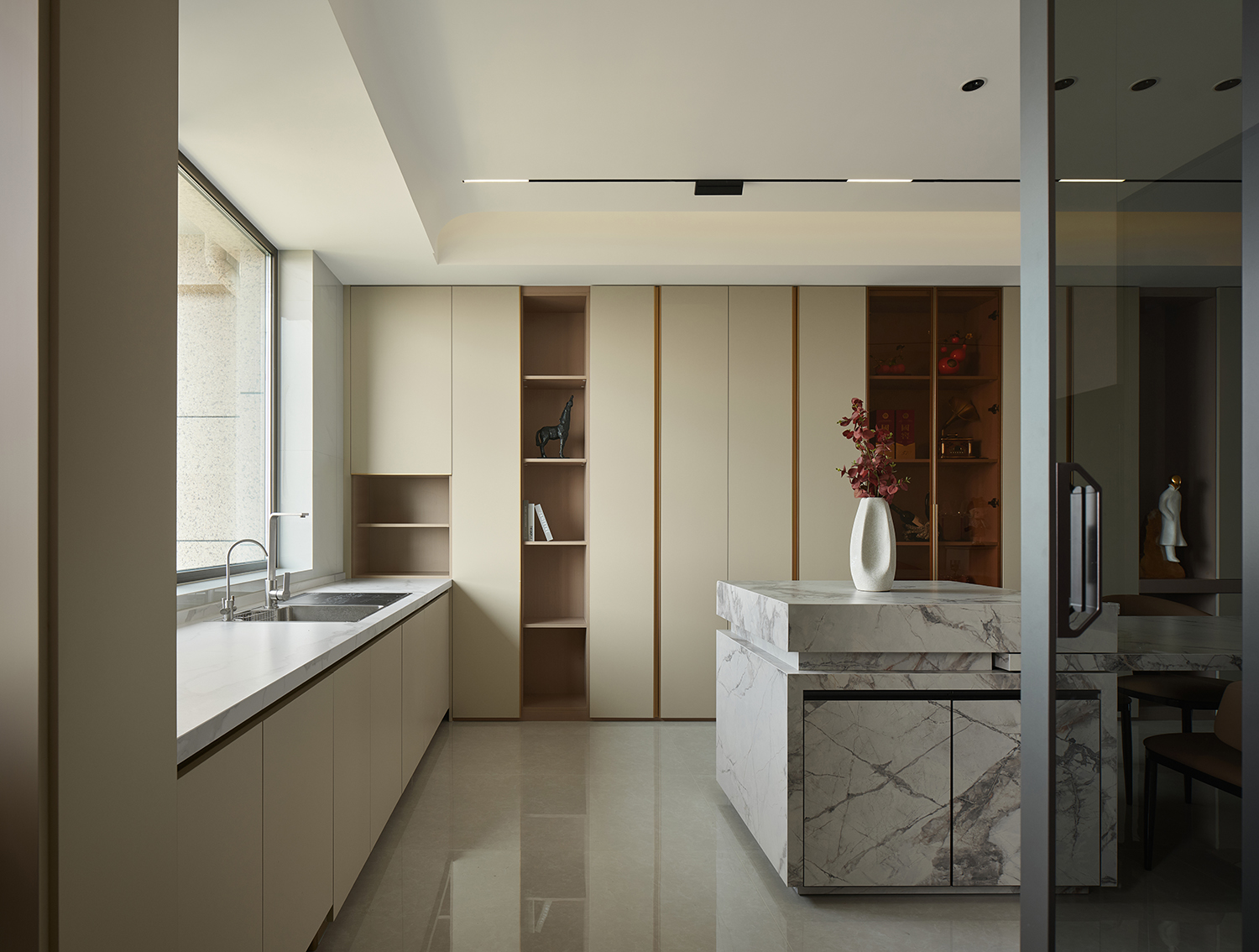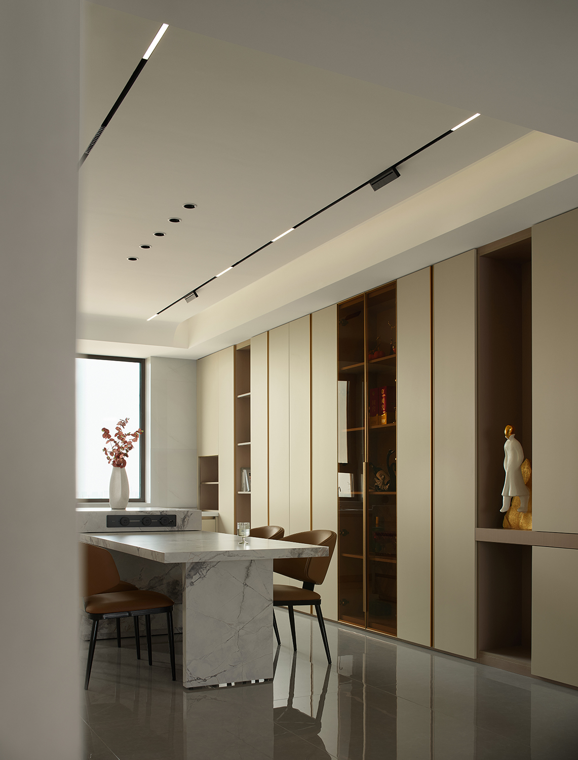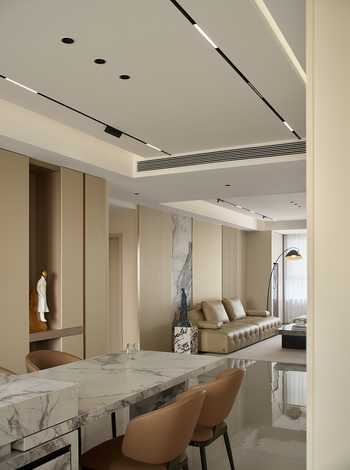 用暖米色皮质沙发的柔软质感,中和大理石、金属、高光瓷砖的冷硬感;同时以木饰面的温润纹理穿插在石材与金属之间,打破轻奢风格易出现的“冰冷感”,实现材质触感与视觉感受的双重平衡。