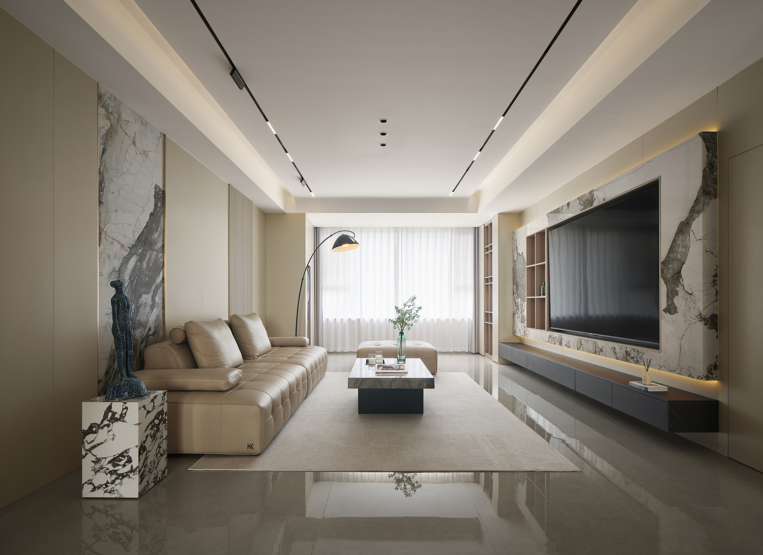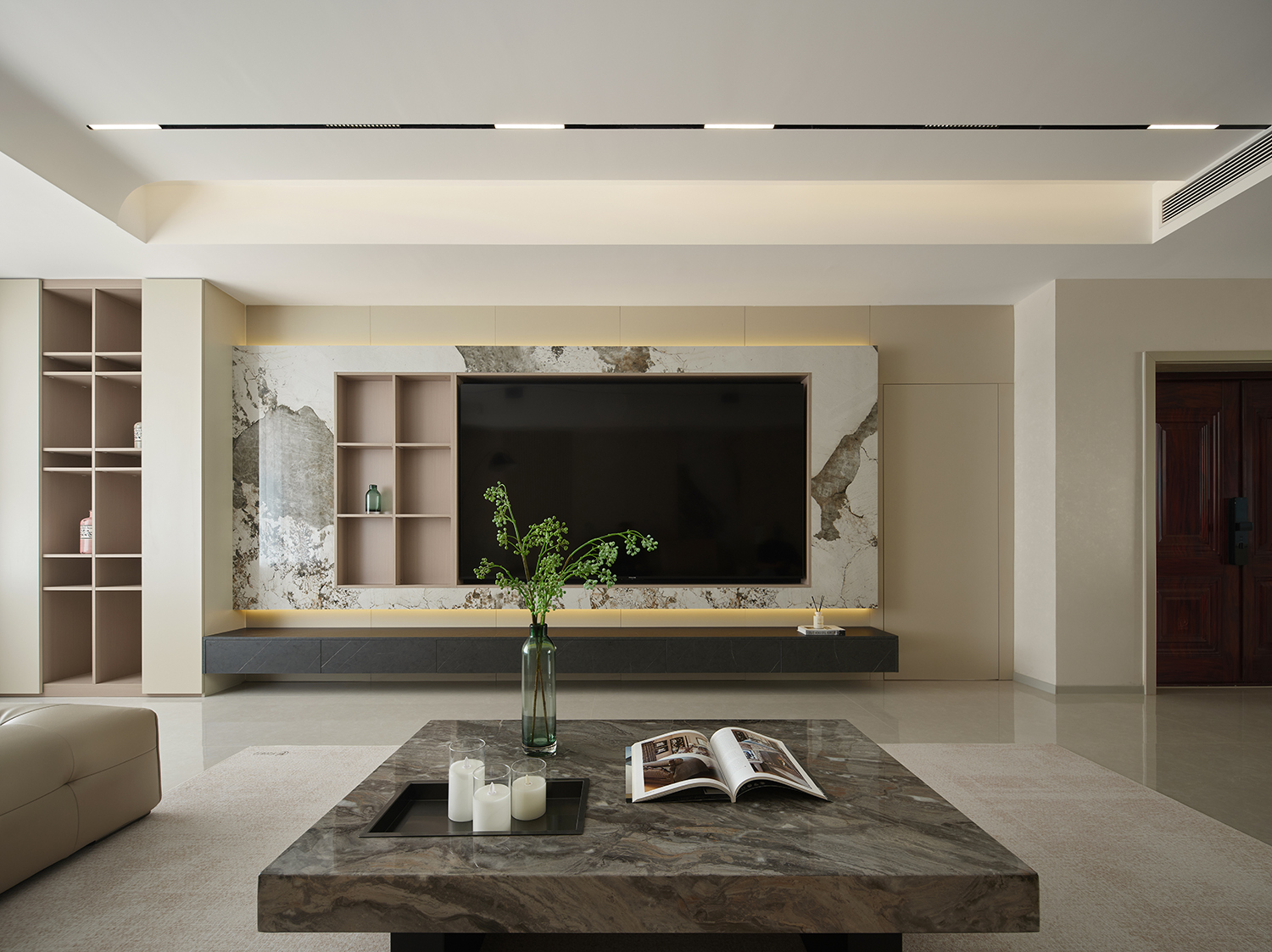 ◦ 主材质:大理石(背景墙)、皮革(沙发)、柔光石材/瓷砖(地面)、木饰面,通过不同质感的材质碰撞营造高级感;