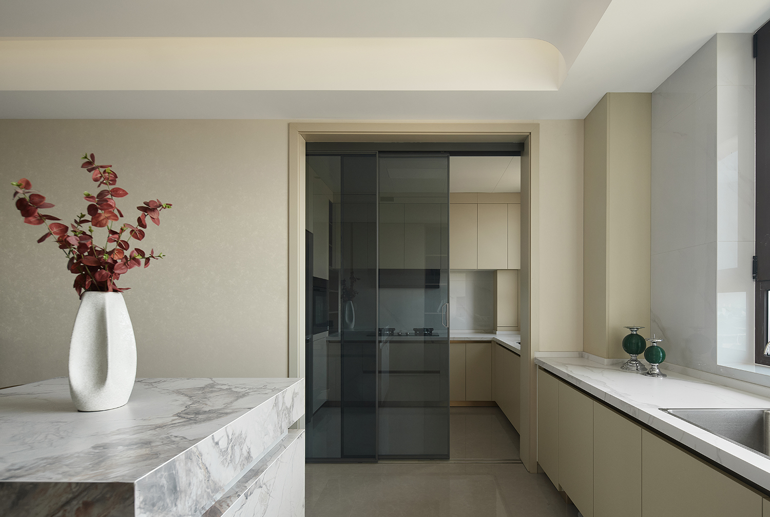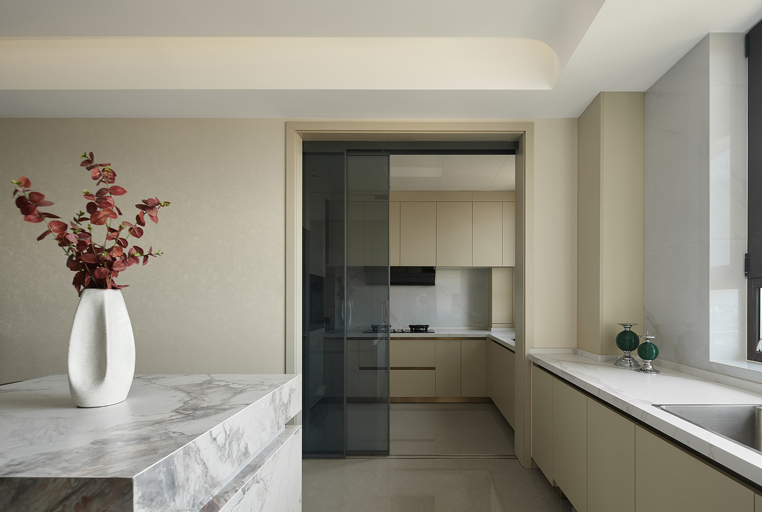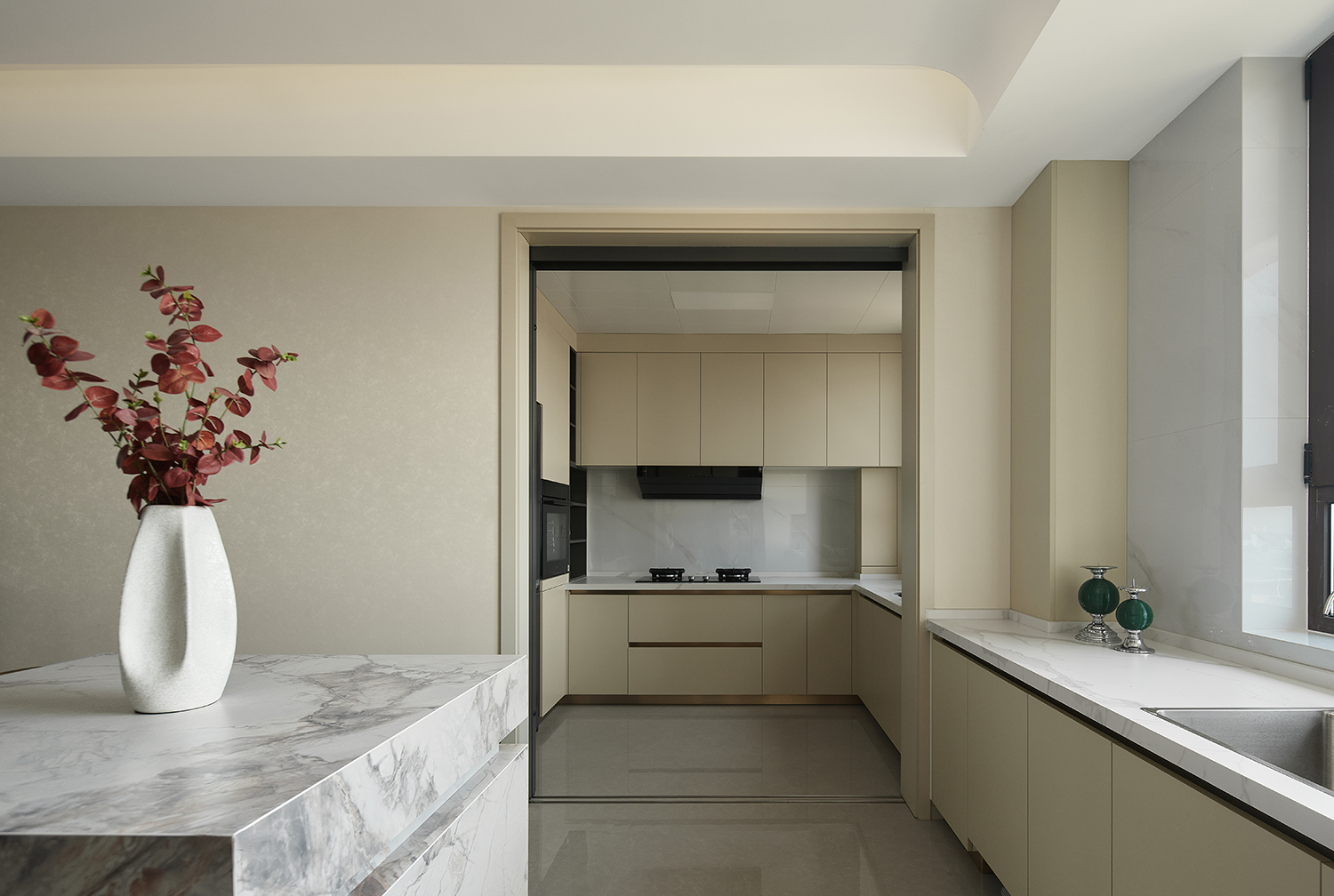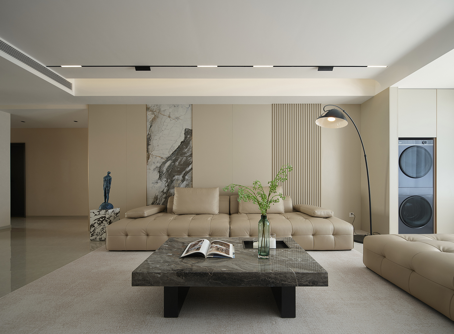◦ 主色调:暖米色+浅灰为基底,搭配黑色金属、大理石纹理做点缀,色调柔和且层次分明。