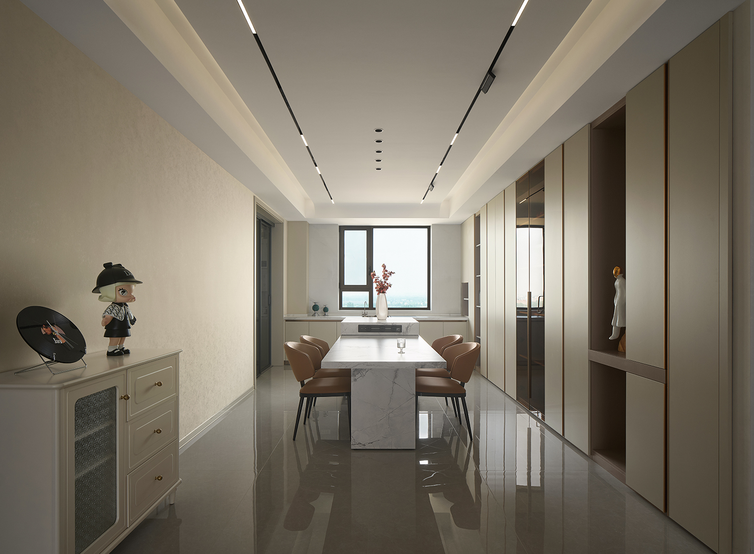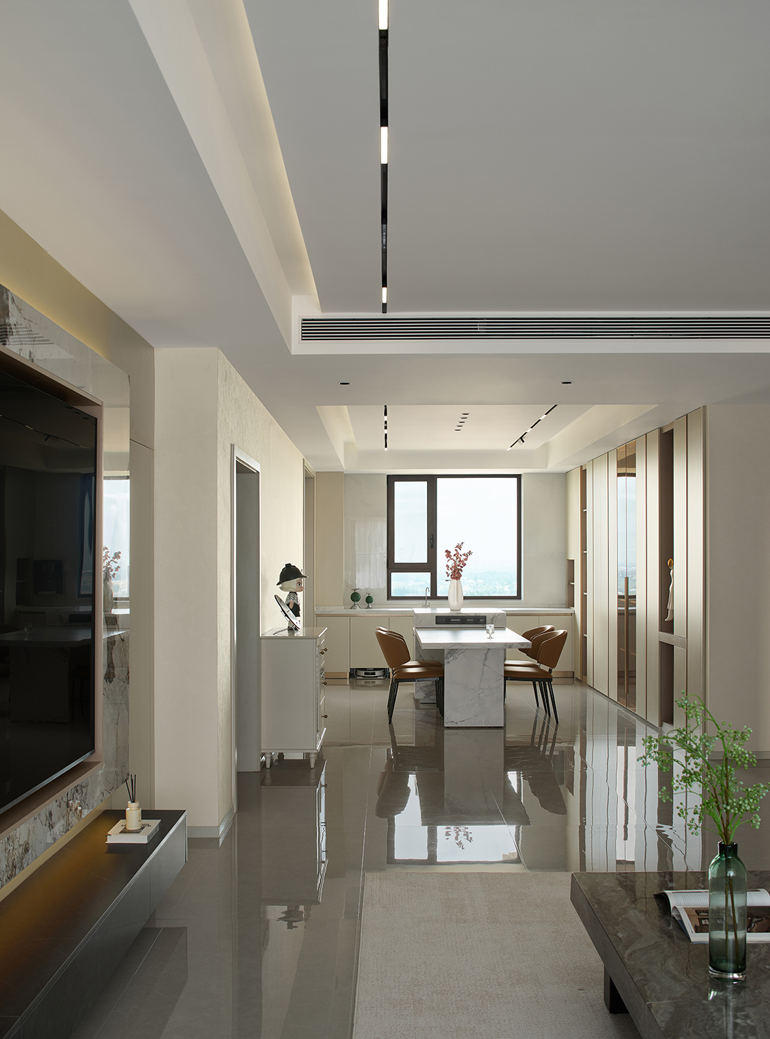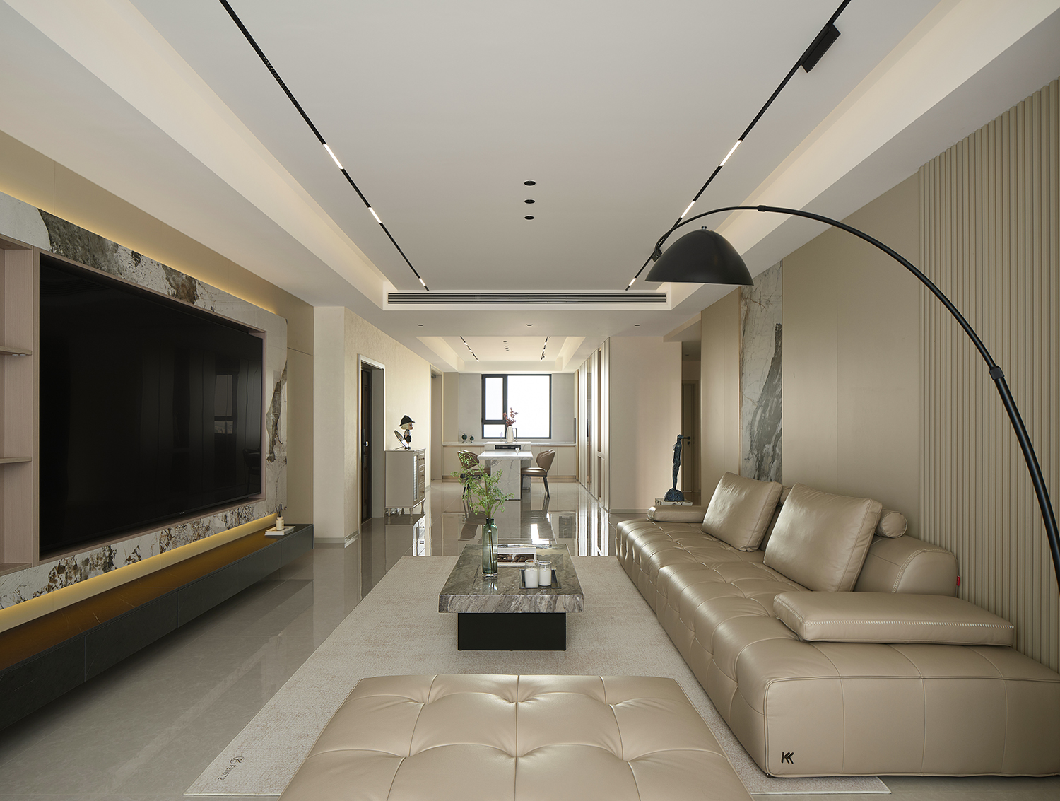 电视墙收纳系统与餐厅餐边柜采用同材质、同设计逻辑(封闭收纳+开放展示),软装材质(皮质、大理石)也跨空间呼应,让客厅、餐厅从“独立区域”变为“有机整体”,弱化功能区的边界感。