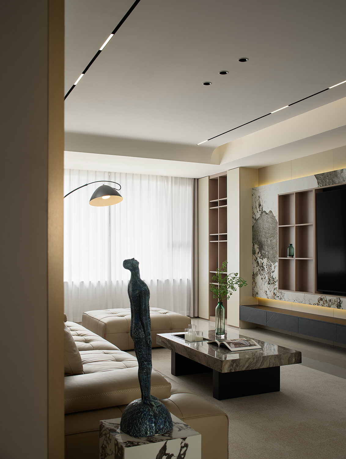 摒弃传统轻奢中大理石仅作背景墙装饰的单一用法,将大理石(包括艺术雕塑台、茶几台面、地面)作为空间结构元素,通过纹理的连续呼应(如背景墙石材与摆件台石材的纹路衔接),让材质成为空间的视觉主线,而非零散的装饰点缀。