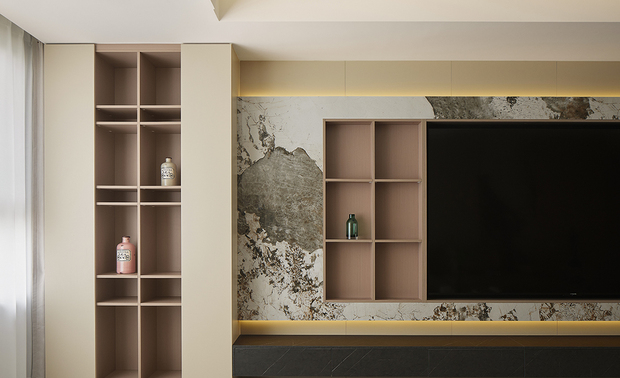 电视墙不再是单一的装饰面,而是整合了影音设备区、藏品展示区、日常收纳区的复合功能模块;悬浮式设计的柜体既弱化了墙体的厚重感,又让电视墙成为“功能载体”而非“视觉壁垒”。