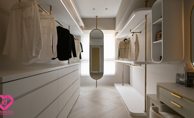 ▲主卧弧形木作床背板内藏暖黄间接光源,可作夜灯并营造舒眠氛围;更衣室整合衣架、抽屉柜与梳妆台,并以伸展台为概念发想窗畔浅金镜面,提供住者一展美学的时髦舞台。
