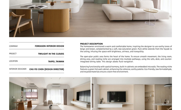 My Favourite International Design Award(MFID)作为马来西亚首个且唯一的国际设计奖项,2025年共吸引来自7个国家及地区的众多优秀作品参赛,由横跨11国16位专业评审,以含括设计理念、美学表现力、功能性、永续实践、文化脉络等五大标准严格遴选,致力于发掘并推广兼具精湛工艺与前瞻创意的优秀作品。擎森设计 设计总监 陈楚扉 巧妙运用流畅圆弧线条化解空间中的横樑压迫,并结合褐绿大地色调与米白纯淨质感,型塑如云朵轻盈飘浮的宁静氛围;家宅《云暮》重新定义传统四房格局,让书房融入公共领域,以开阔视野与柔和曲线勾勒生活美学的诗意篇章,精准诠释MFID所倡导「创新与文化交融」的设计精神,成功摘下本届赛事住宅空间类「 Winner」桂冠!