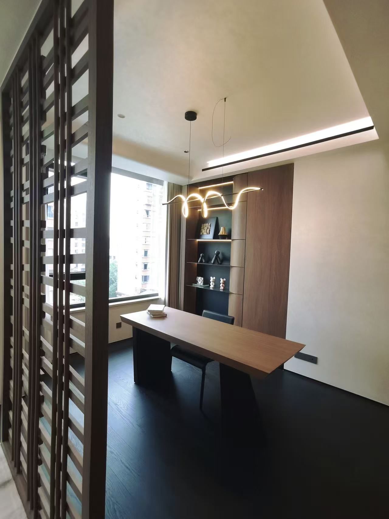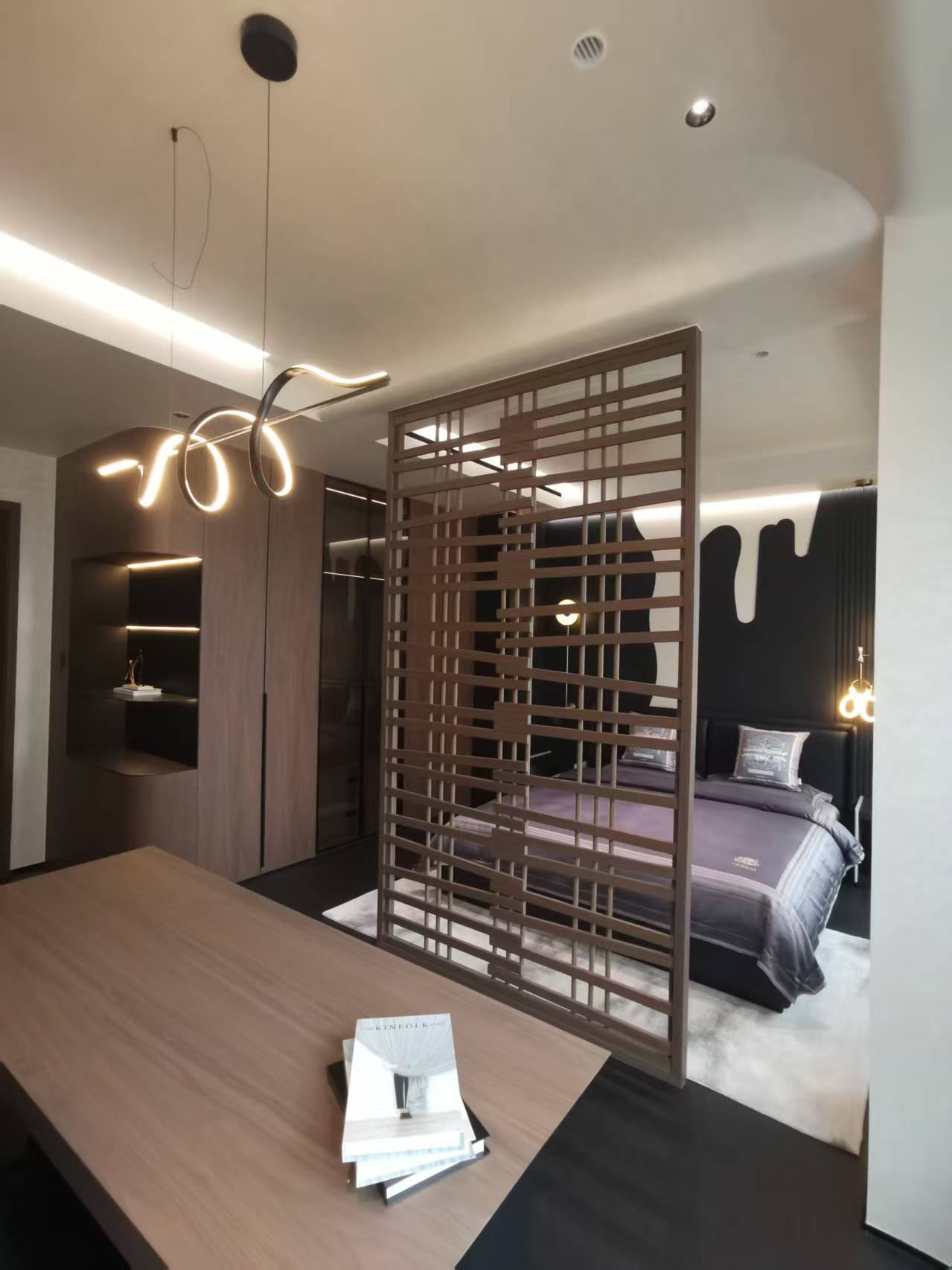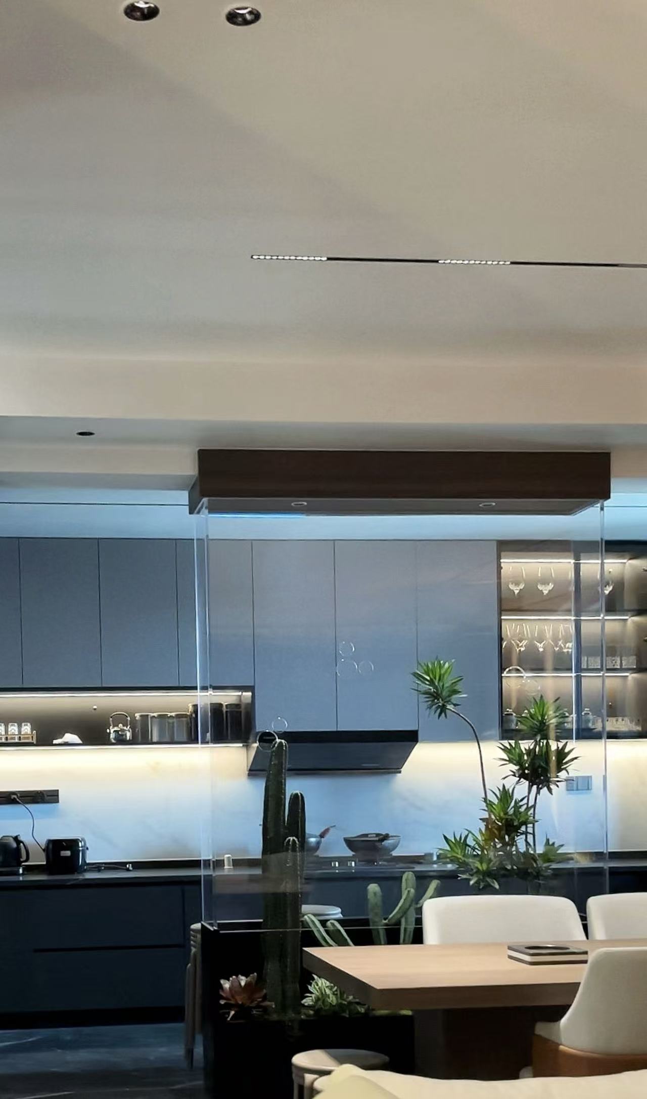 空间意境:在设计中我们不仅注重空间的美学和功能性,更加注重人与自然的和谐互动,厨房与餐厅之间通过使用生态玻璃柜作为屏风,赋予了空间无限的通透感与开阔视野。