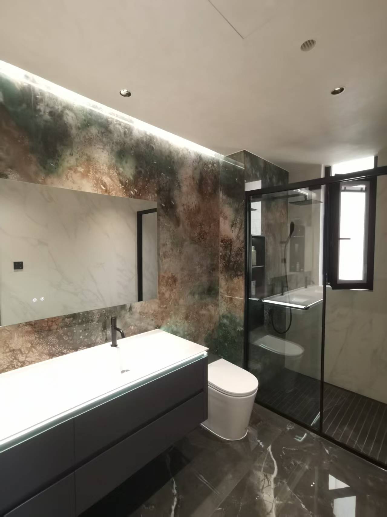 设计选材:大量使用了环保节能的艺术涂料,木制护墙板,艺术岩板,透亮干净的玻璃制品,吊顶大面积使用环保隔热泡沫层。
