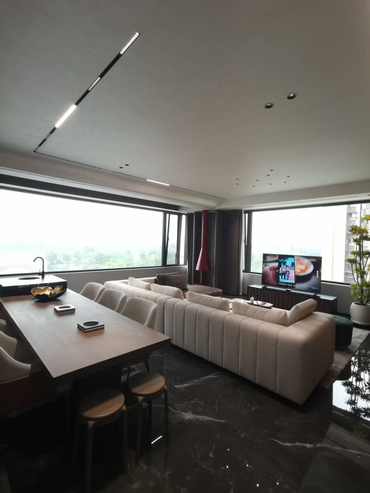 用户体验:入住后,感觉客厅宽敞明亮,两大观景窗让视野更加开阔,居家氛围温馨,全屋智能系统、五恒系统使用都很方便,衣橱和储物空间都很充足,家具样式新颖实用