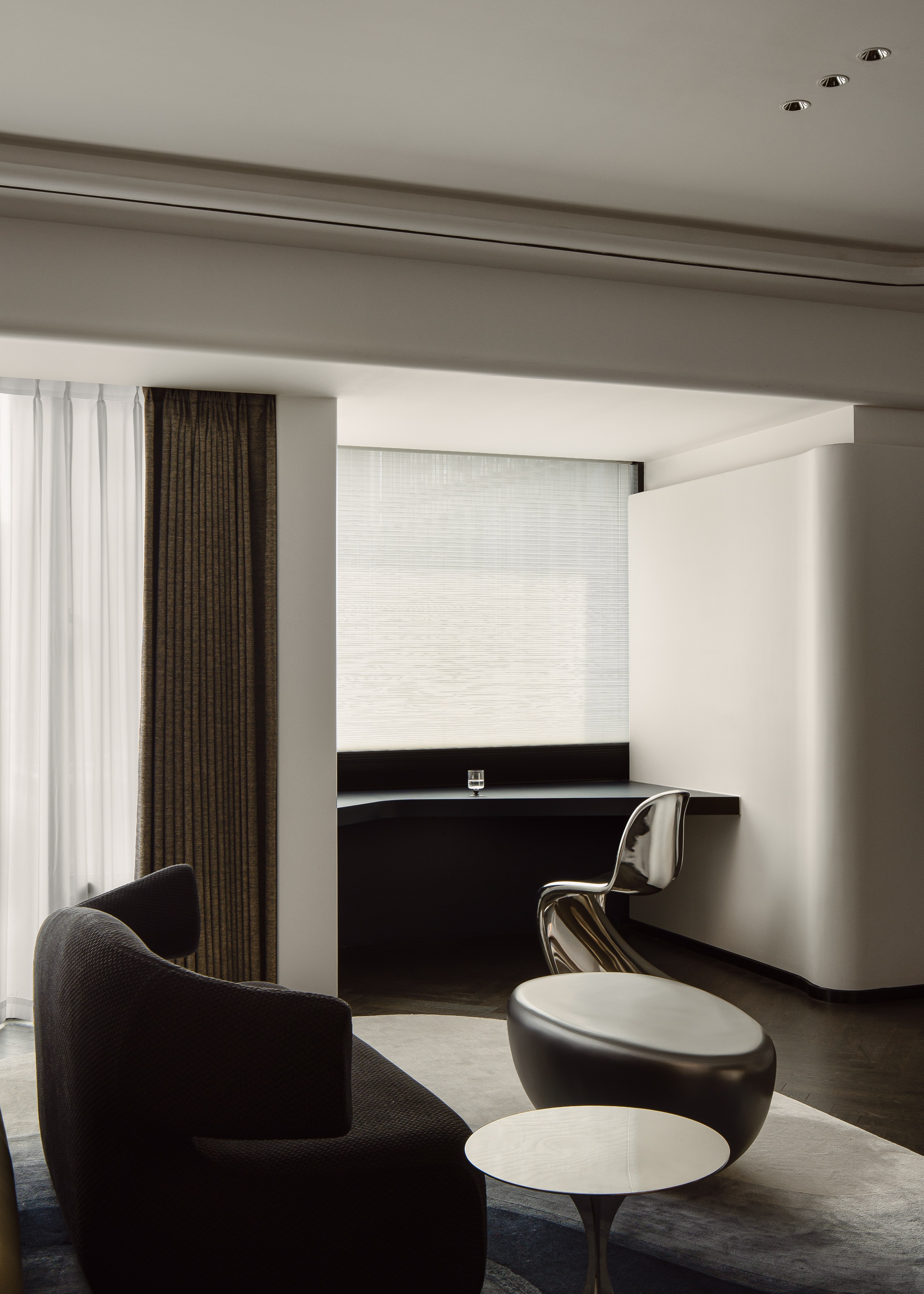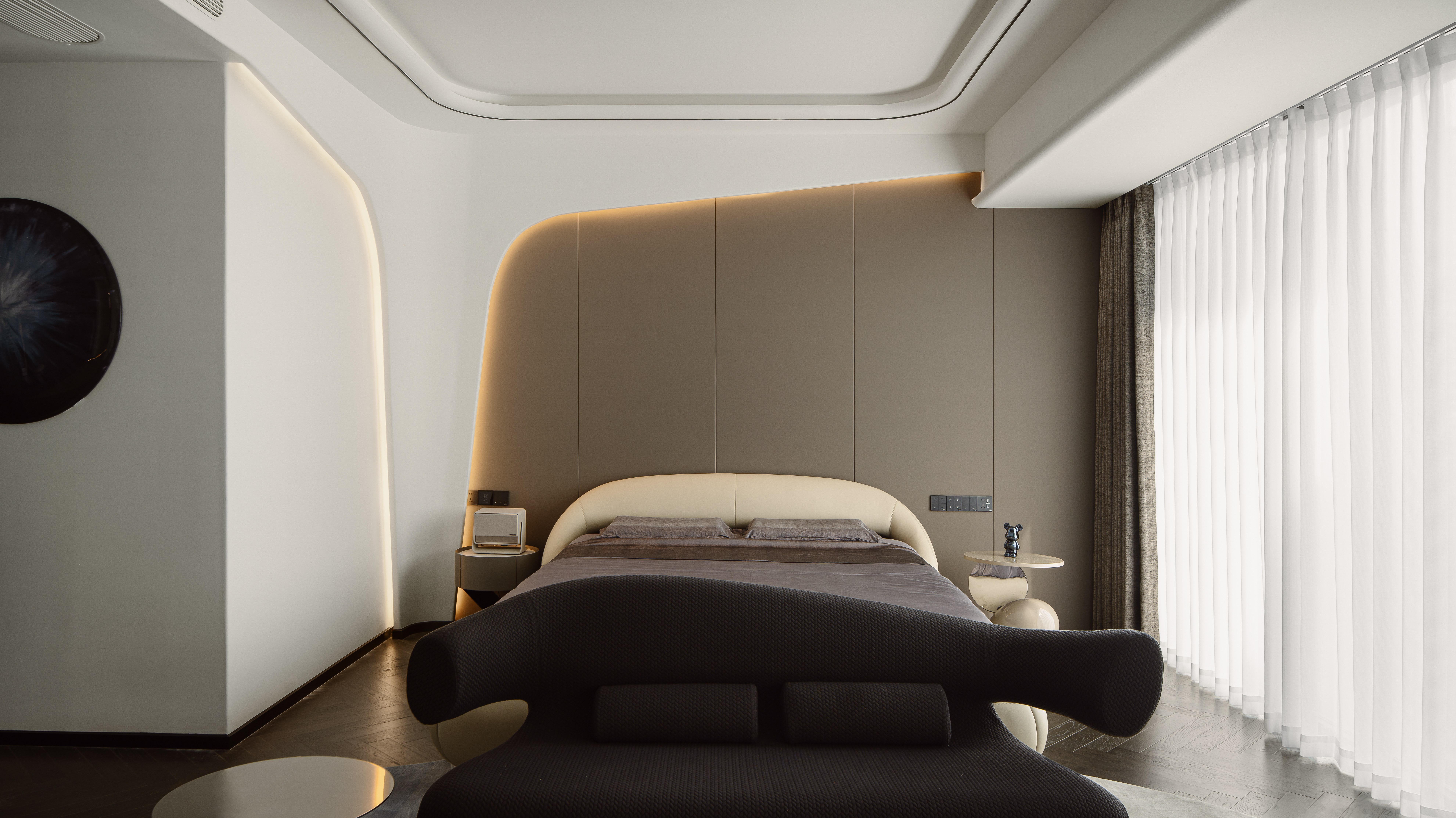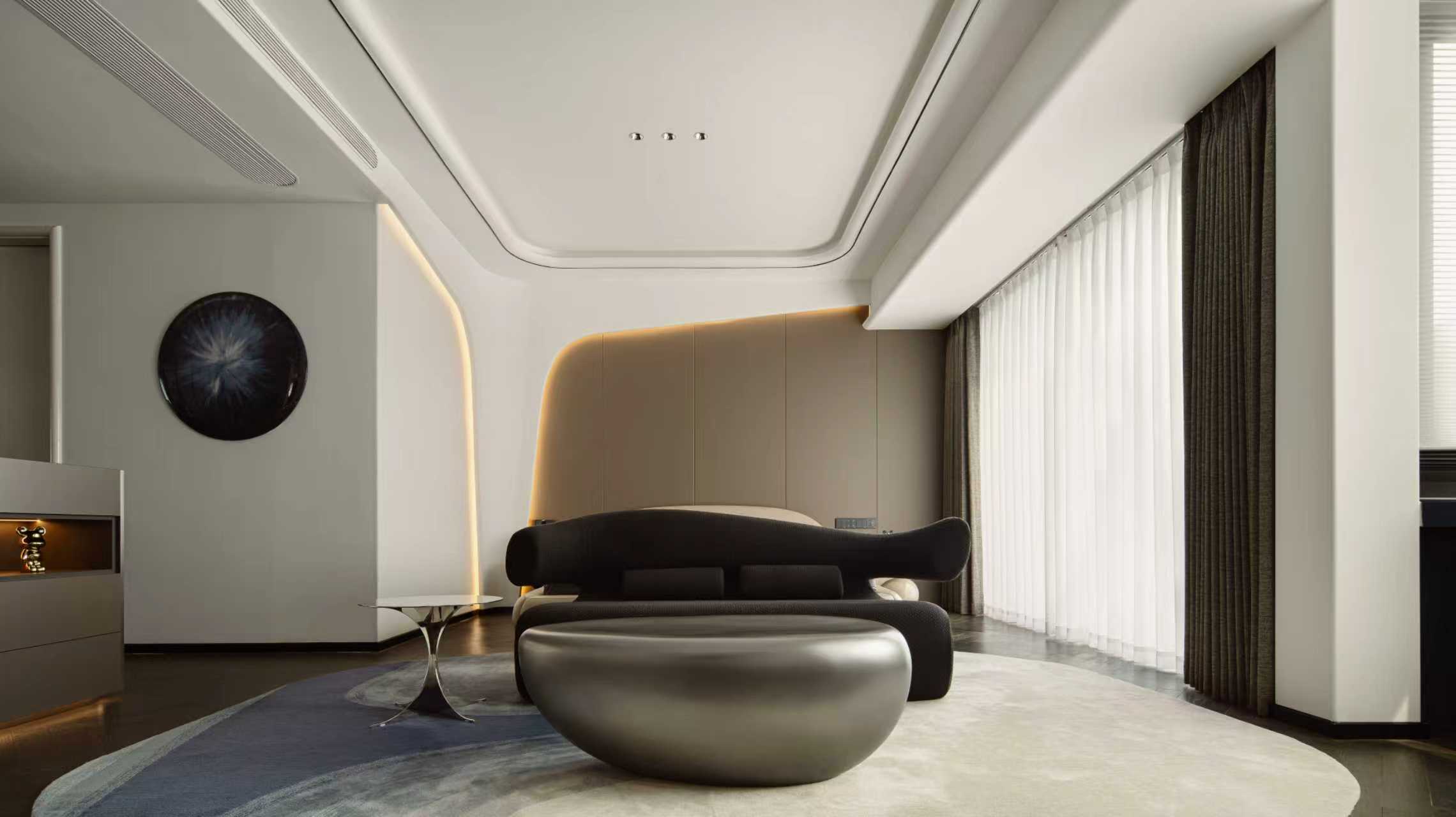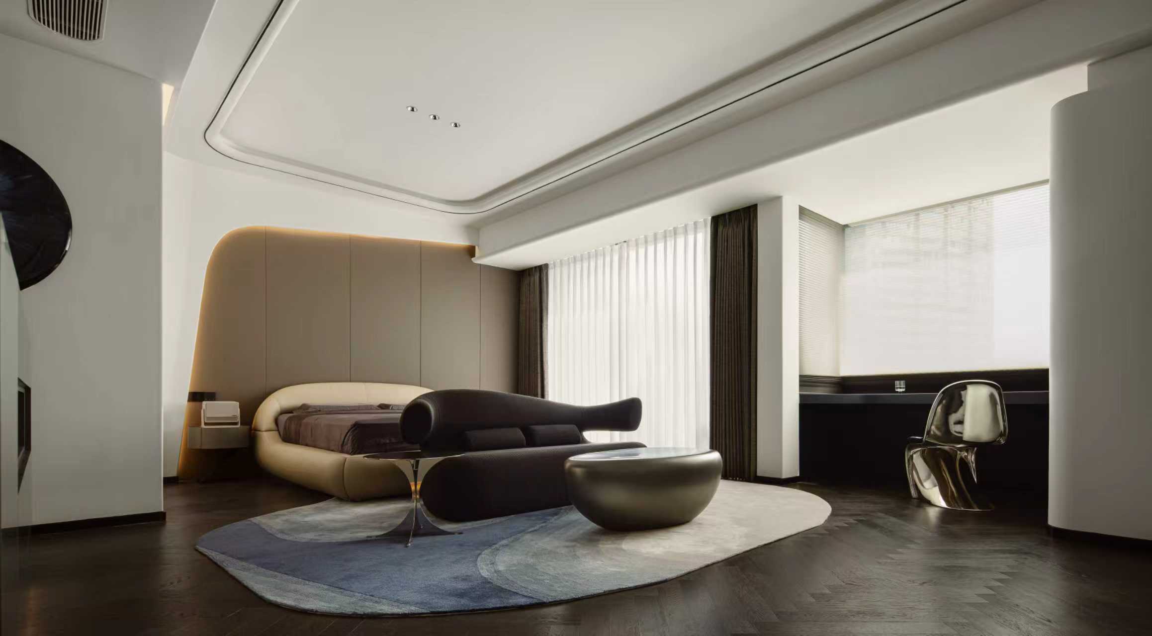 设计选材:以“舒适与艺术共生”为设计原则,弧形床头背景墙搭配柔和的线性灯带,弱化空间的硬朗感;异形艺术休闲椅、流线型边几的置入,让卧室在满足睡眠功能的同时,兼具艺术观赏与休闲体验;深色木地板与浅色软包的搭配,平衡了空间的冷暖色调,营造出静谧又富艺术感的休憩氛围。