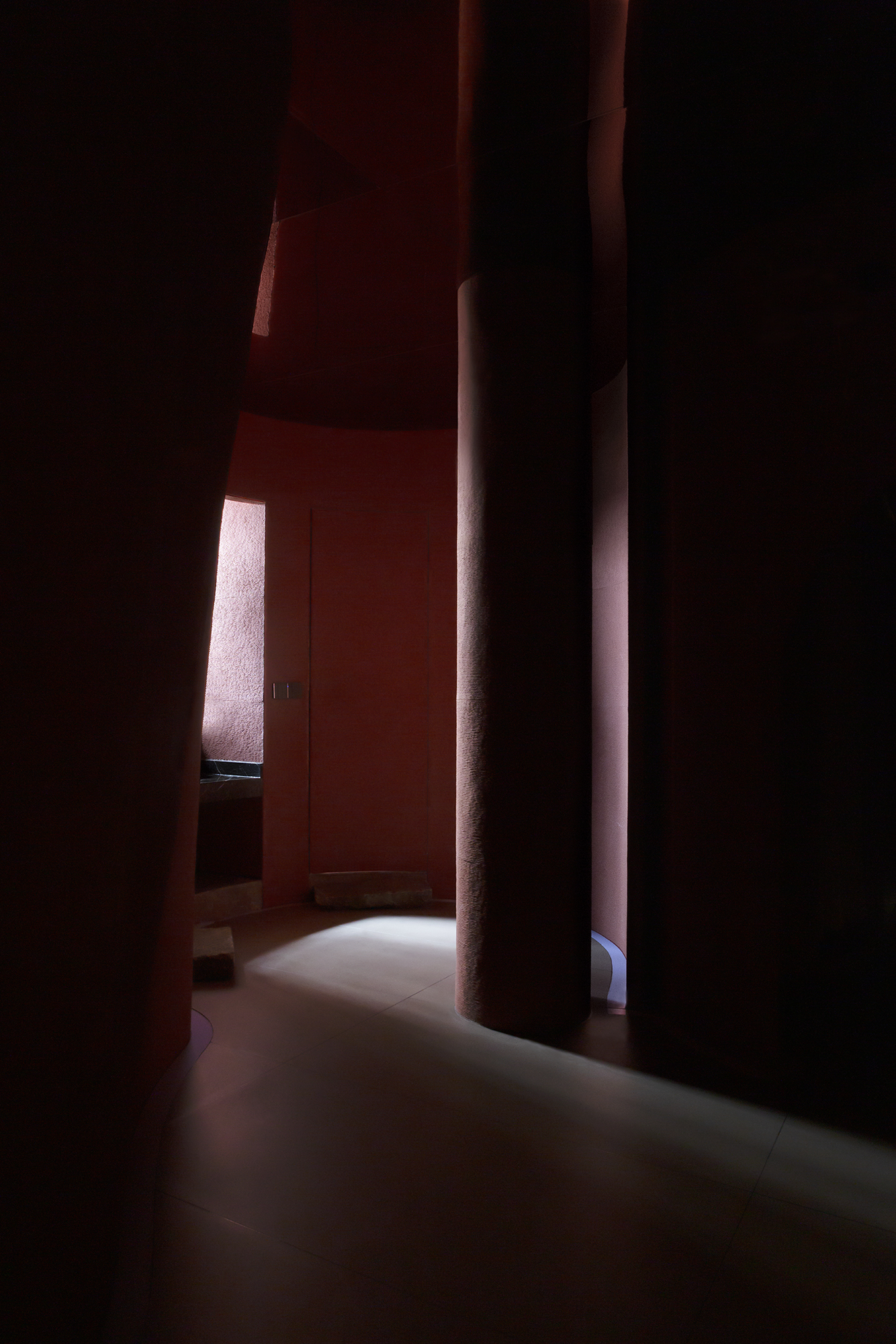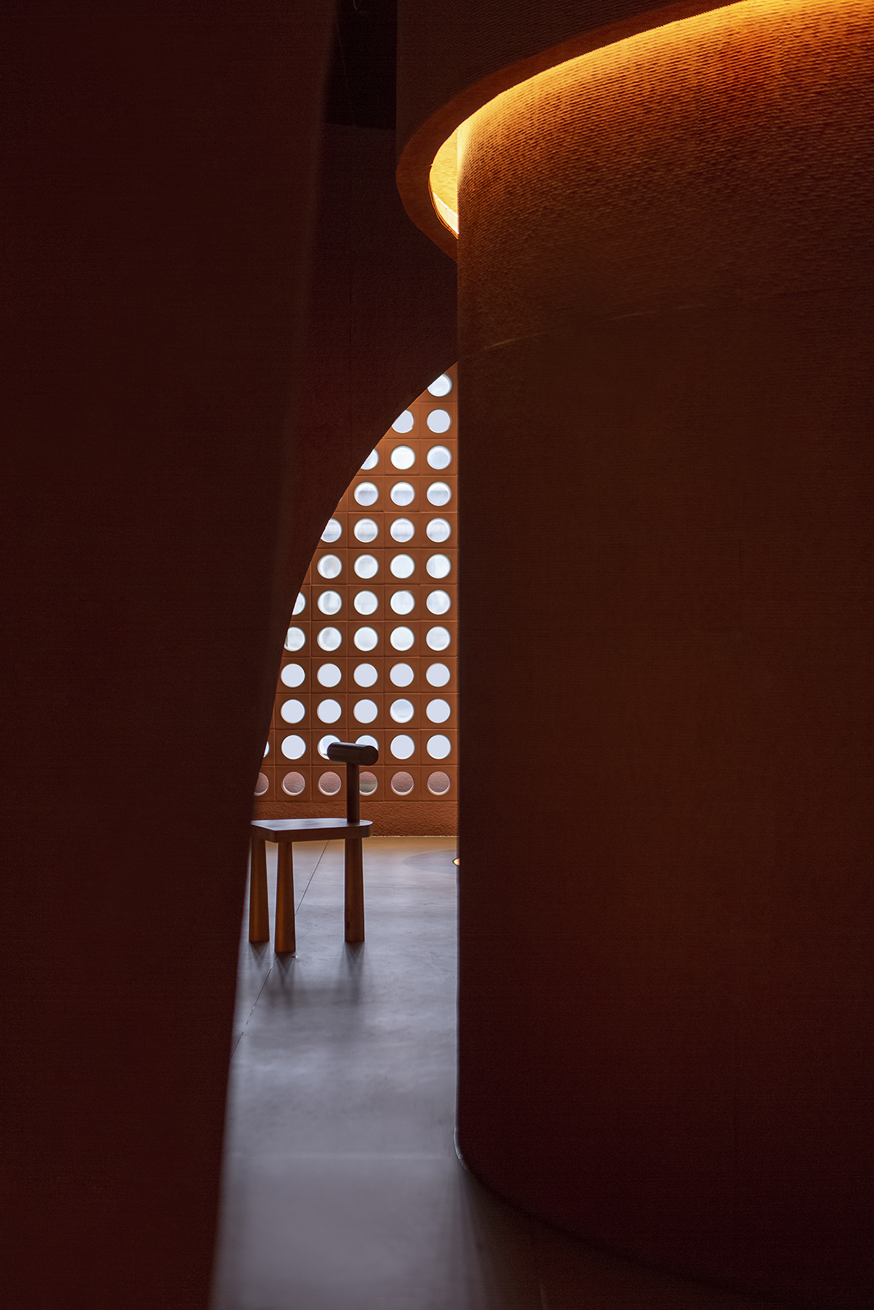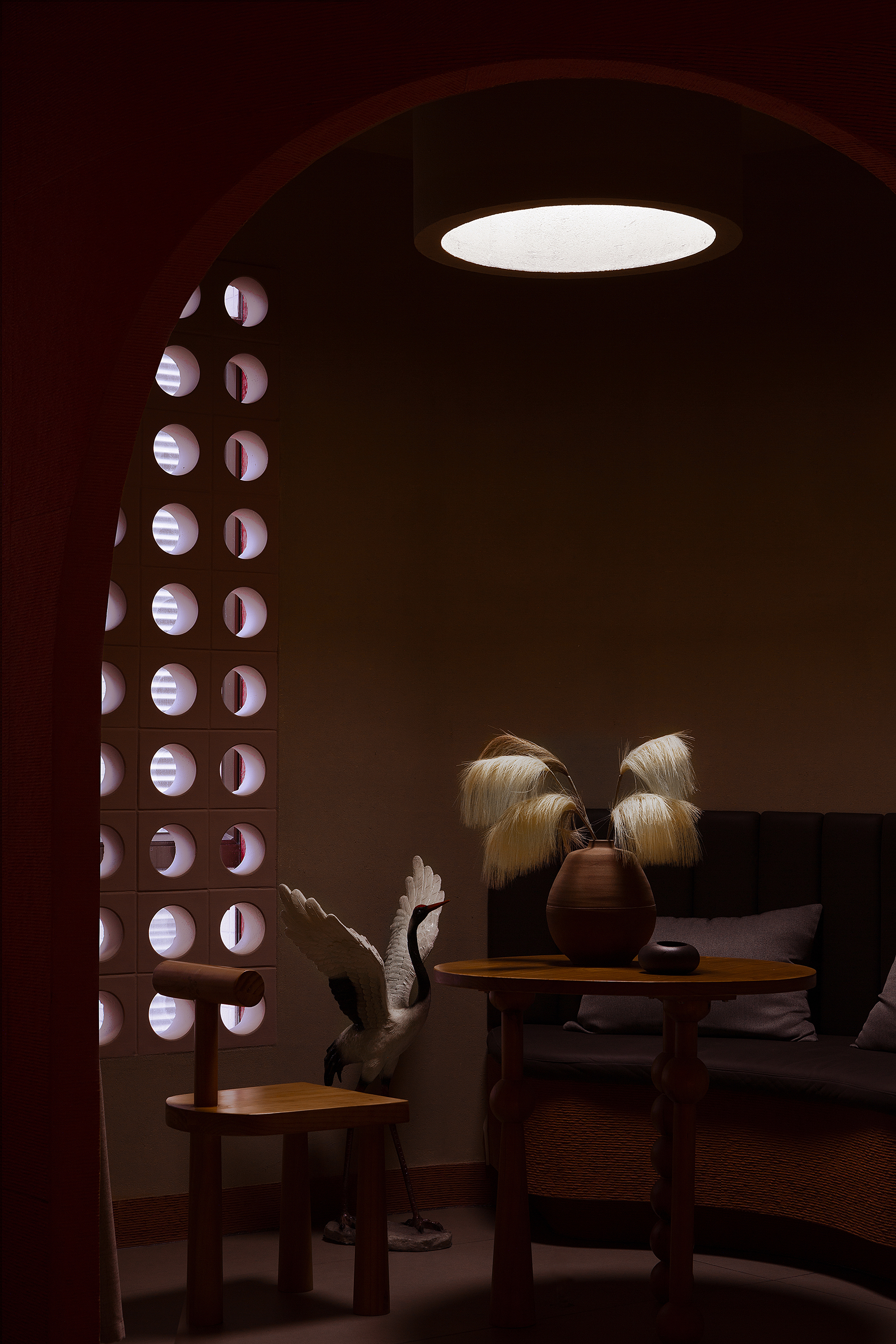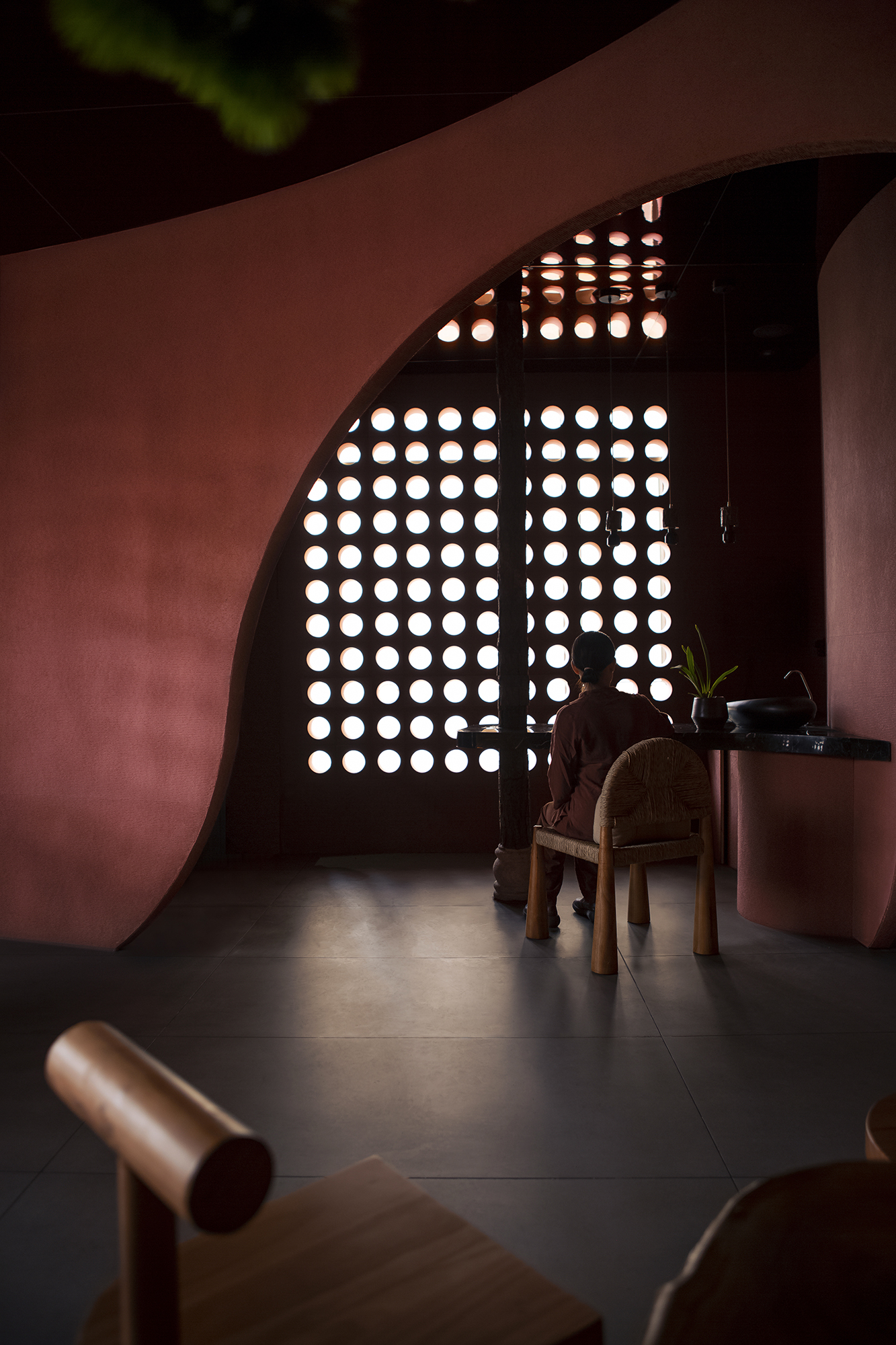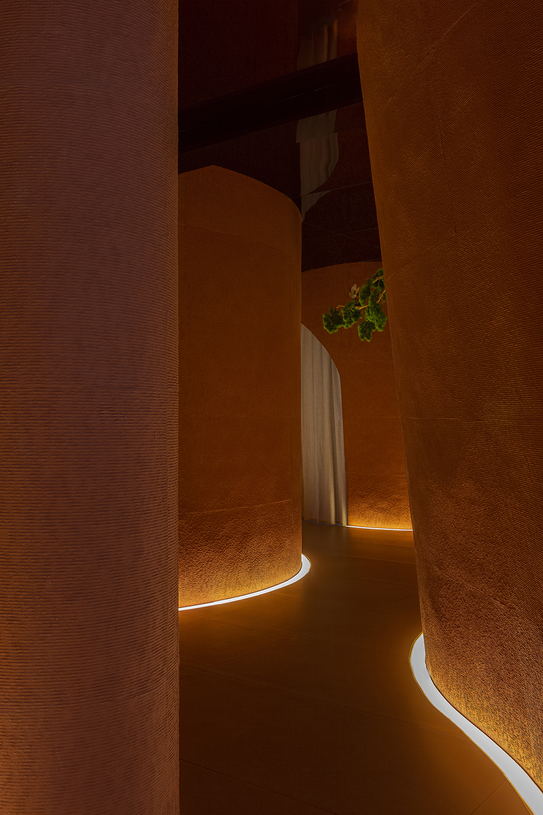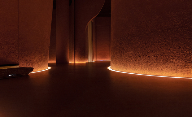 白天,窗口圆洞墙对光进行过滤和美化,光线漫射到曲径,巧妙地将空间层次化,简约化和时间化;晚上,公共空间以线性照明为主,暗藏曲线光漫射山墙,既引导游走的方向,也给空间带来曲径通幽的美感;VIP等独立空间根据使用需要设计光照,主次分明,舒适而宁静。