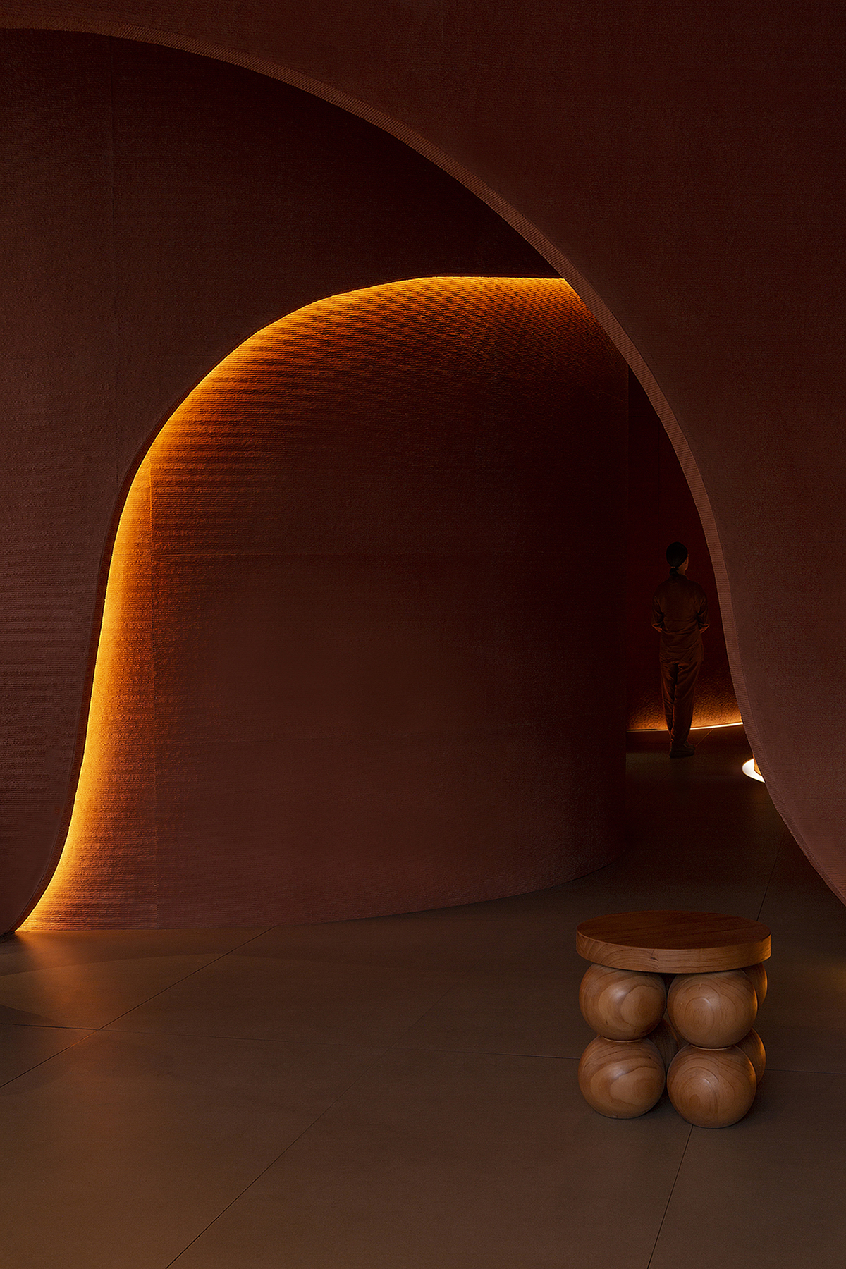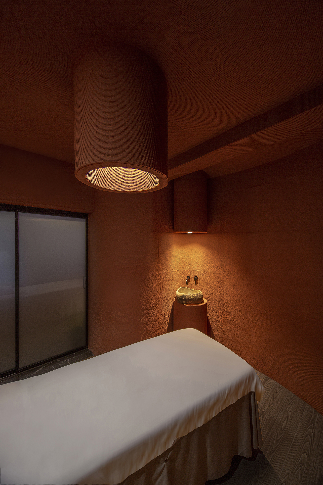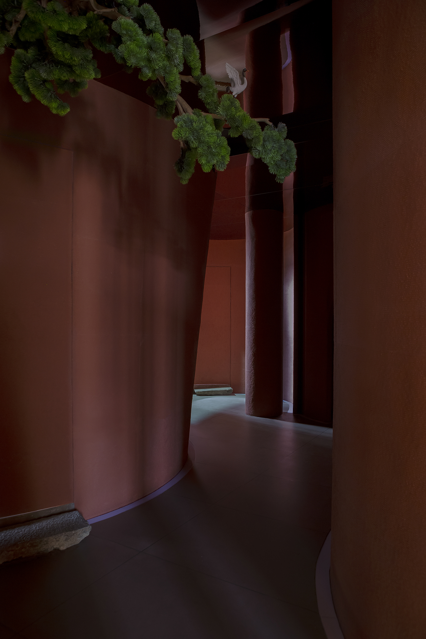 八圣道养生馆,创作灵感源于《桃源仙境图》。错位的太极圆姌生出流动和通幽的景象,山体为墙壁,水为天为镜,松为阑为几,石为案为阶,是自然山水与人工起居所姌和的山居之物,空间飘逸而沉着。宾客仿佛游走于山水间,在五感六觉中体验身体、心灵和环境的和谐共生之美。此时此景,人们可以自由地交流,阅读,品茗,问诊,泡浴和理疗,体验生命的真谛与空间的情趣。