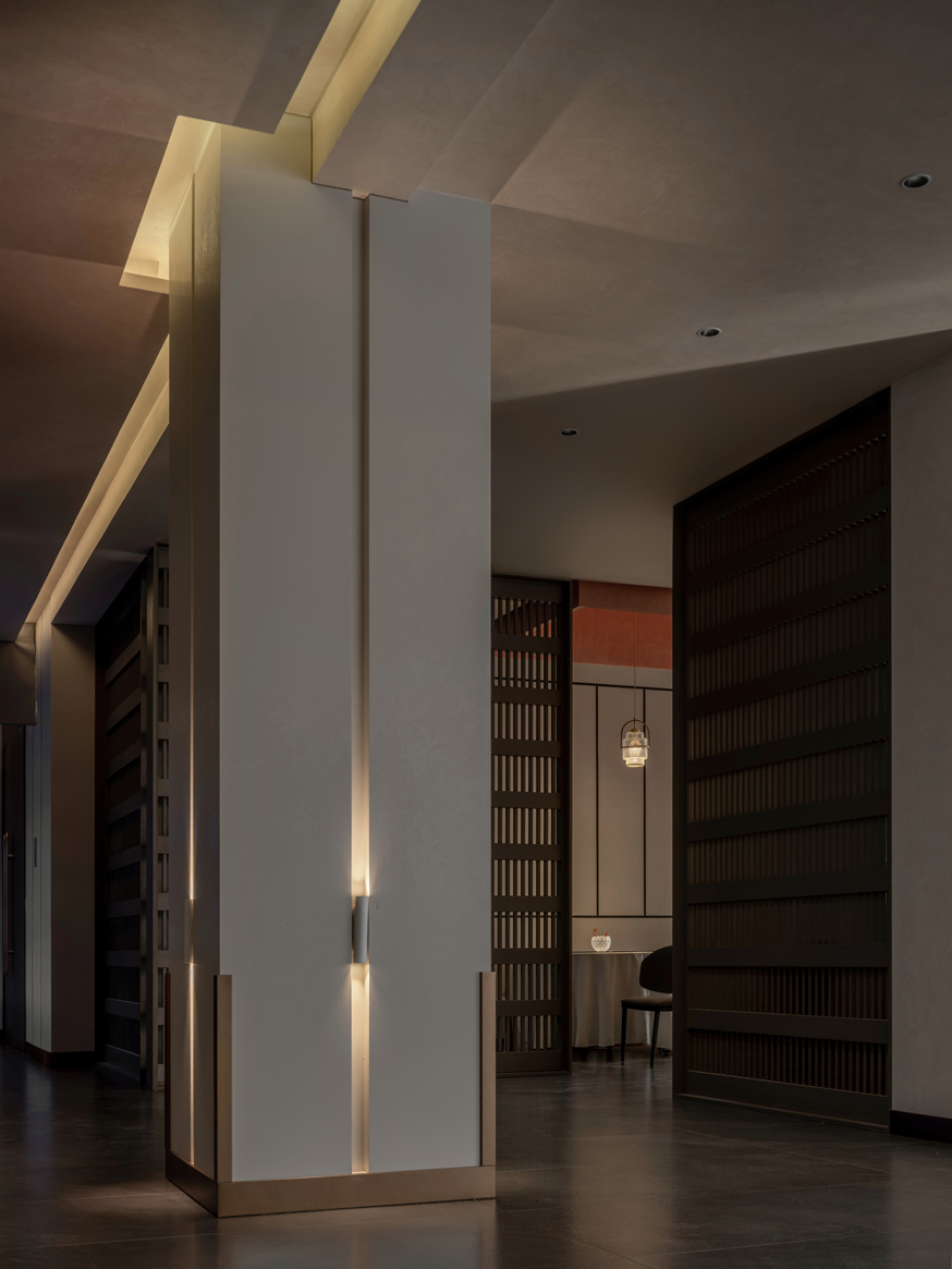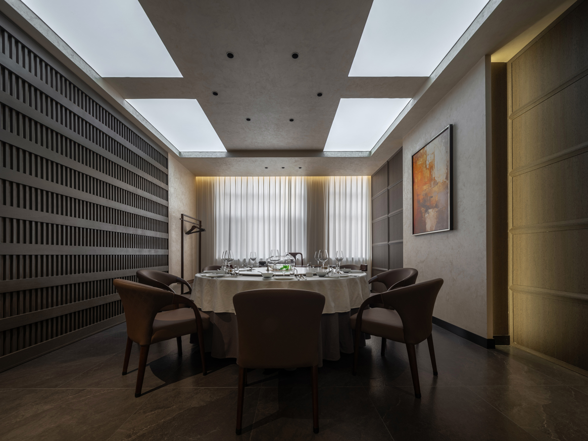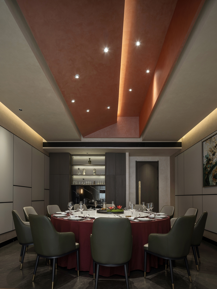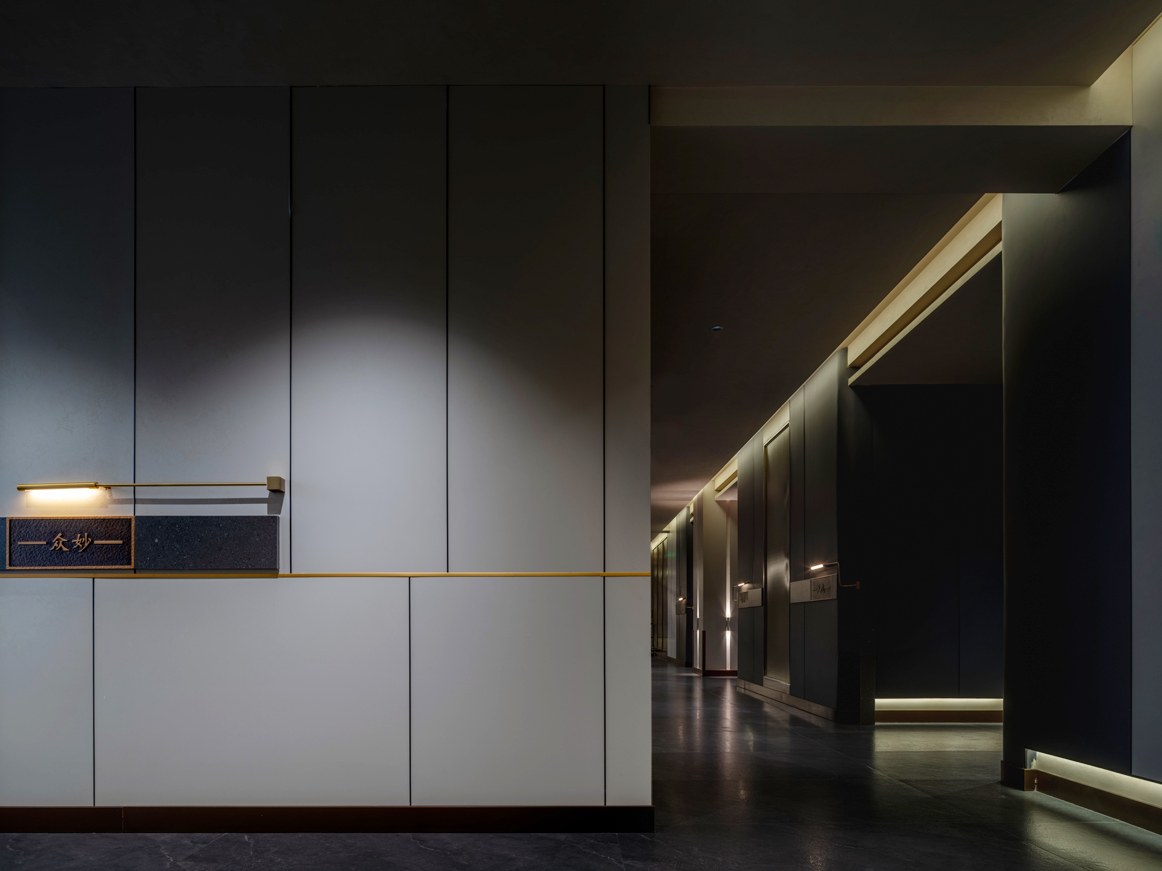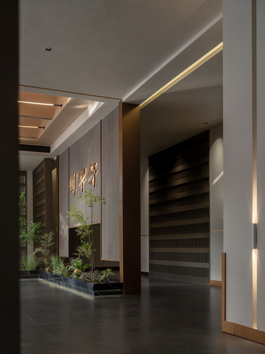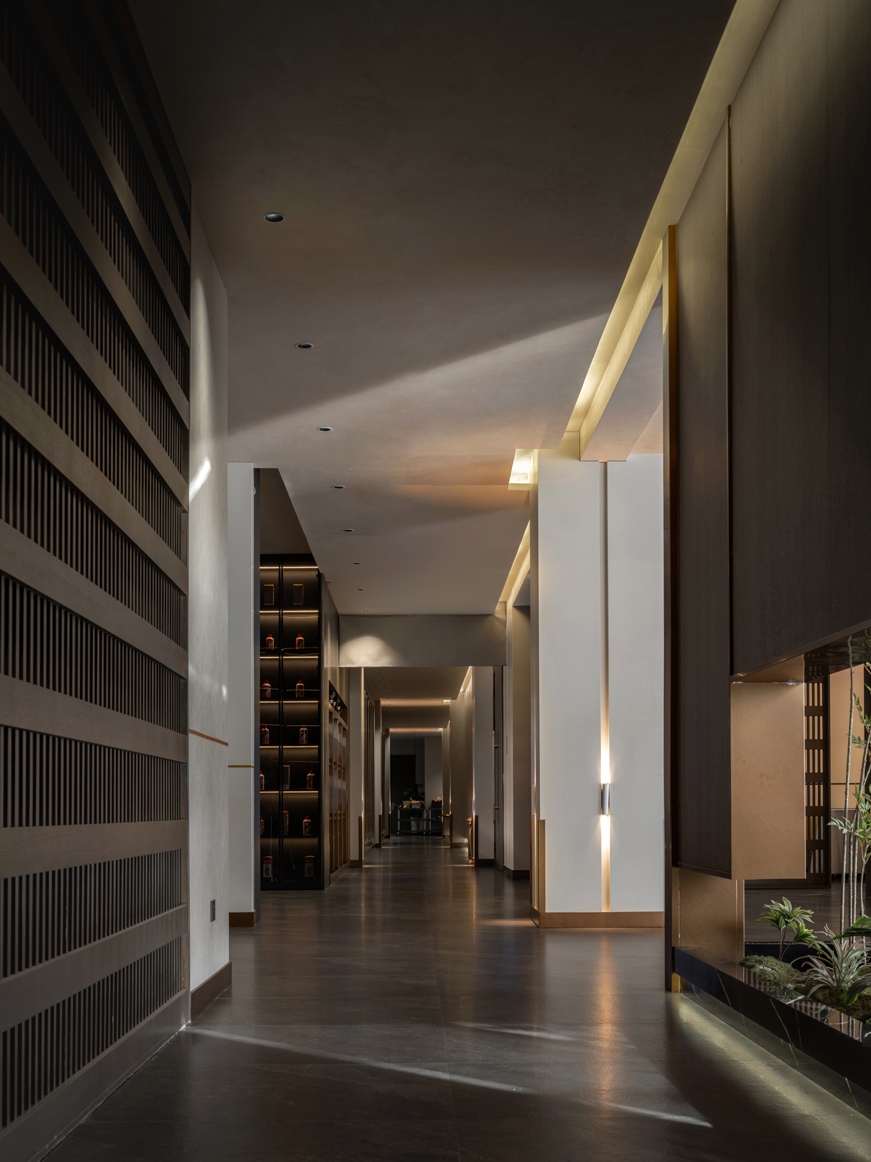 以水为灵感线索:入口处浅池映天光,走廊顶部滴泉声隐约可闻,包厢间以玻璃水幕轻柔分隔。水至柔而润物,象征空间流动贯通的生命力,暗合“水利万物而不争”的包容智慧。