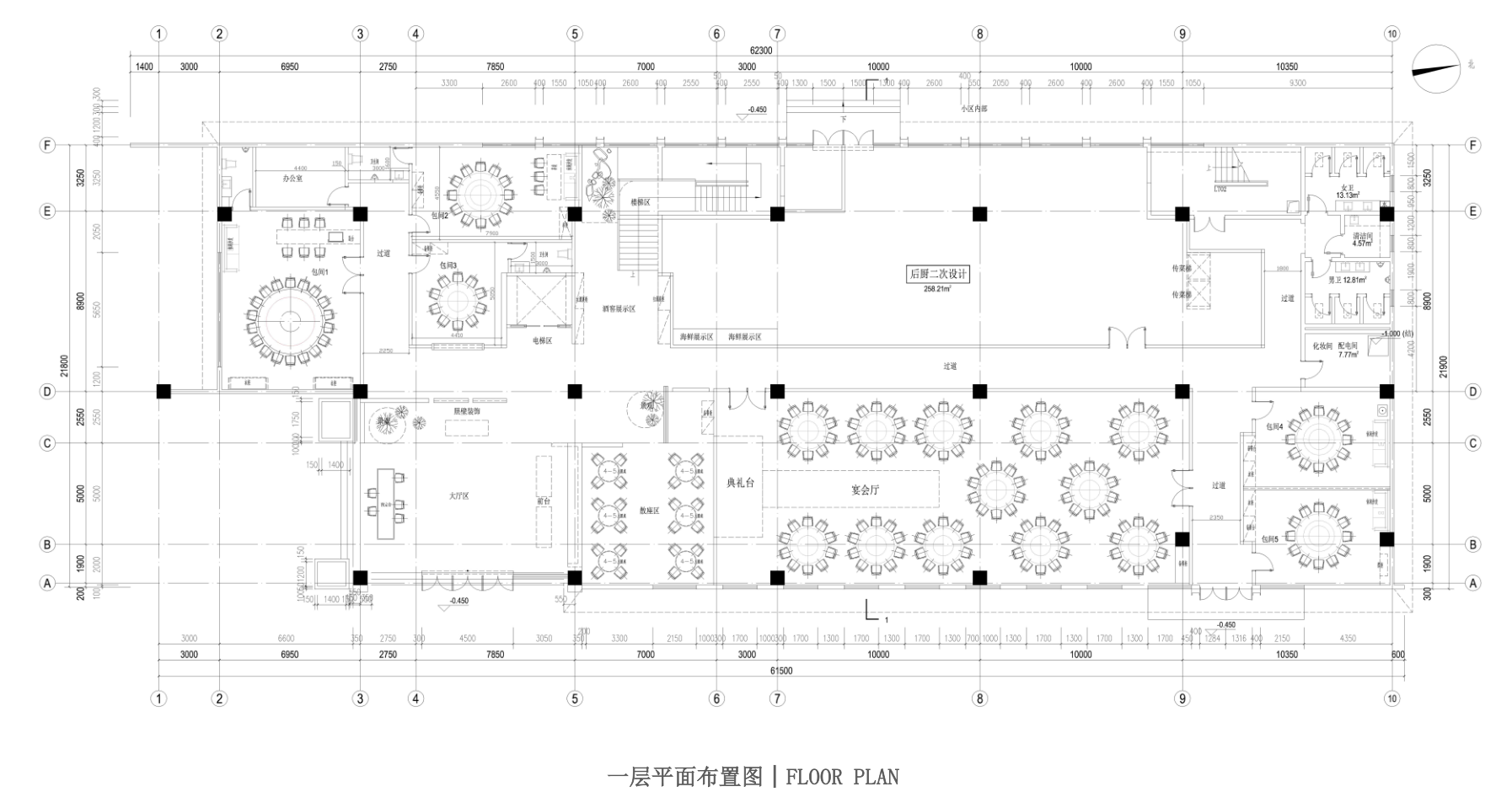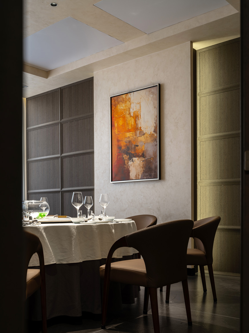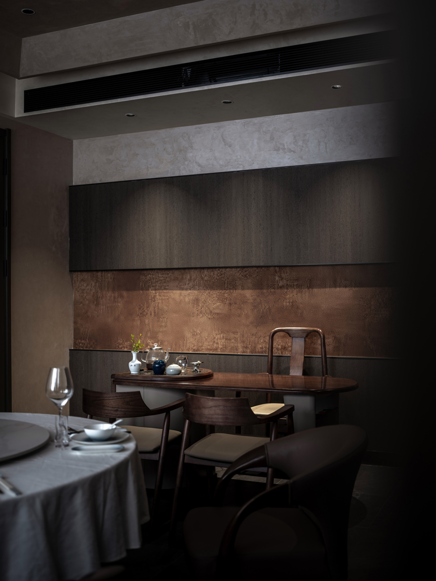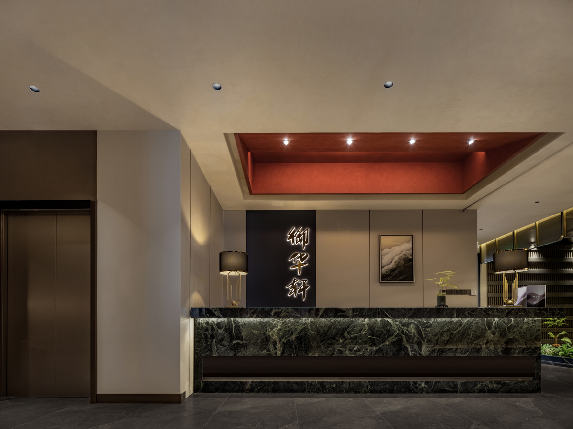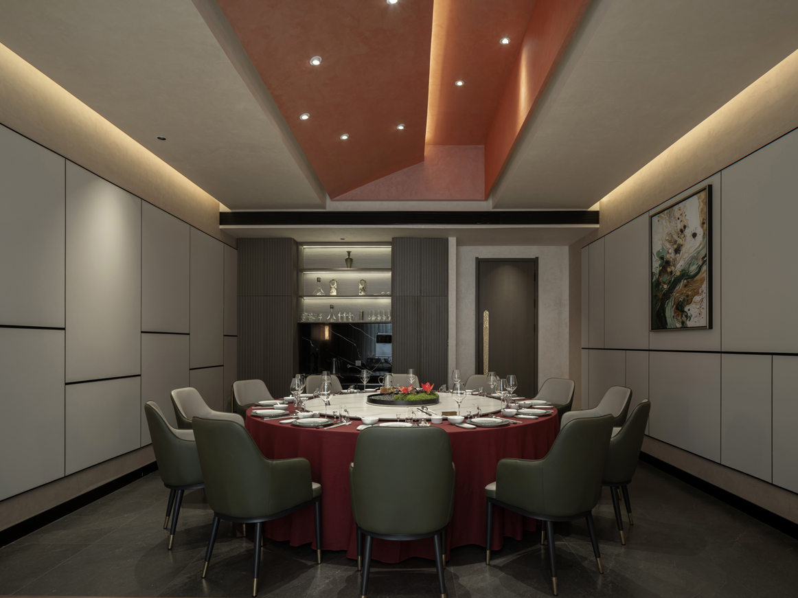 以水为灵感线索:入口处浅池映天光,走廊顶部滴泉声隐约可闻,包厢间以玻璃水幕轻柔分隔。水至柔而润物,象征空间流动贯通的生命力,暗合“水利万物而不争”的包容智慧。