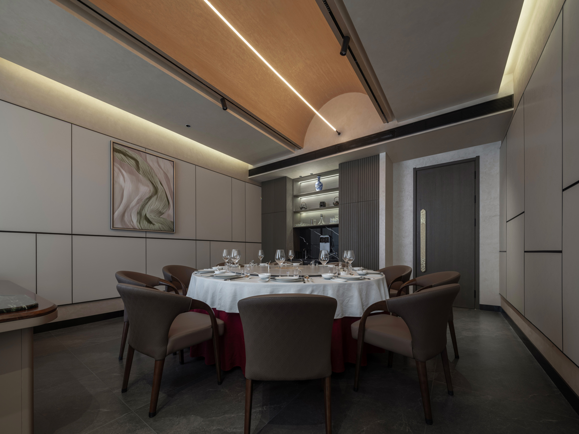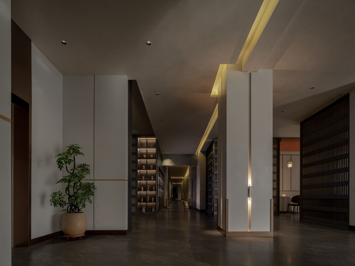 空间布局摒弃刻意的对称与僵直的线条,以柔和的曲线、错落的高度模拟山川流水的自然意态。墙体如云卷云舒,地面材质渐变似水土交融,引导客人步入“自然而然”的节奏,体会“人法地,地法天,天法道”的层次感。