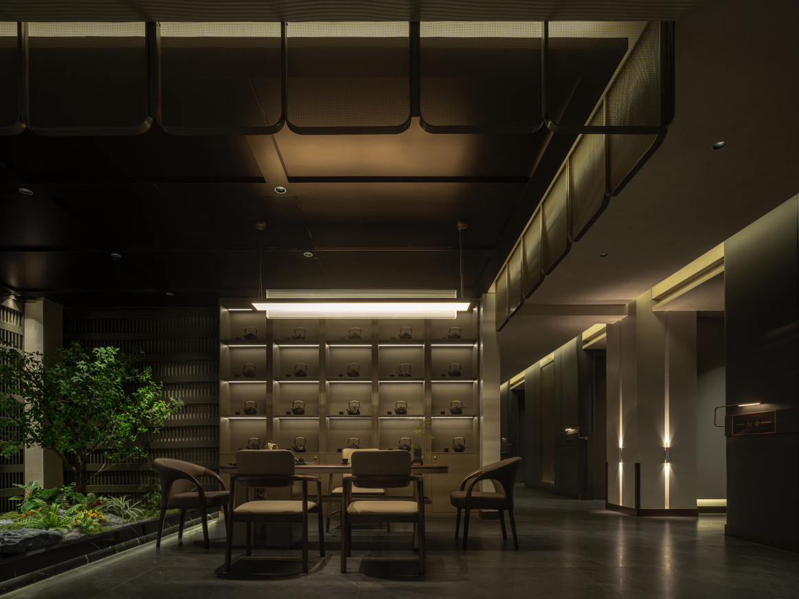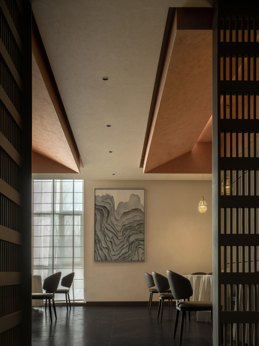 通过镂空隔断、透光材质与局部暗光处理,营造“凿户牖以为室,当其无,有室之用”的虚实哲学。光斑如溪流漫过粗陶墙面,阴影处隐含静谧,明亮处舒展生机,在“有光”与“无光”间传递空间的呼吸感。