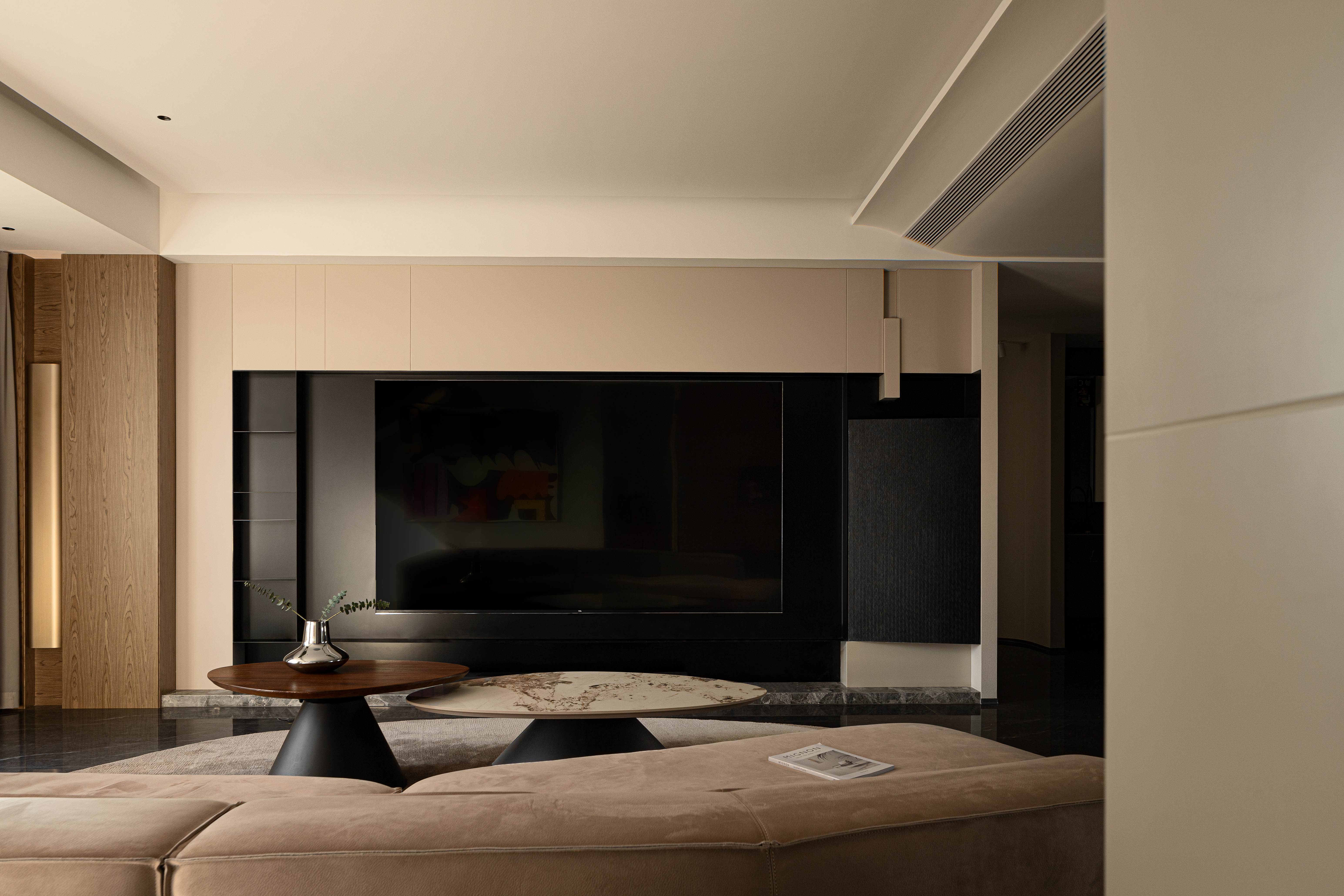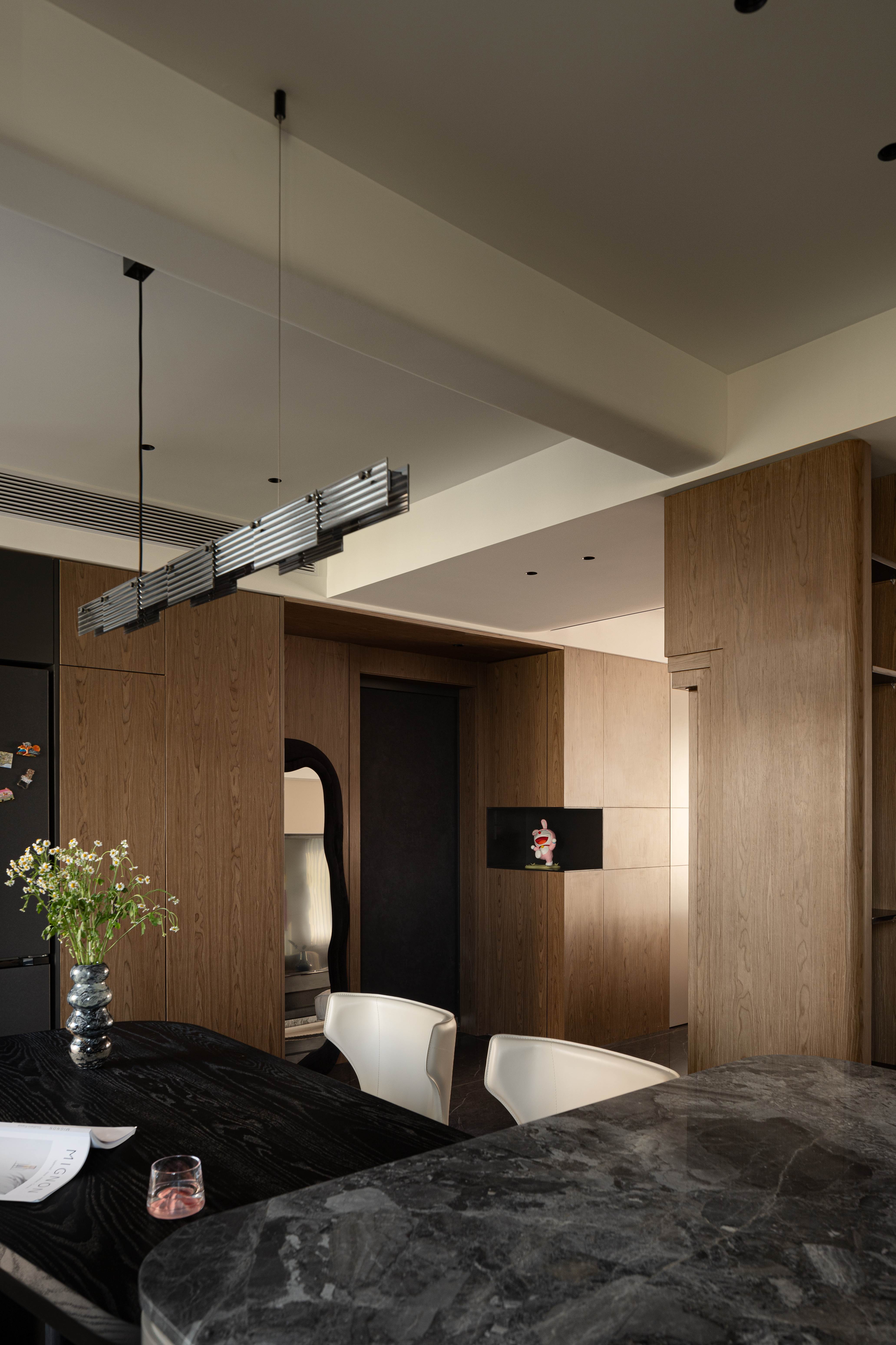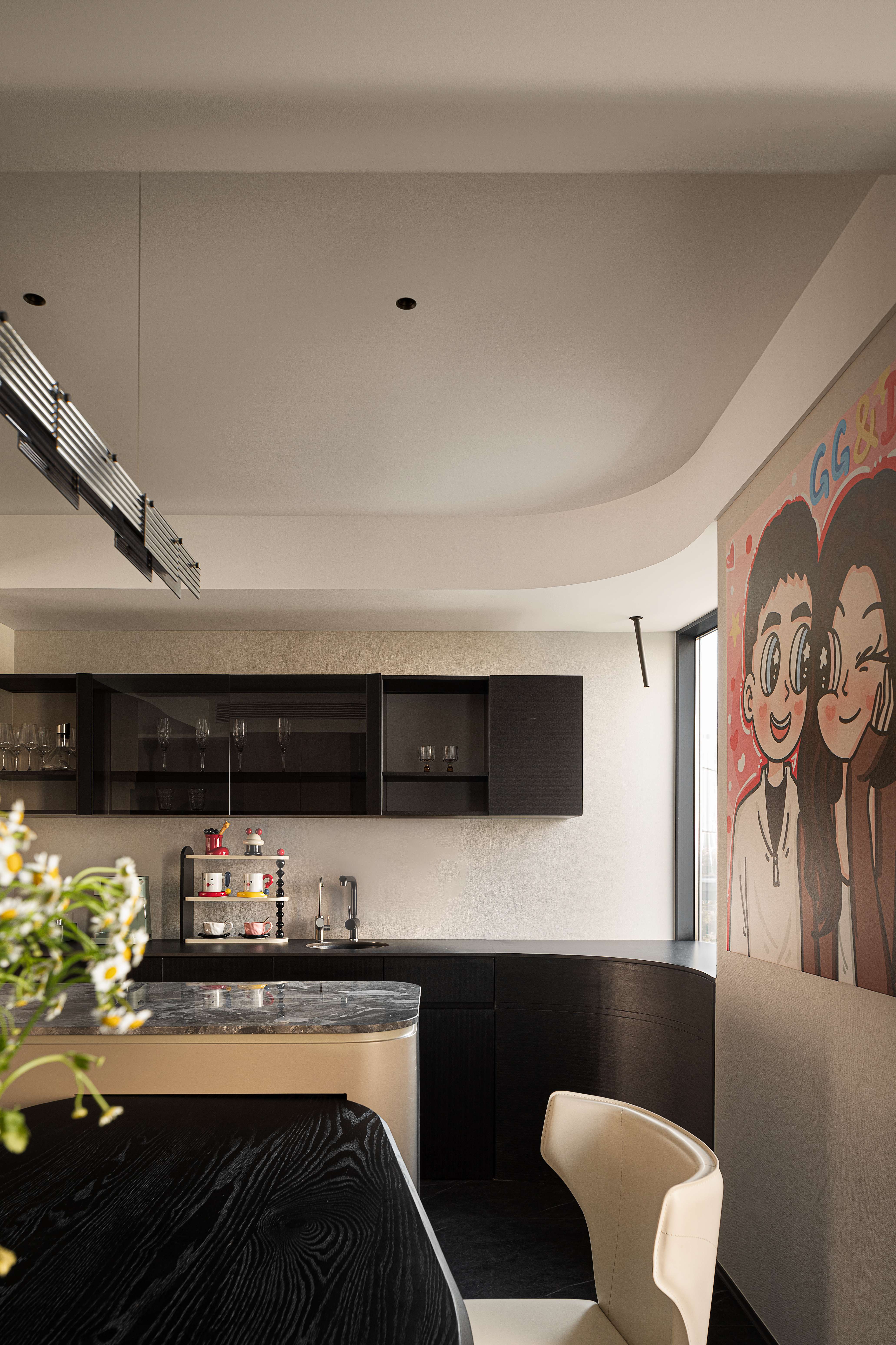 空间意境:电视墙有着独特的几何结构,在实用性、观赏性、趣味性中找到平衡;餐桌边配备西厨吧台,超长的餐边柜带有水吧功能,吊顶、西厨柜随着原始弧形的墙面围绕展开,带来一种柔和、松弛的空间氛围;中厨保持同样的色彩基调,功能配备齐全,顶面搭配长条的软膜天花灯,带来柔和均匀的采光。