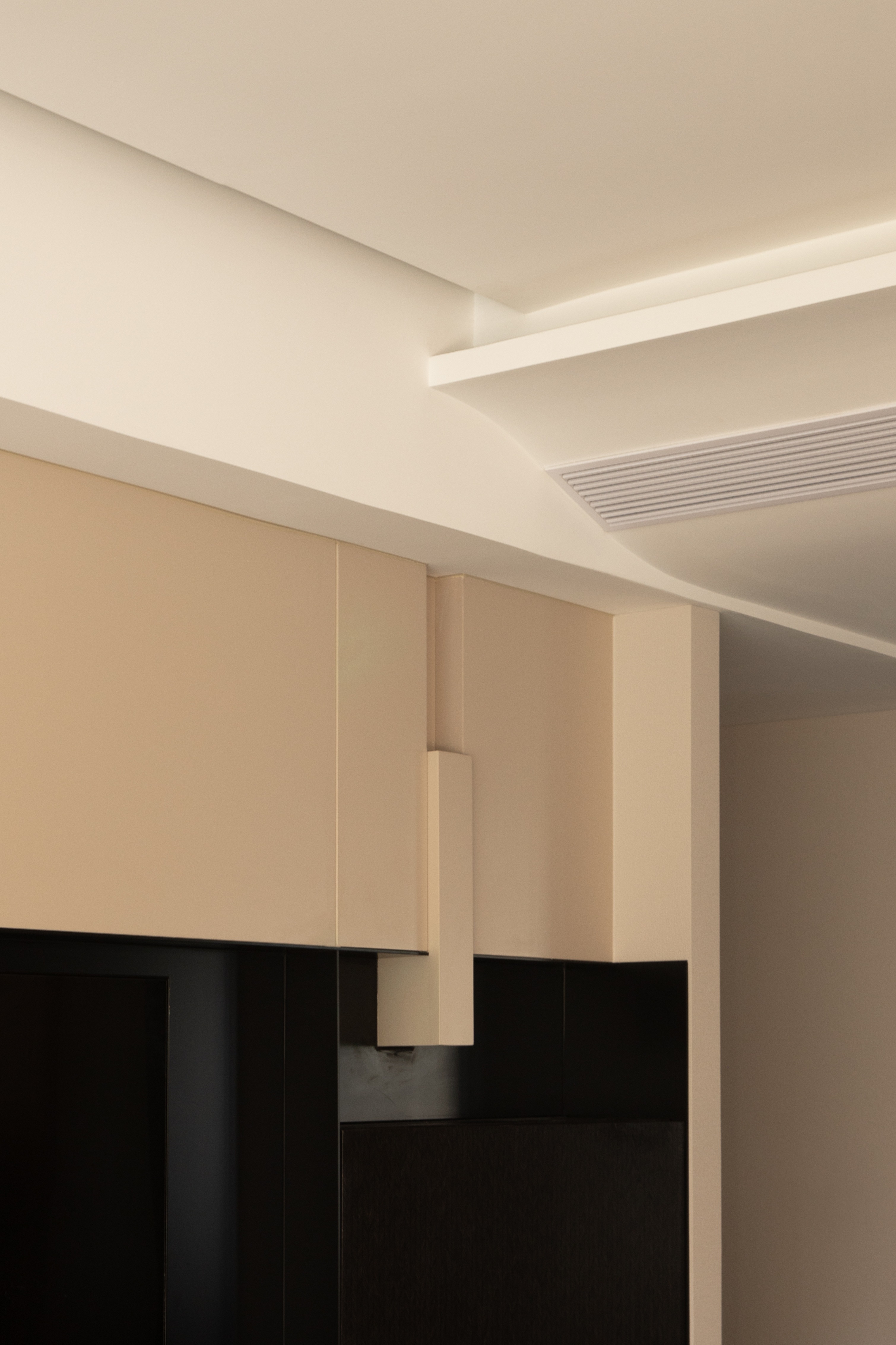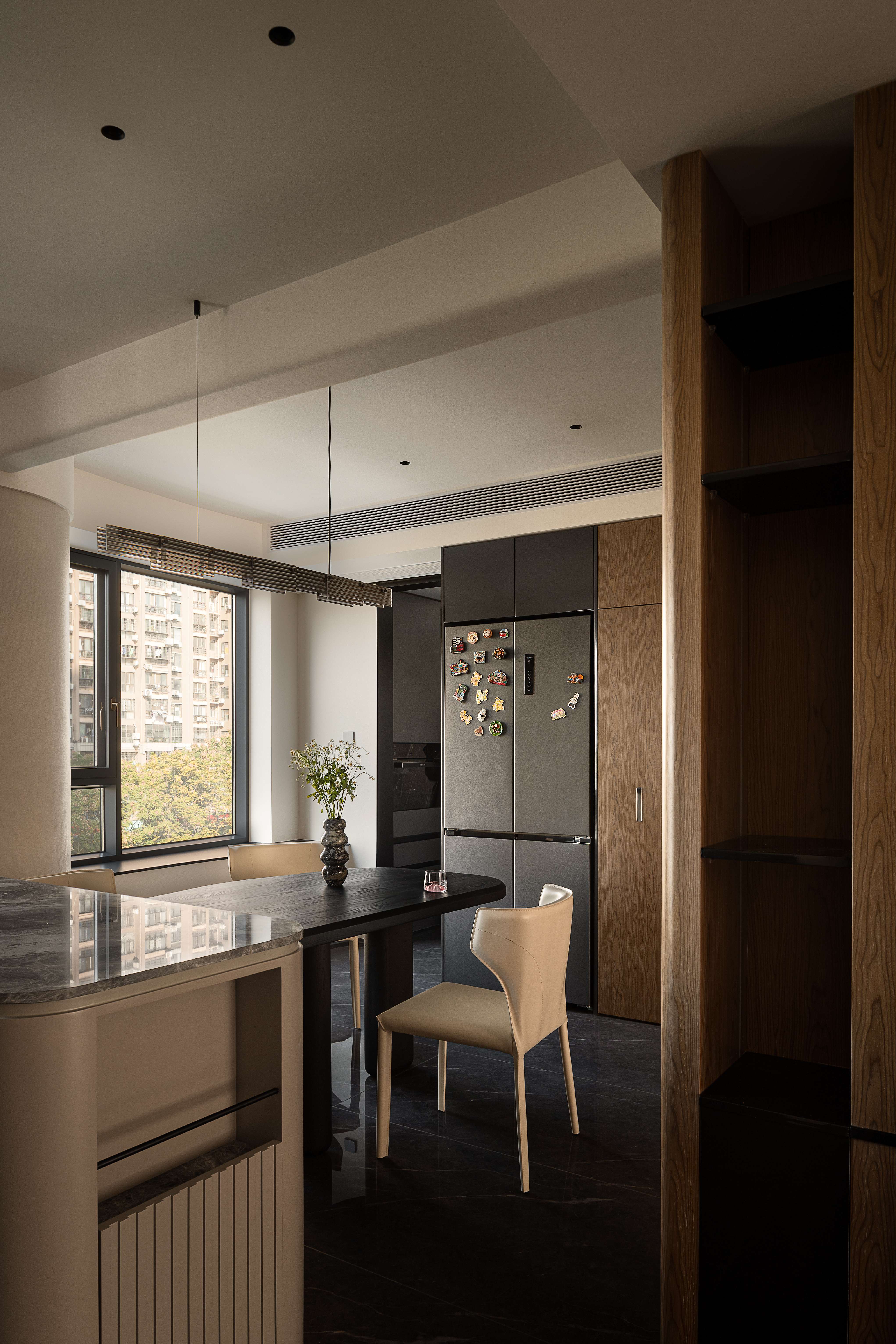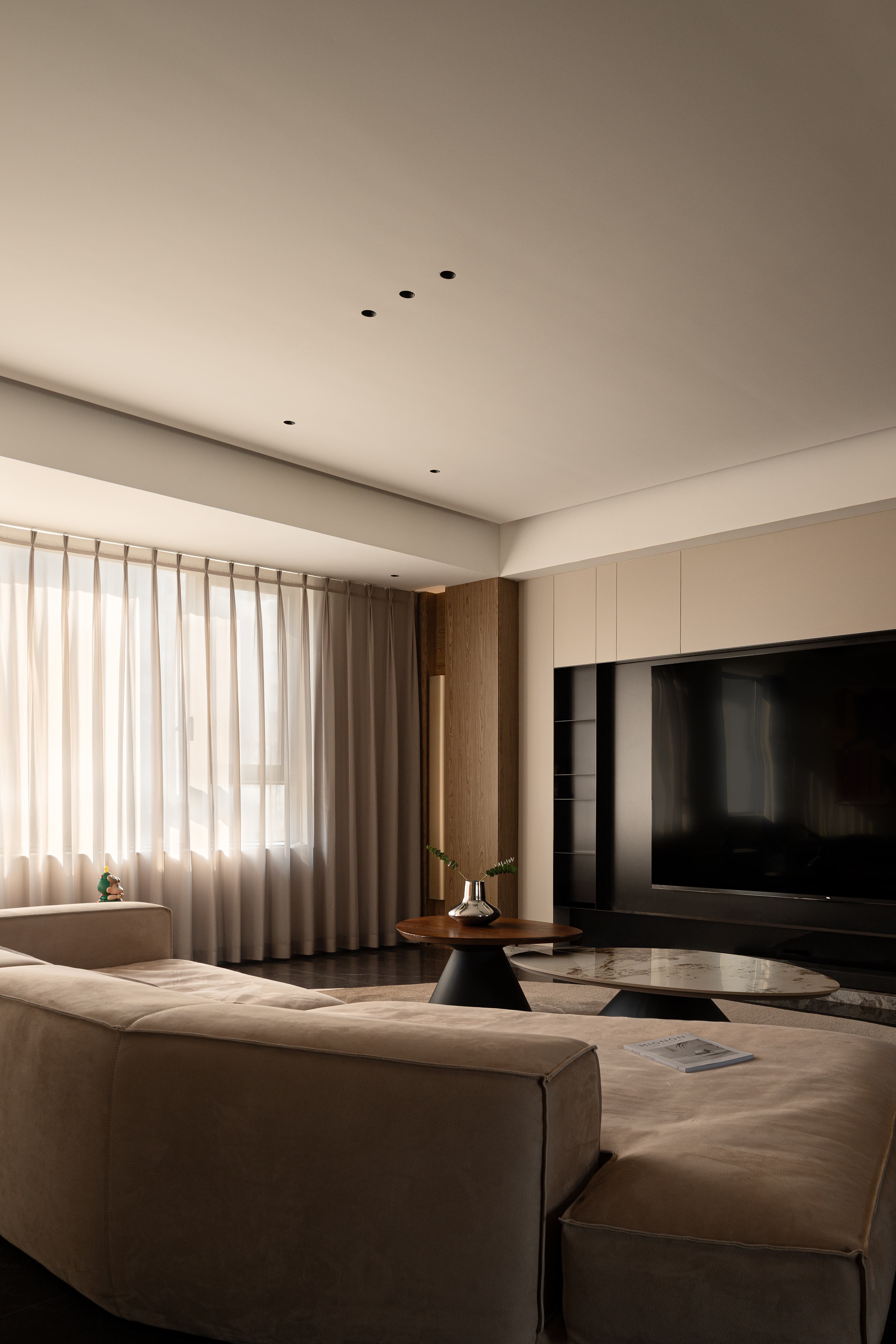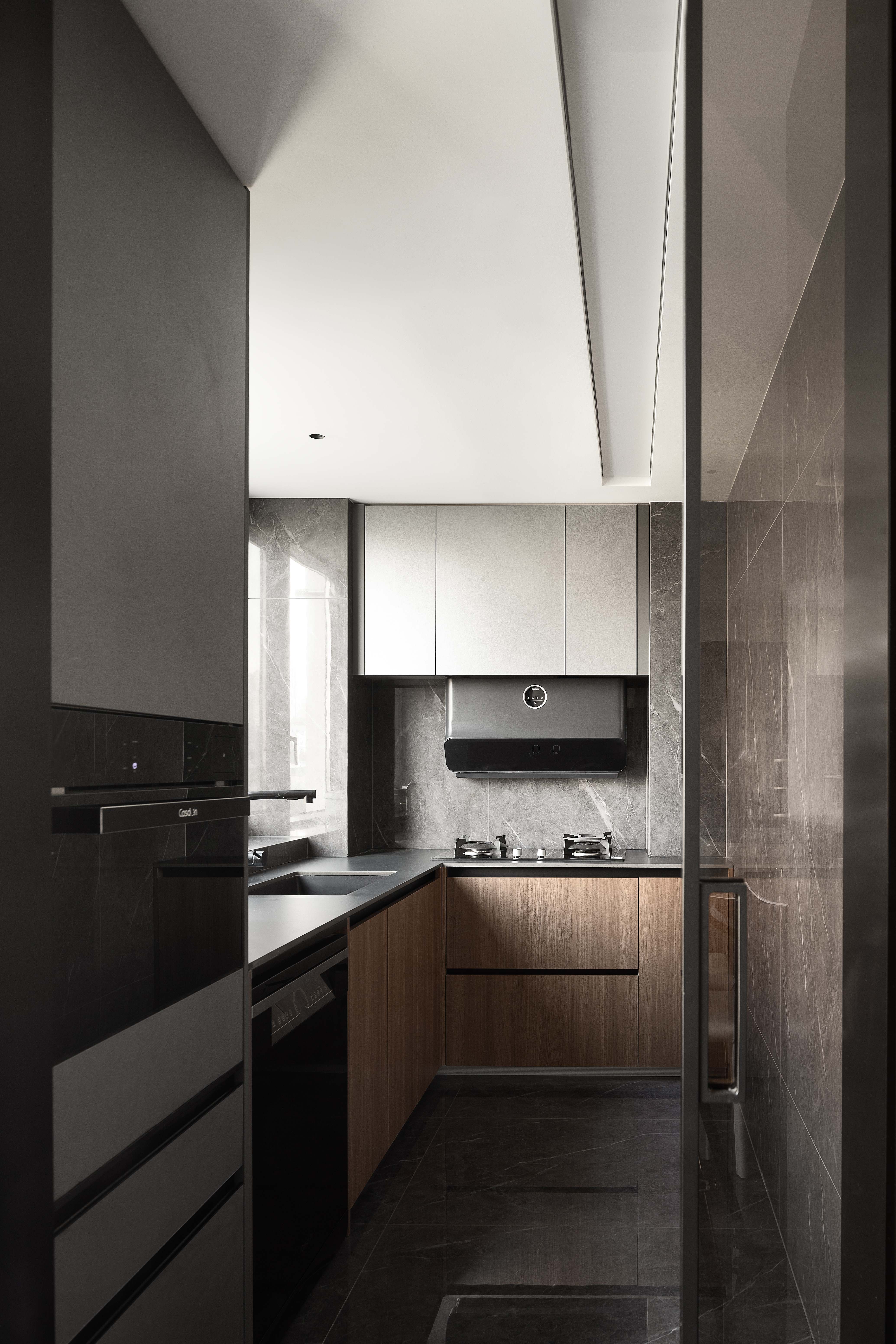 空间意境:电视墙有着独特的几何结构,在实用性、观赏性、趣味性中找到平衡;餐桌边配备西厨吧台,超长的餐边柜带有水吧功能,吊顶、西厨柜随着原始弧形的墙面围绕展开,带来一种柔和、松弛的空间氛围;中厨保持同样的色彩基调,功能配备齐全,顶面搭配长条的软膜天花灯,带来柔和均匀的采光。