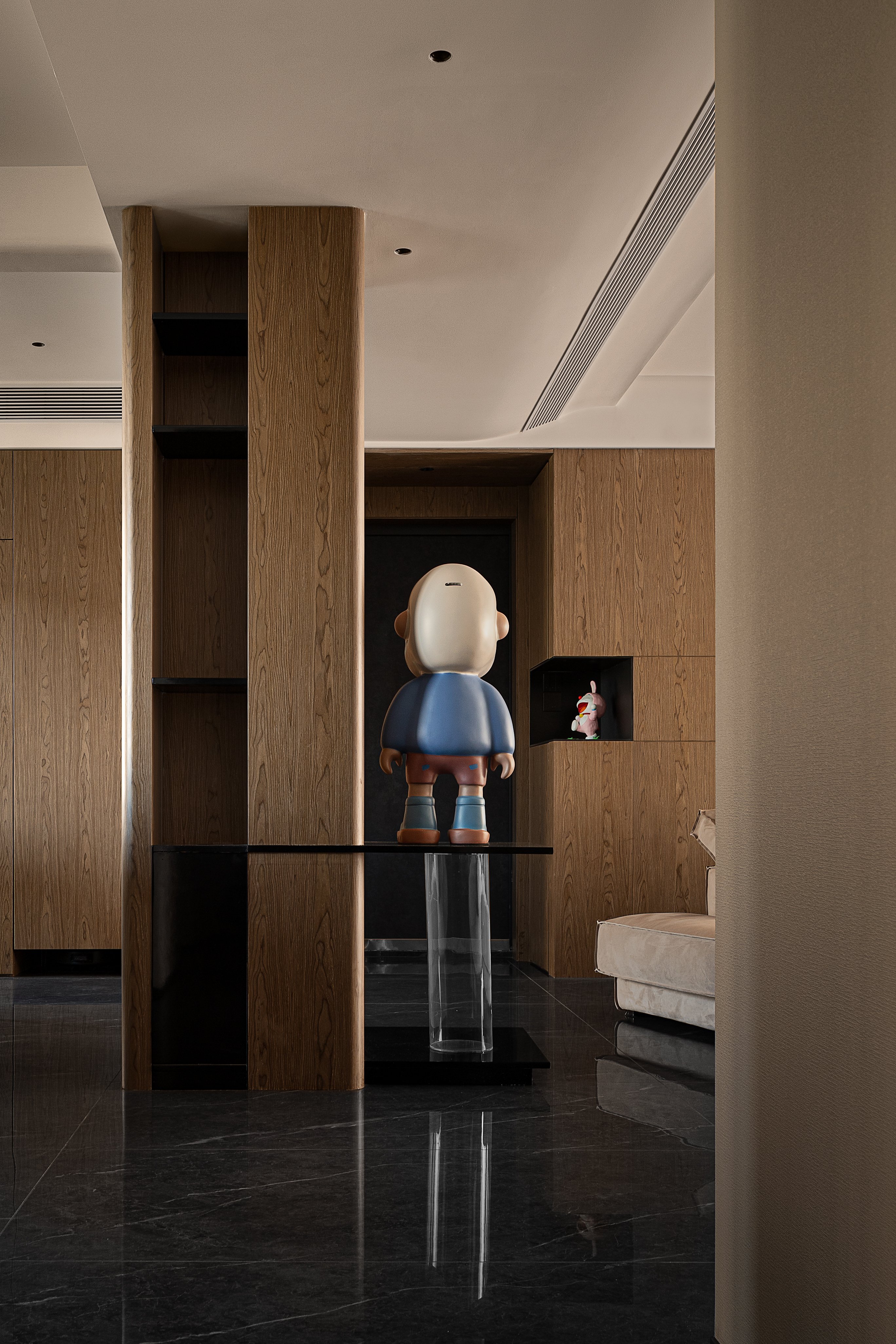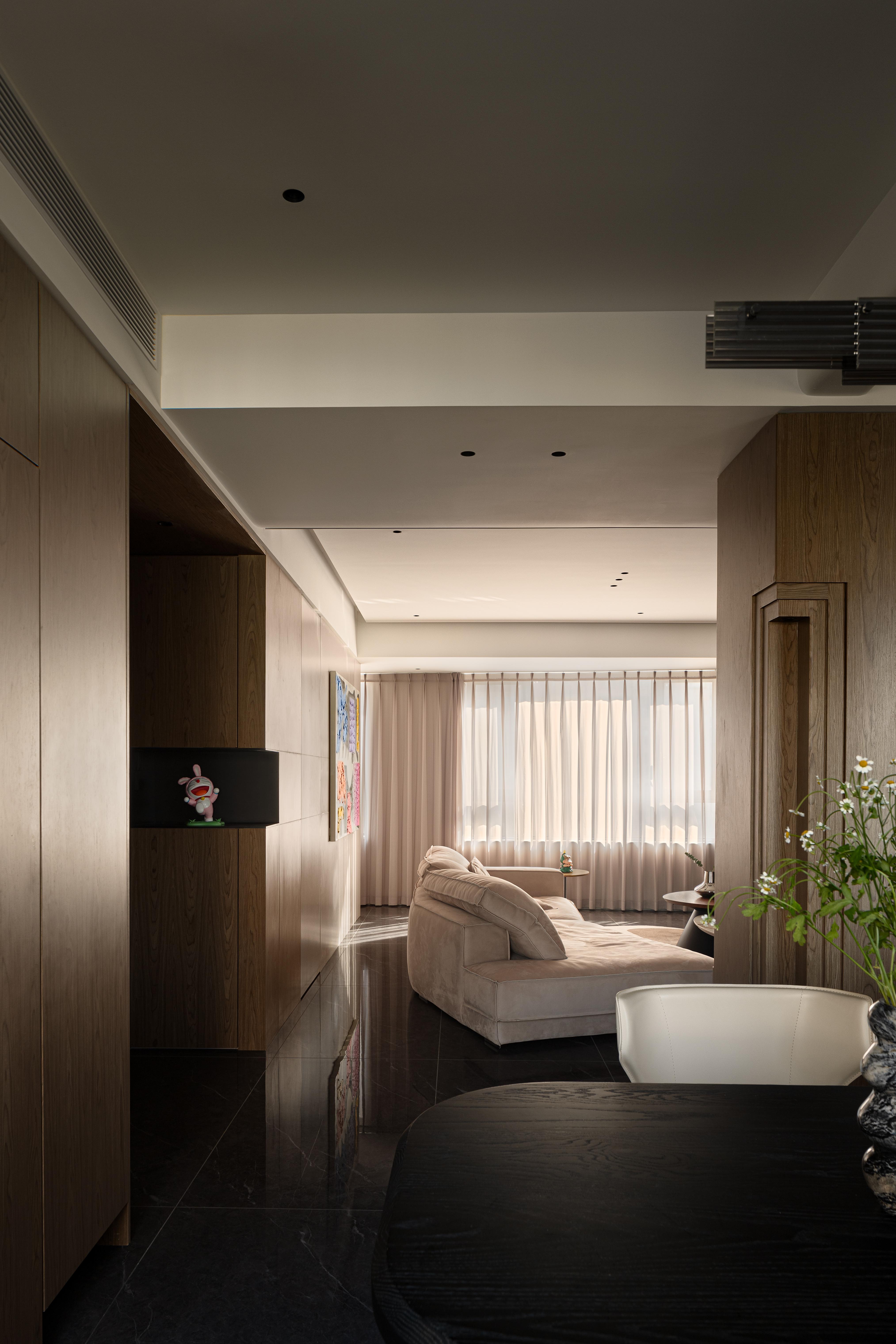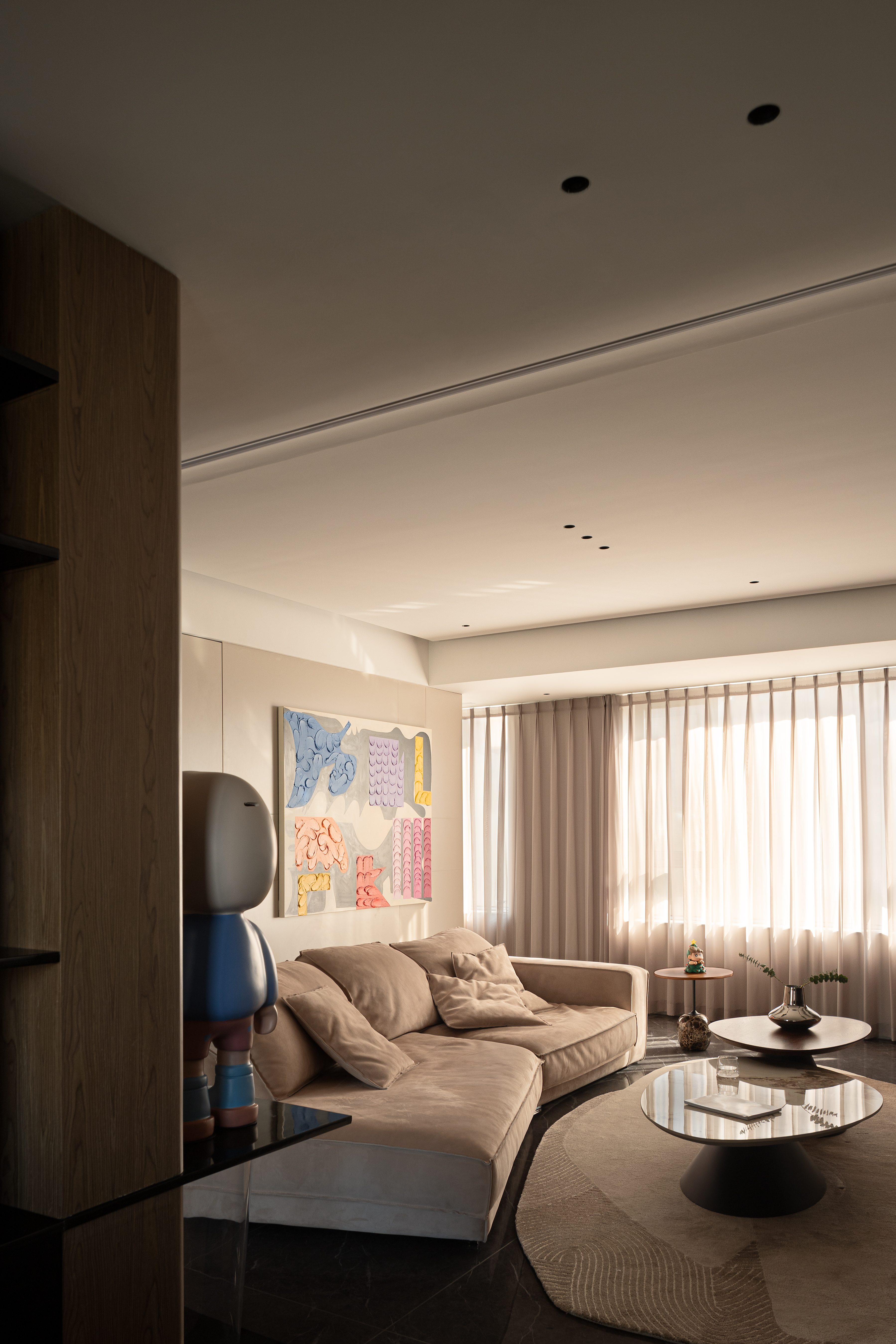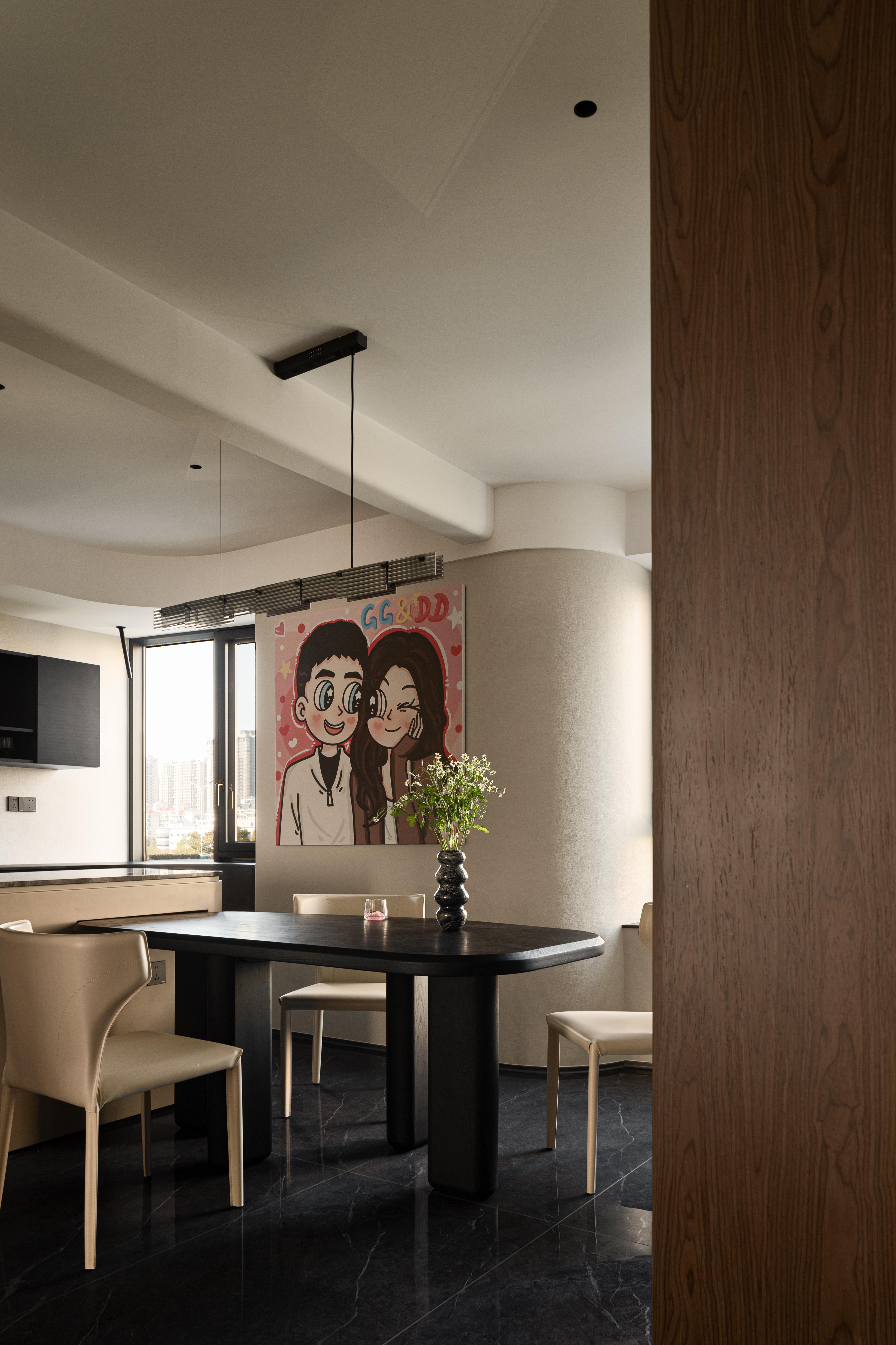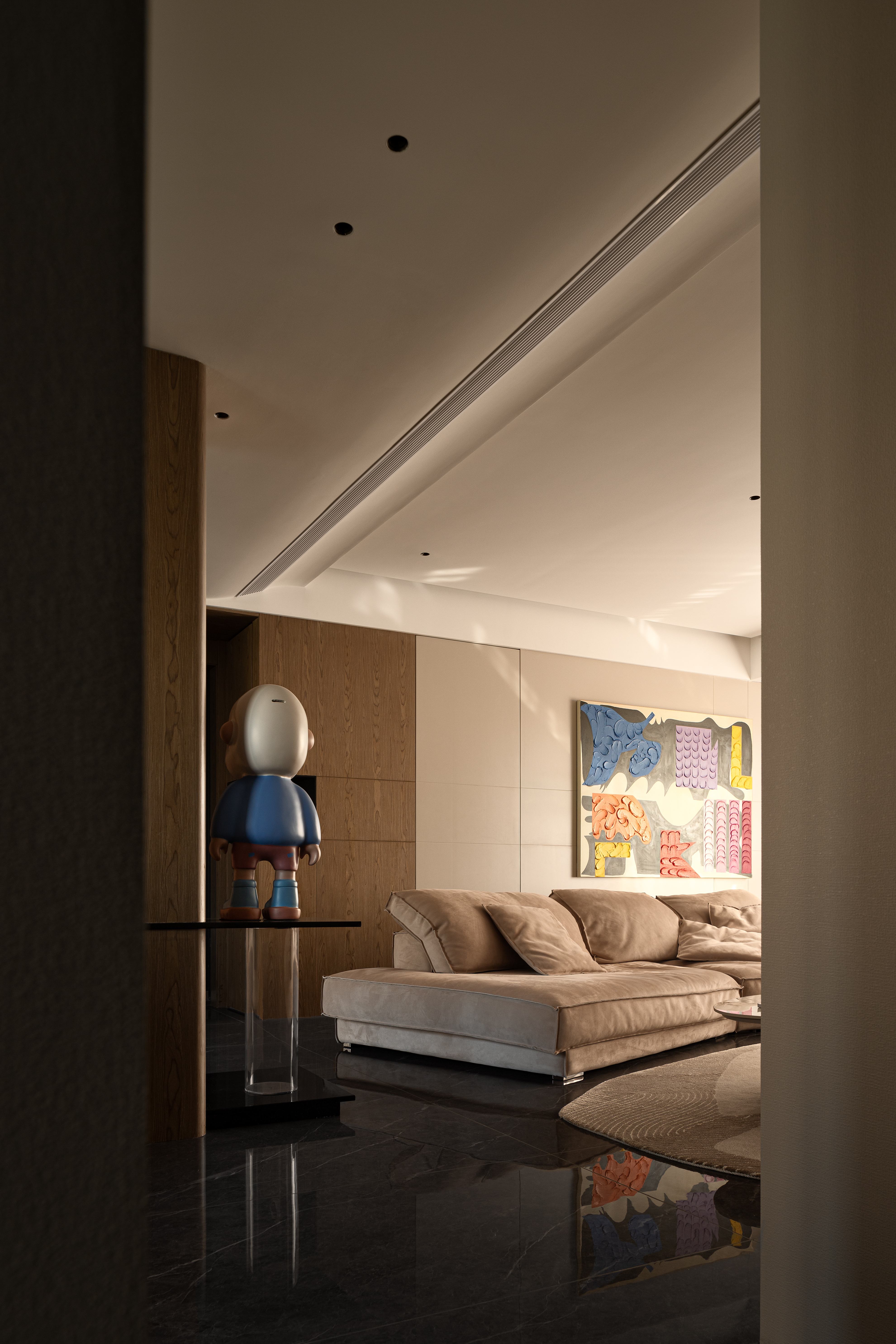 空间布局:安藤忠雄曾说:“当柱子墙体和单个的建筑要素被置于相互联系中时,风景逐渐开始显示出一种更高层次的建筑性品质。”从进门起始,视线就会被拥有利落转折块面的柱子所吸引,卡通雕塑被轻盈的亚克力柱托起,原本处境尴尬的柱子,随着弧面吊顶的柔和过度,理性与感性的交织,克制的色彩,硬朗的造型,因回型动线而显得灵动,不同的材质在这里糅合,围绕柱体四面各有各的风景。大横厅的布局带来可随意行走的流畅动线,家人间的交流也成为轻而易举的事。