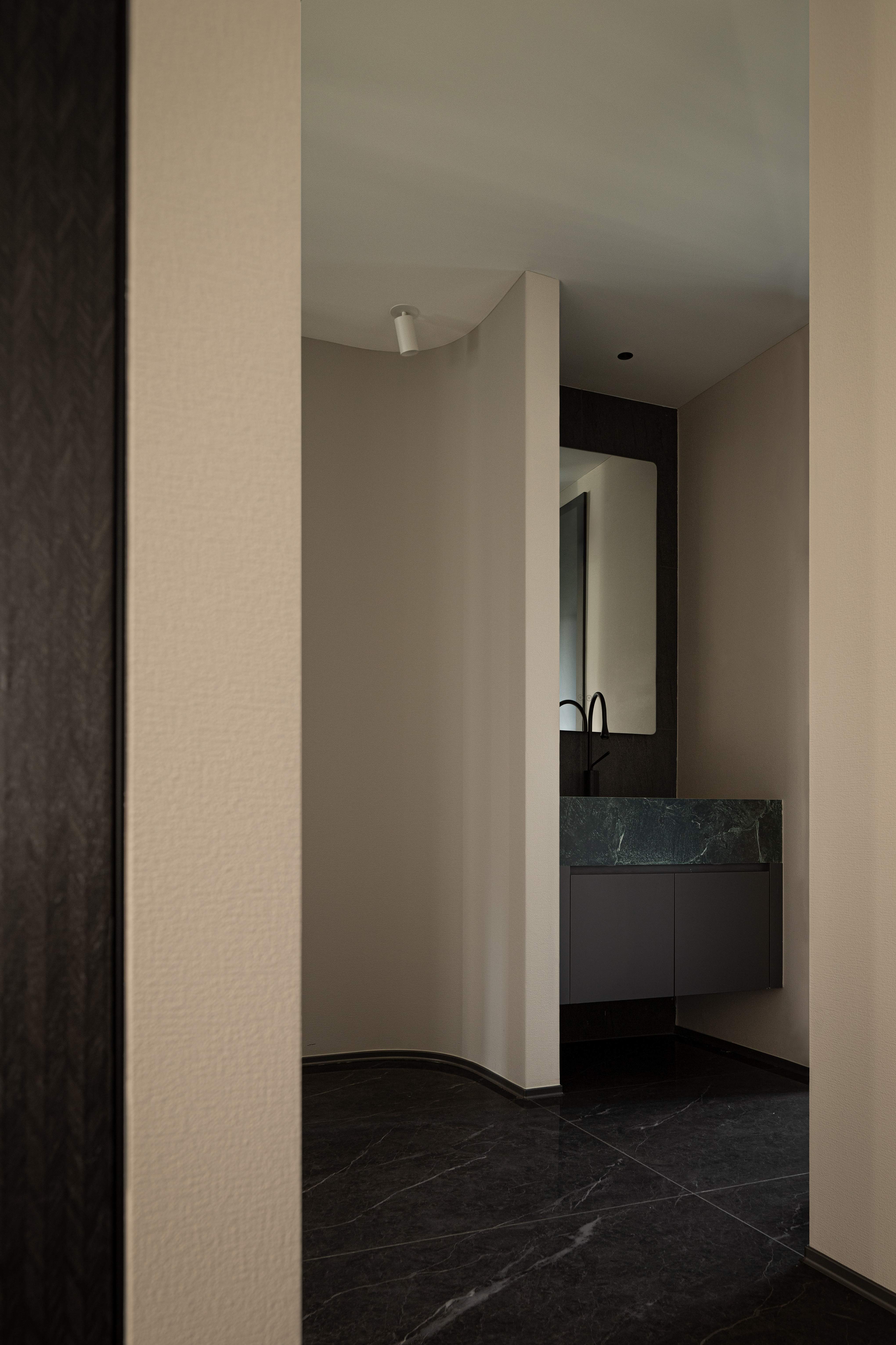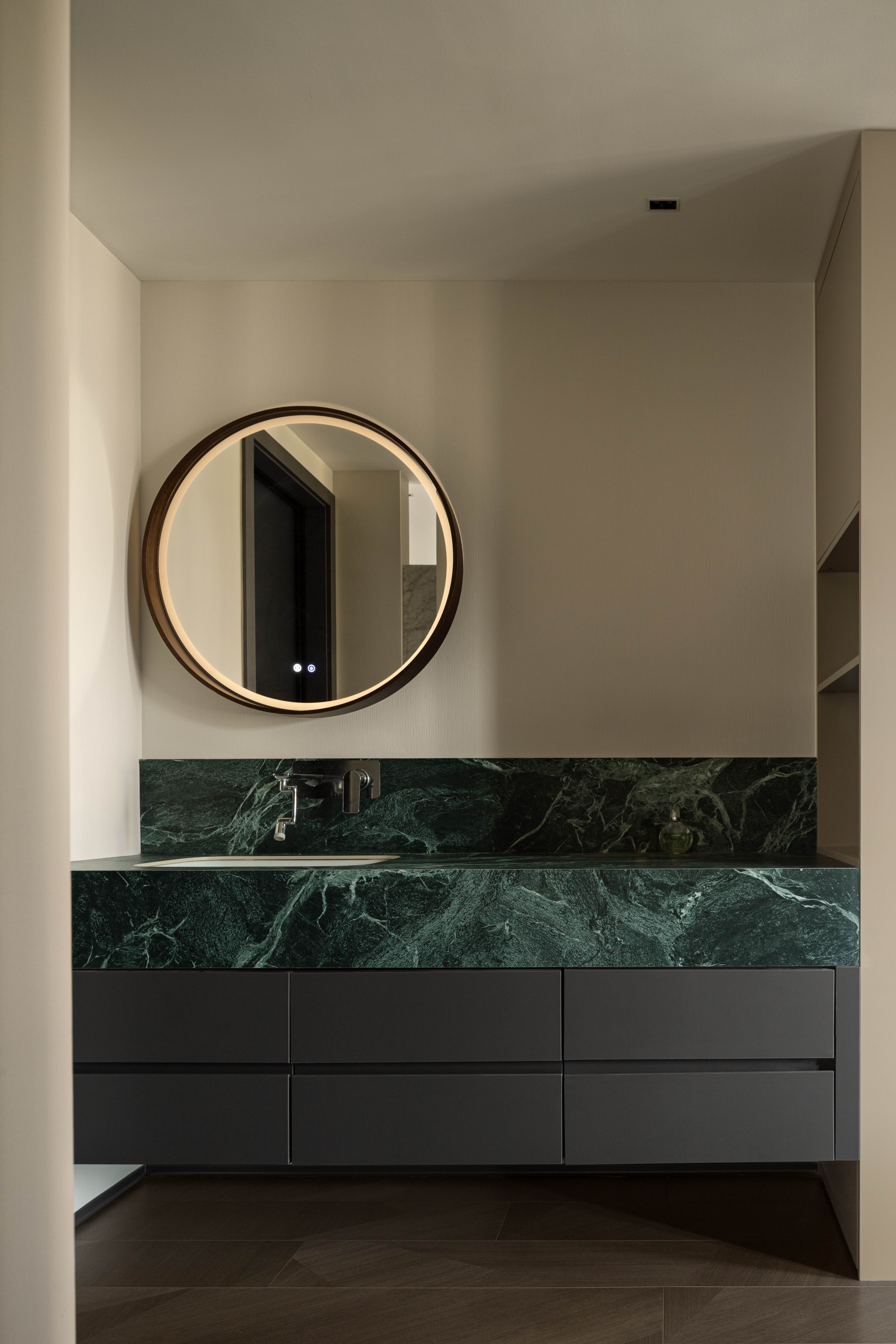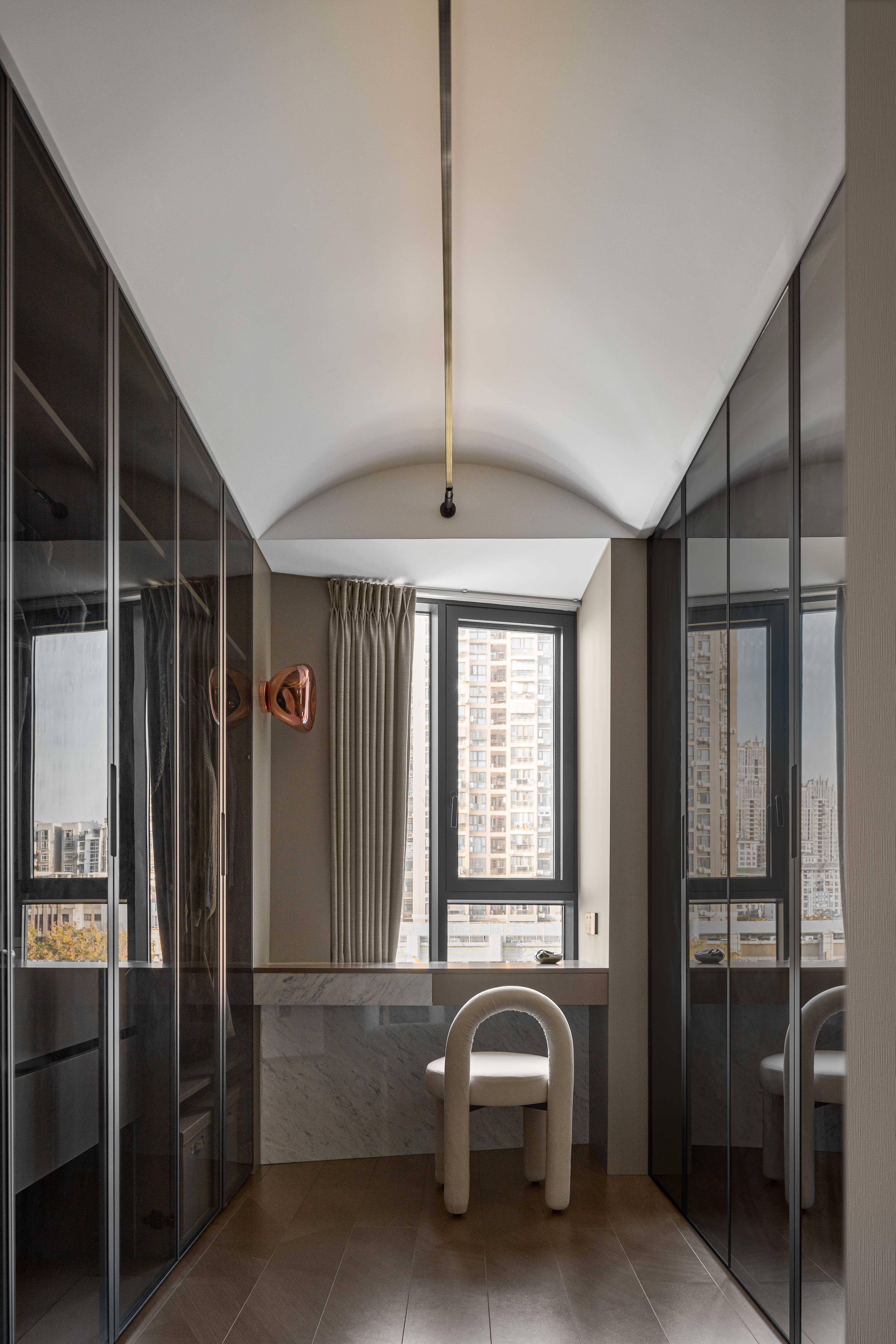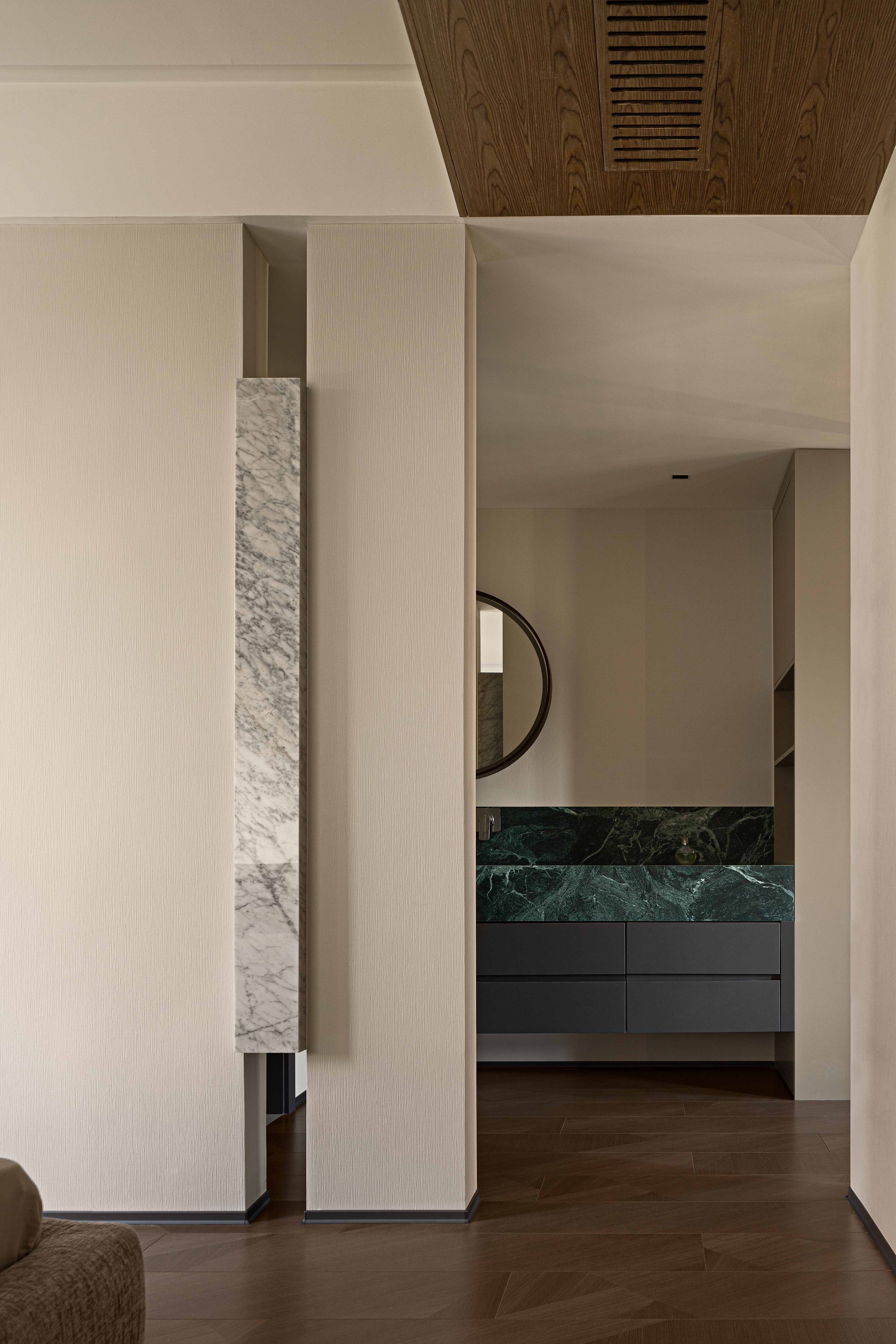 设计选材:经过中心柱体,走廊的弧度分割出次卫干区,也引导视线进入主卧;主卧用木色体块划分空间,使偏移的中轴线得到平衡,并将视线延伸到更隐秘的空间,墙体的空隙拉开空间层次,普拉达绿退于其后带来低调奢华的质感,超长的洗手台收纳满分;衣帽间隐秘而不单调,一根黑色的极简天机灯贯穿弧面吊顶,递进空间纵深感,阵列式镜面玻璃金属衣柜在视觉上扩宽空间感。