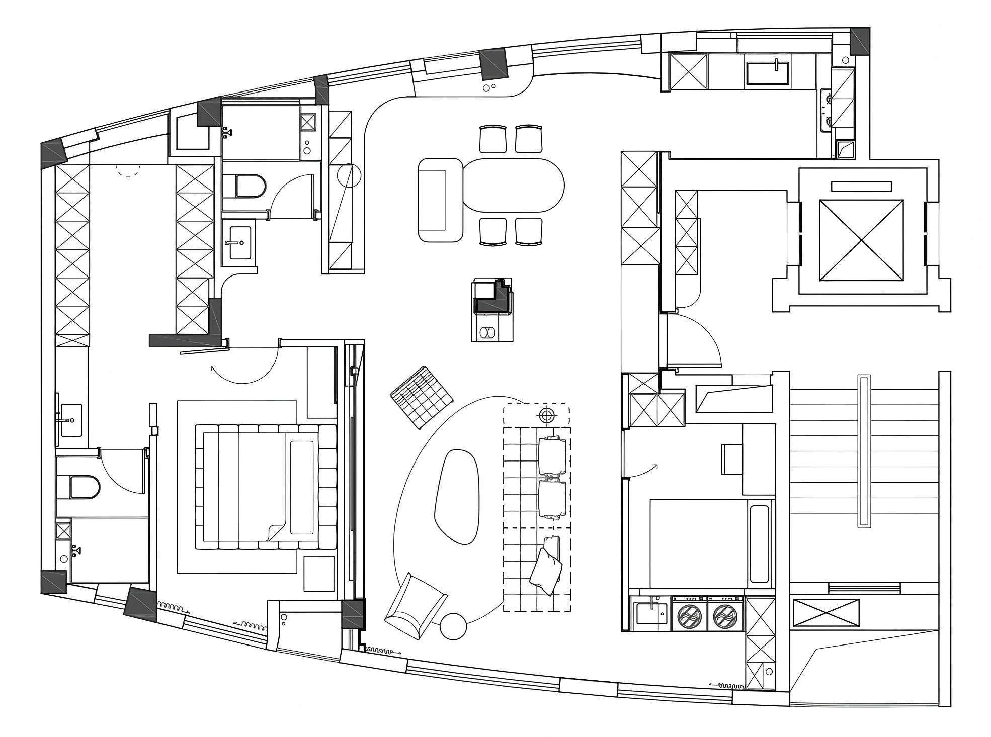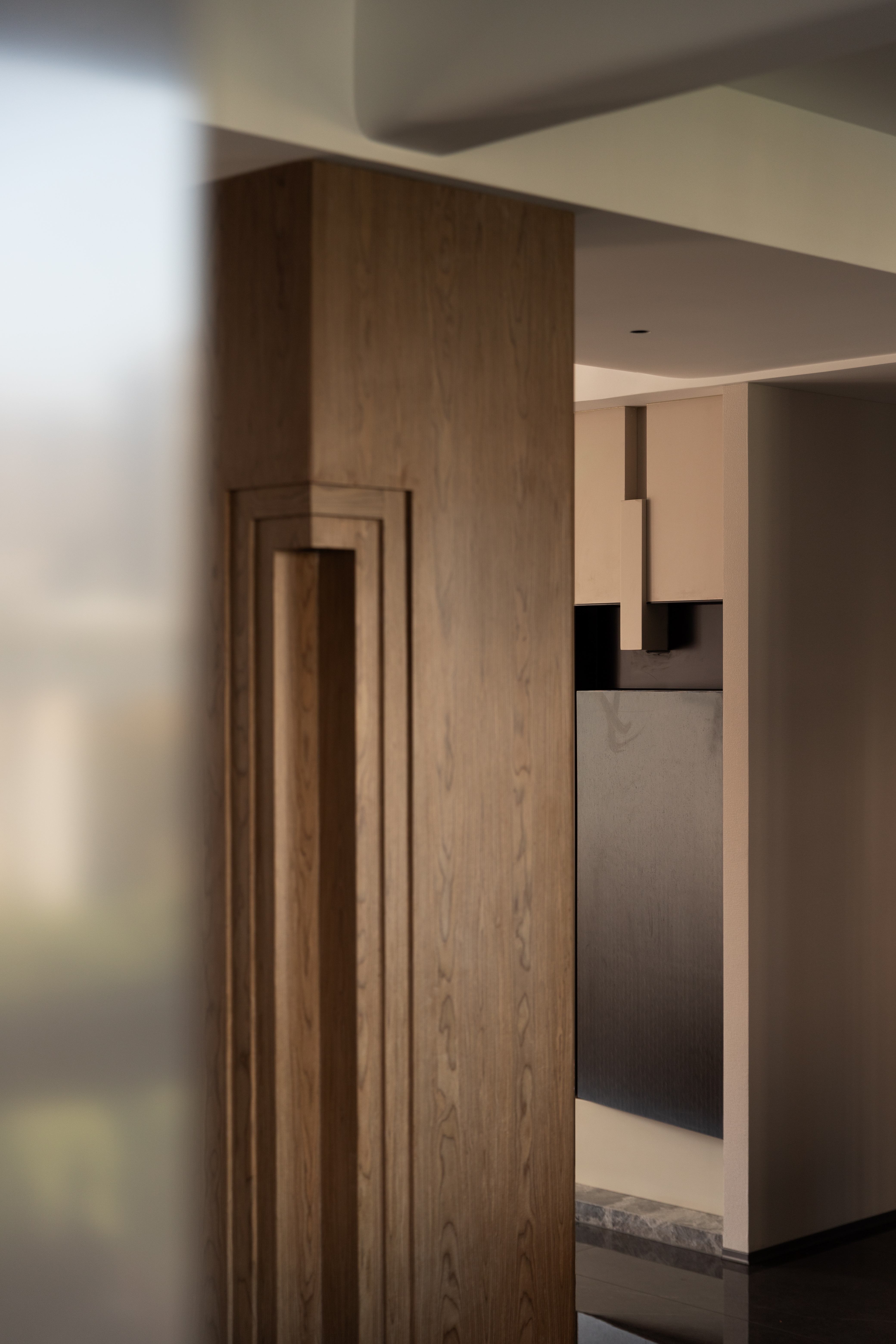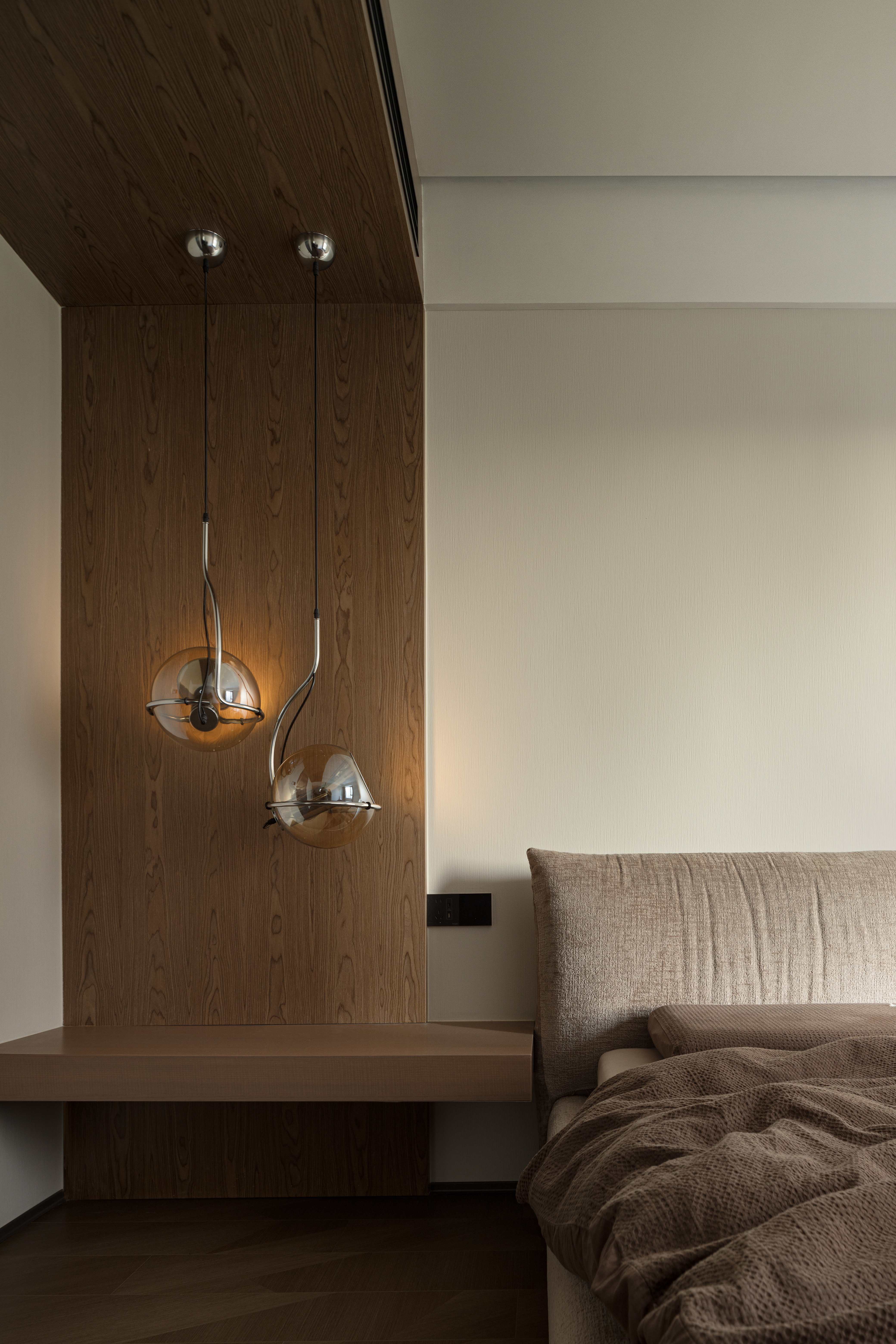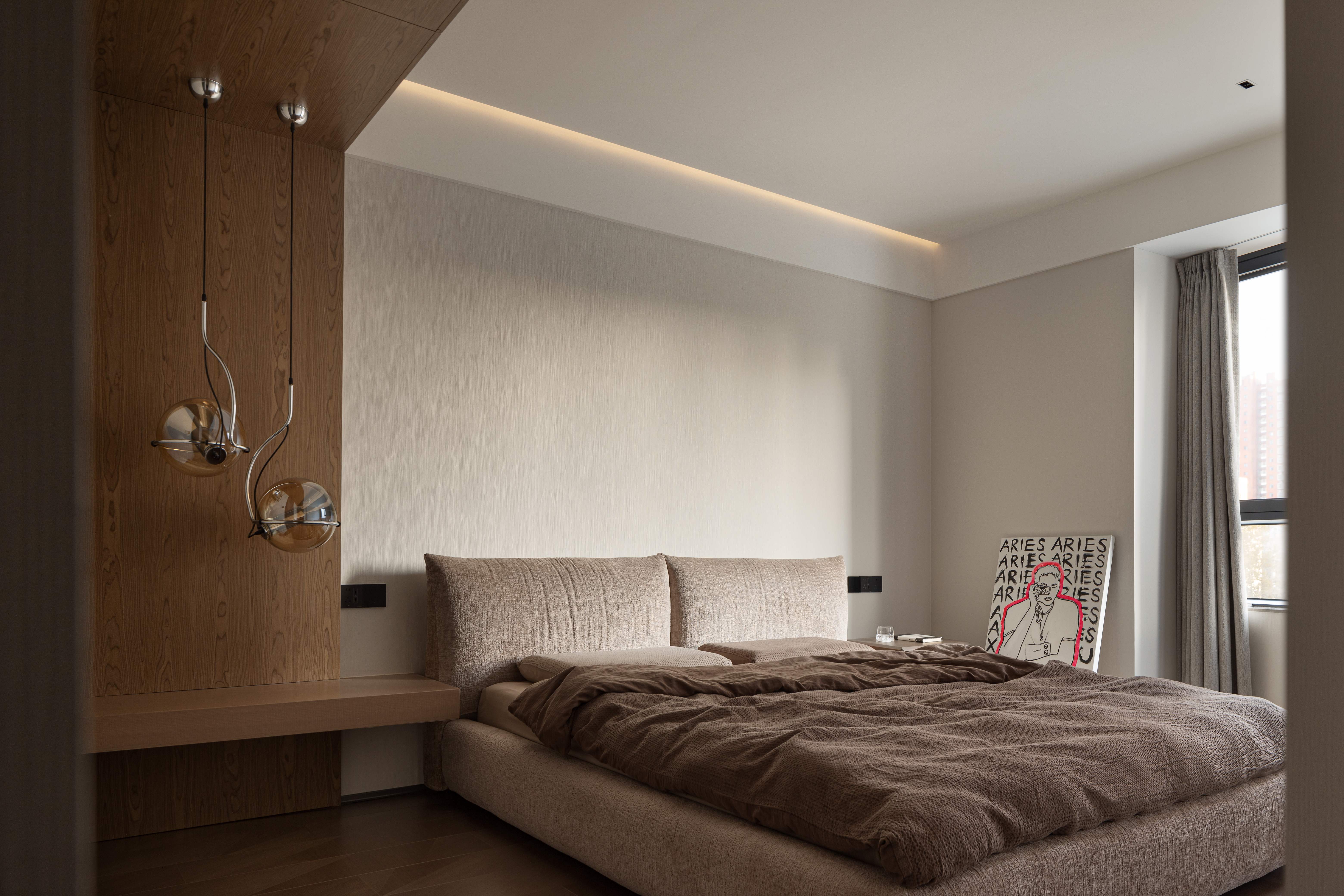 设计选材:经过中心柱体,走廊的弧度分割出次卫干区,也引导视线进入主卧;主卧用木色体块划分空间,使偏移的中轴线得到平衡,并将视线延伸到更隐秘的空间,墙体的空隙拉开空间层次,普拉达绿退于其后带来低调奢华的质感,超长的洗手台收纳满分;衣帽间隐秘而不单调,一根黑色的极简天机灯贯穿弧面吊顶,递进空间纵深感,阵列式镜面玻璃金属衣柜在视觉上扩宽空间感。