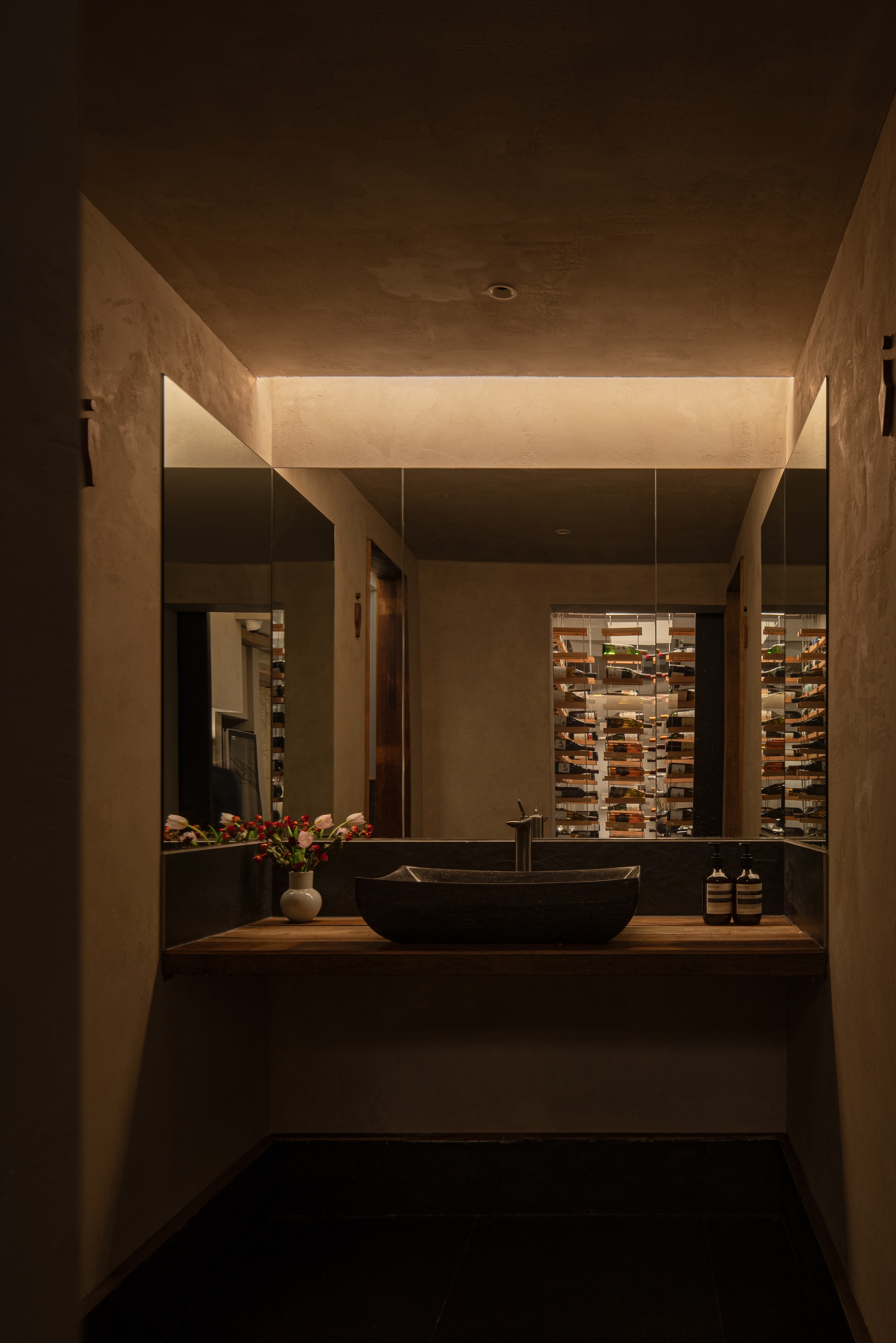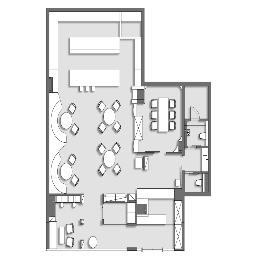 厨房、甜品间、板岛前台 及酒窖 呈近场布局。这种紧凑关系保障了从烹饪、摆盘到侍酒环节的绝对新鲜与节奏同步,是Chef“对完整用餐体验负责”信念的空间体现。 -