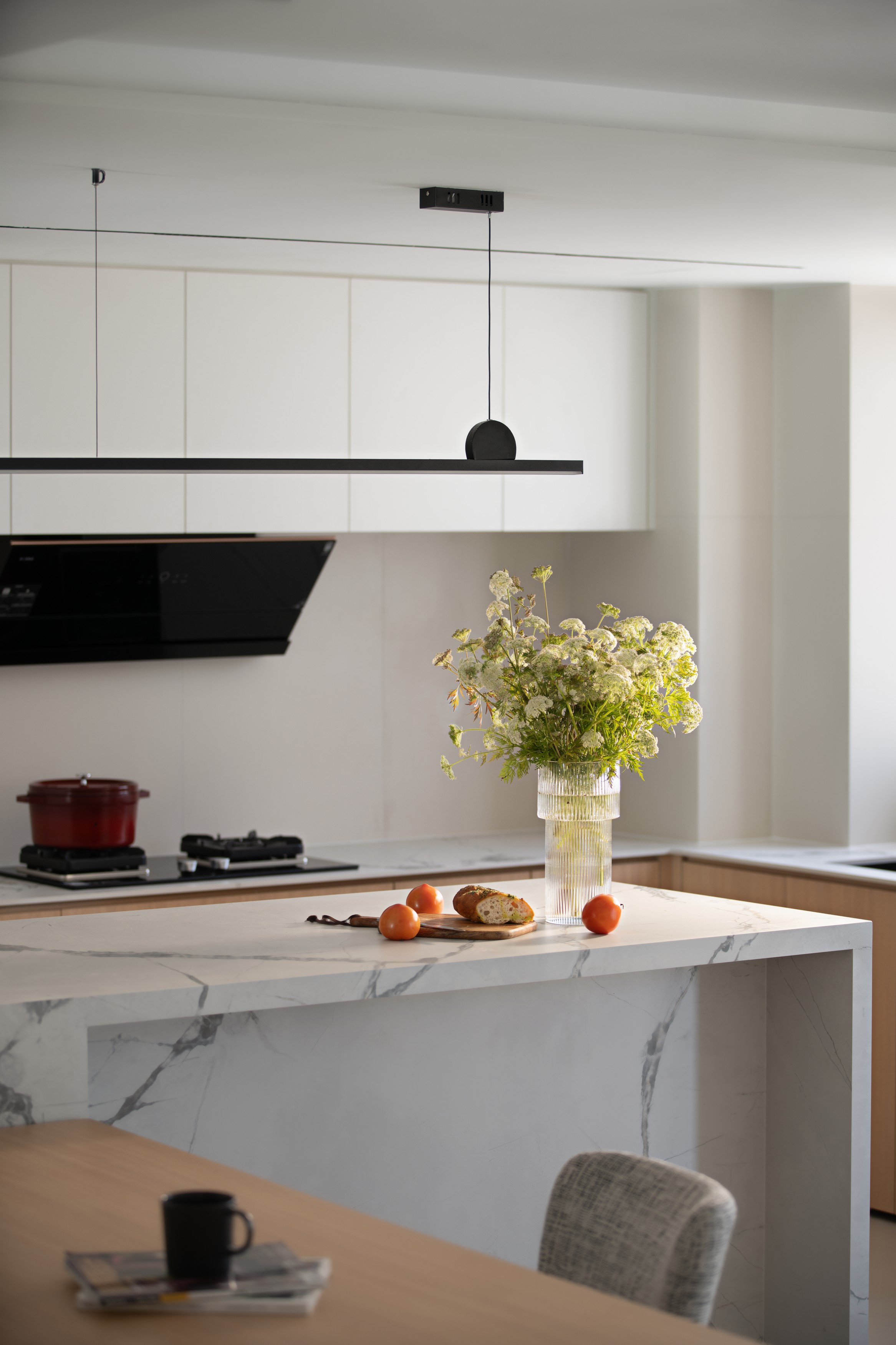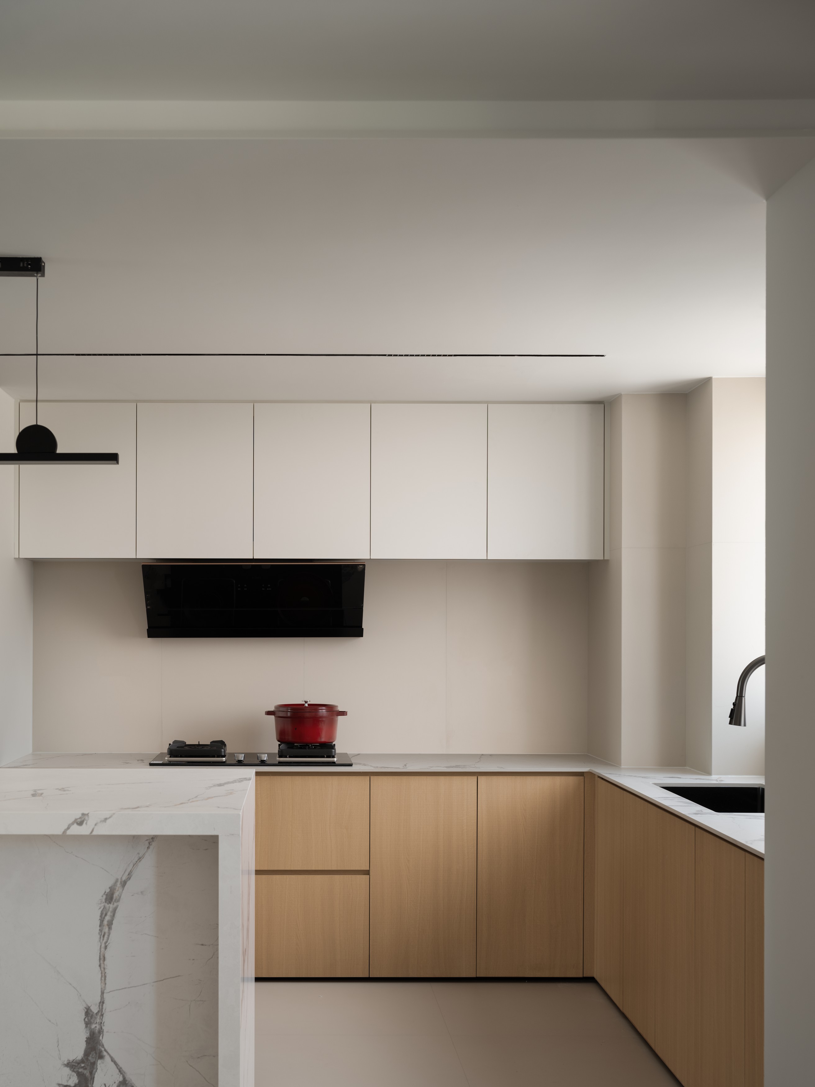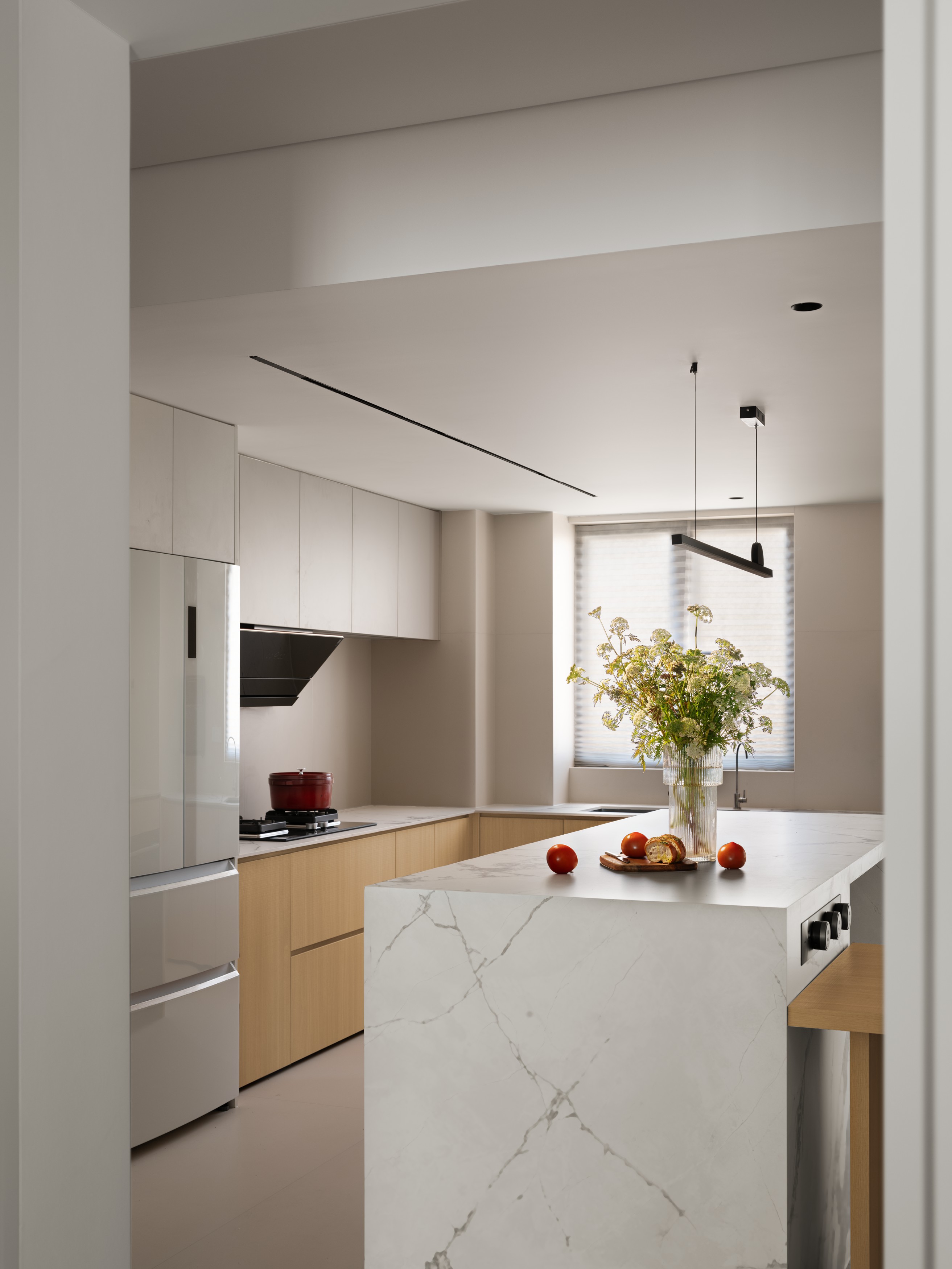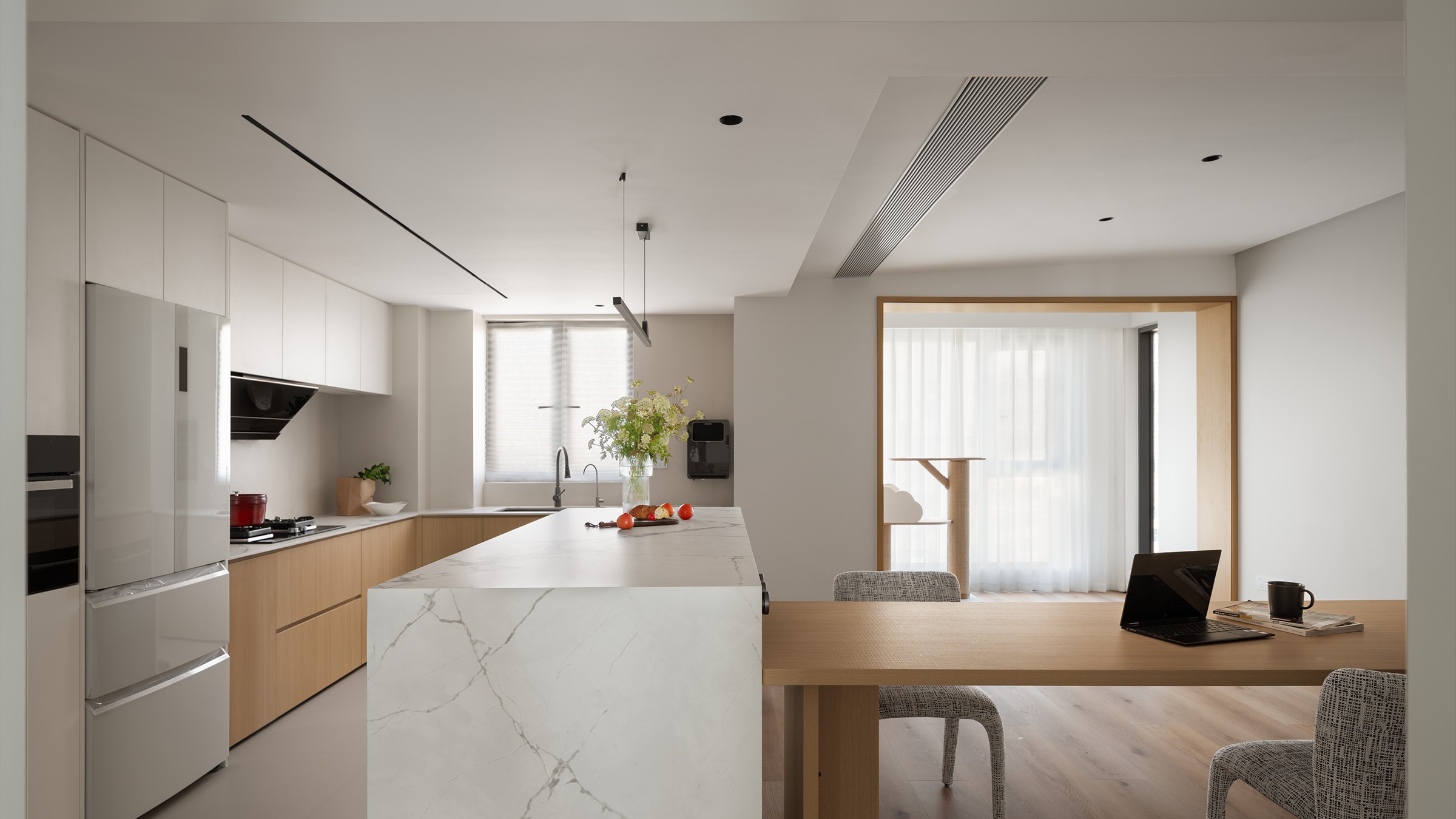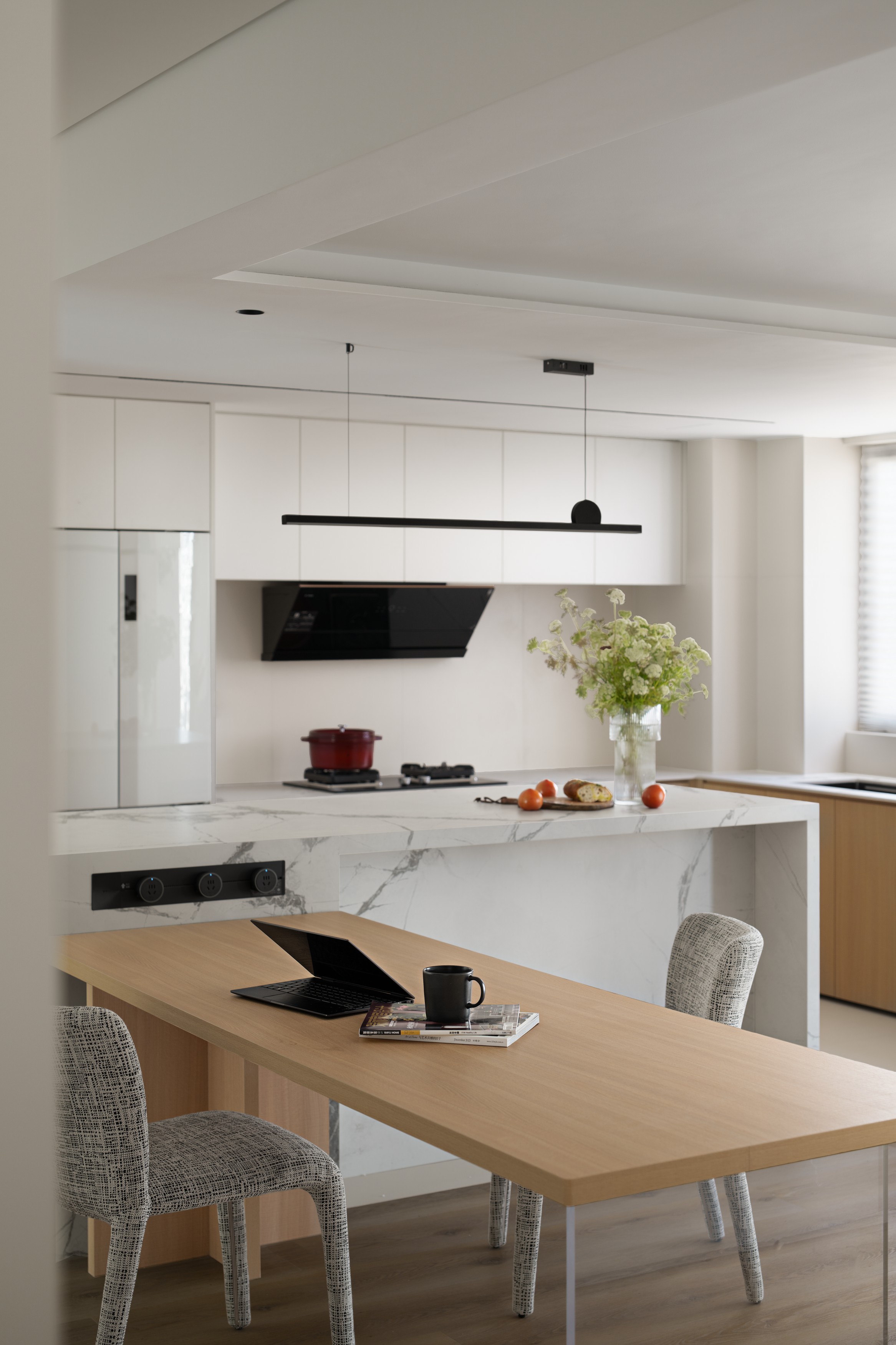 2. 采用LDK客餐厨一体化+去客厅化设计,L形岛台+餐桌打造洄游动线,强化情侣互动性,斜顶吊顶化解低梁缺陷,同时内置设备减少清洁负担;