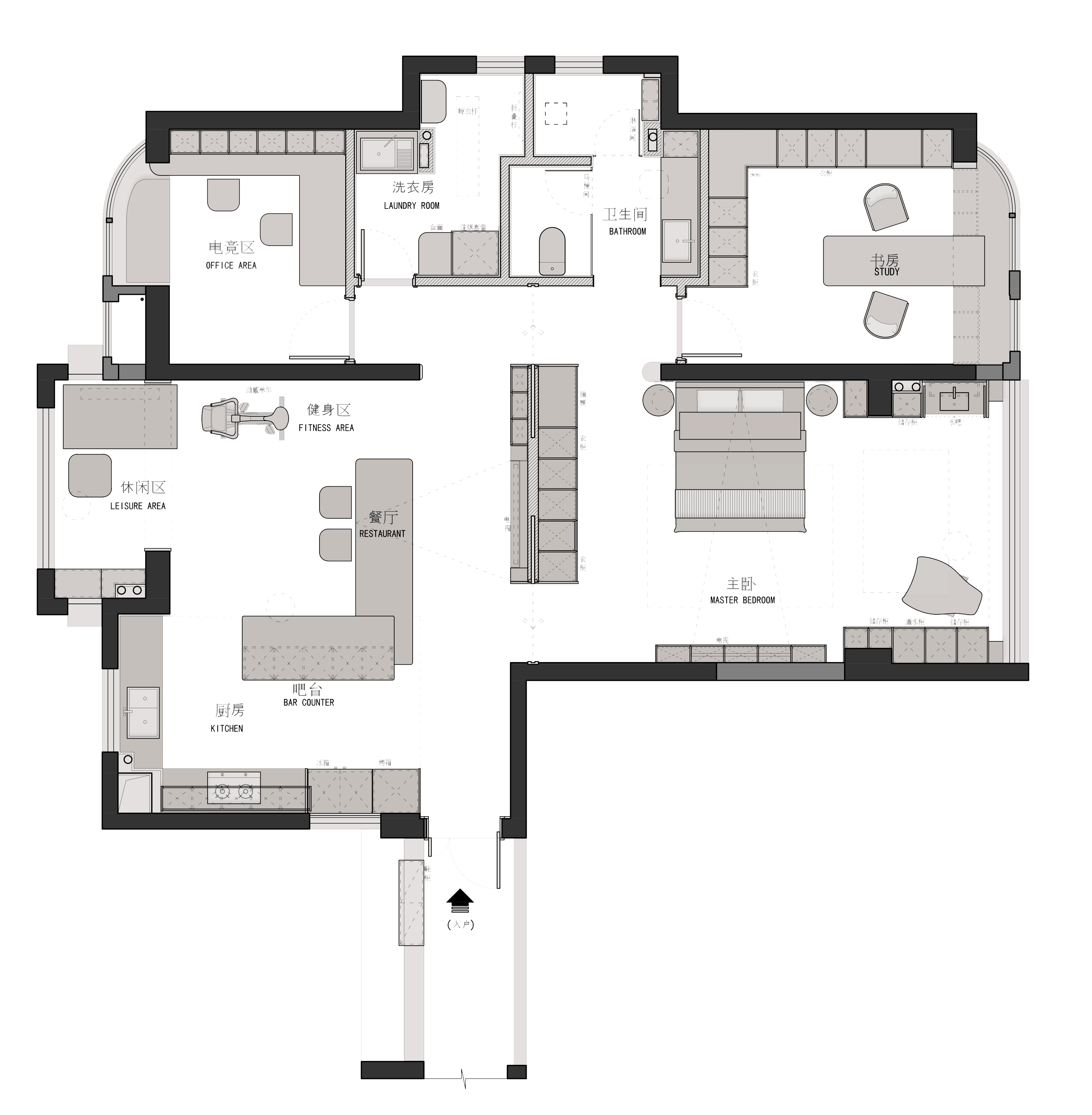 3. 功能复合化布局,多功能房整合衣帽间+书房+茶室,电竞房L形悬浮桌满足双人开黑,榨干每寸空间,解决原户型收纳不足、无衣帽间痛点;