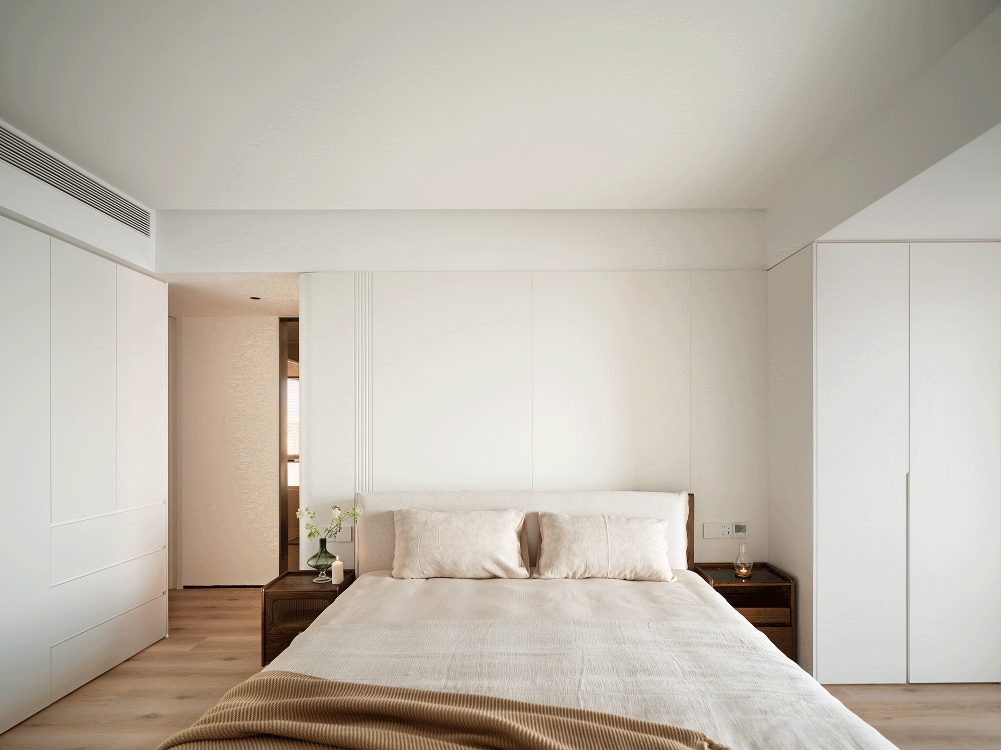 空间布局:1. 打破原户型局限,原客厅改主卧套间,双口袋门连通公区,最大化引入江景,同时联动卫浴与多功能房形成主卧洄游动线,重塑核心休憩空间;