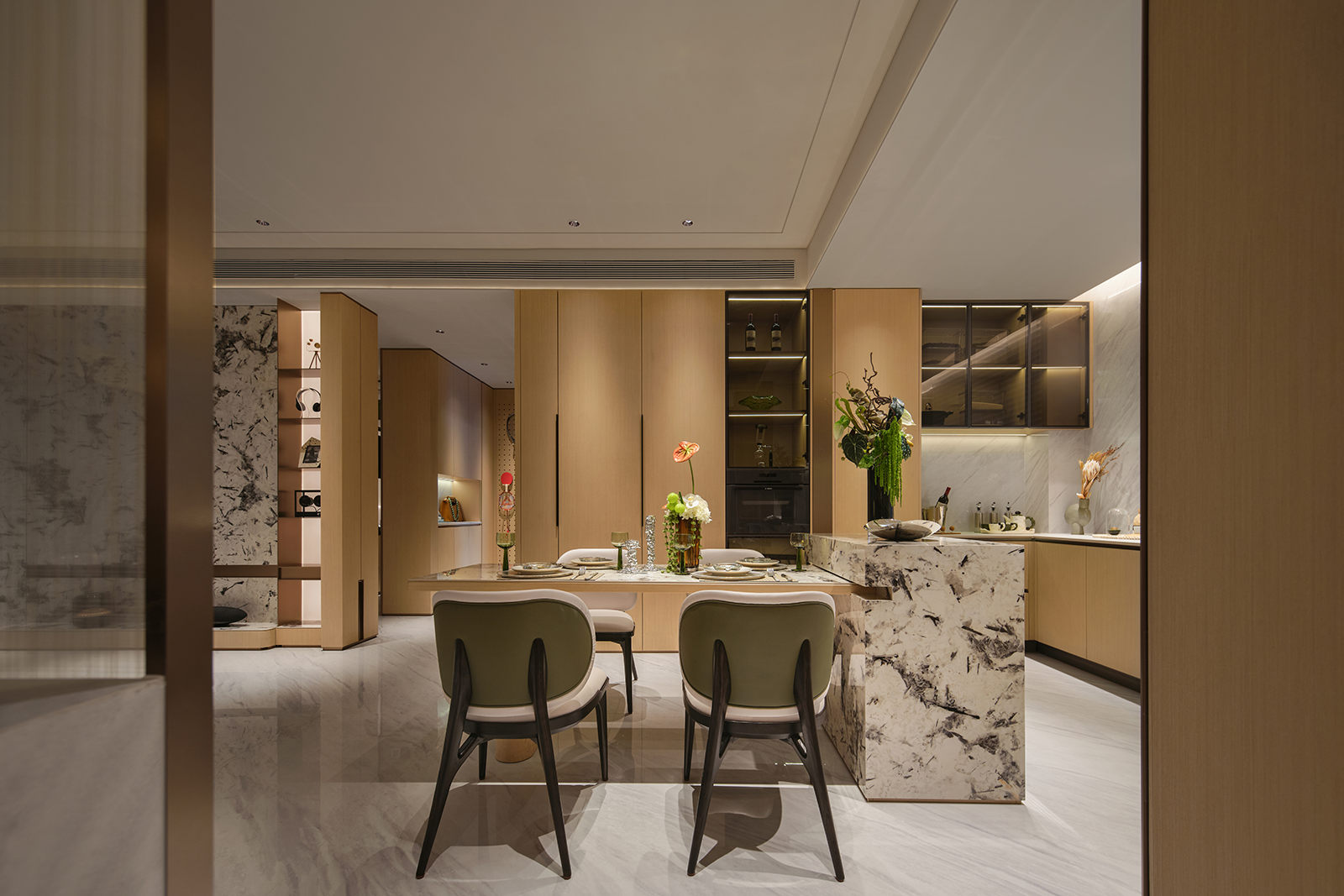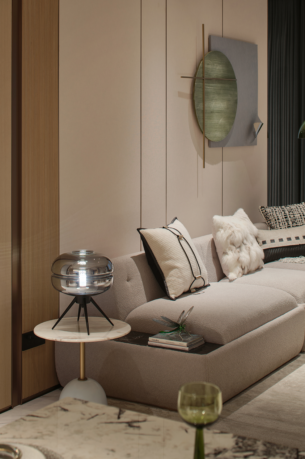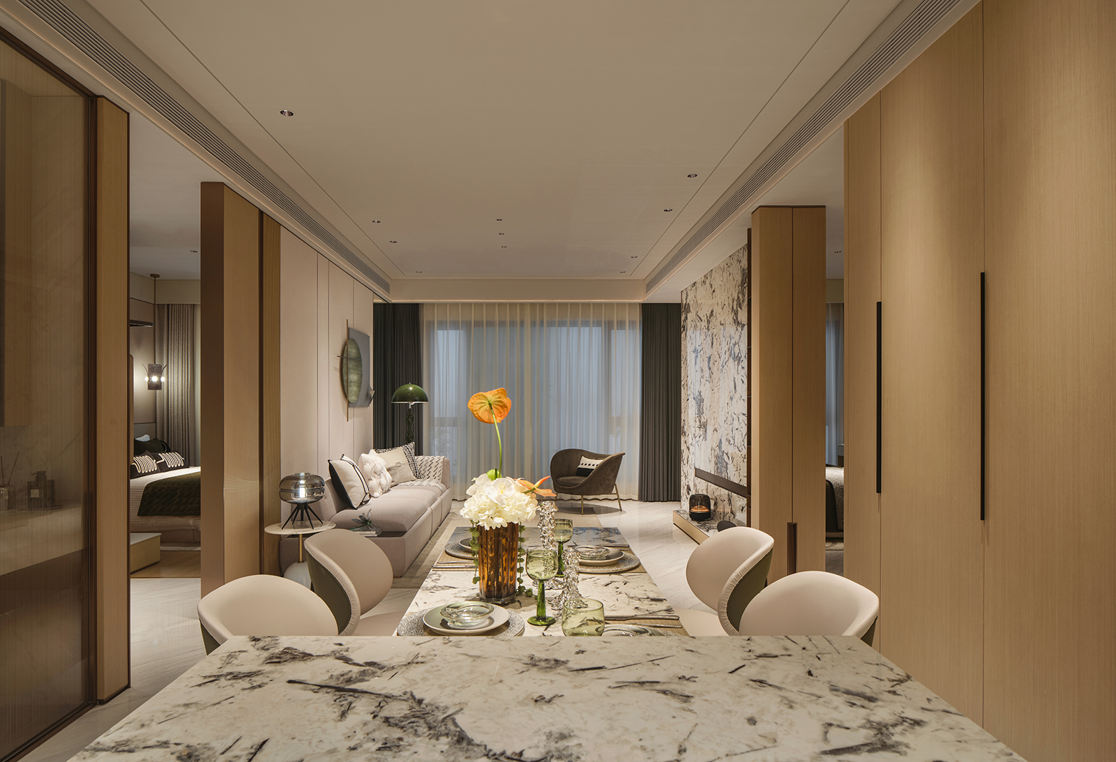 色彩与光感: 整体以浅灰、暖白、木色为基调,如同柔光滤镜,奠定宁静氛围。家具为空间注入一丝优雅且柔软的心理慰藉,与黑白纹理石材的冷峻艺术感形成有趣的感官平衡。