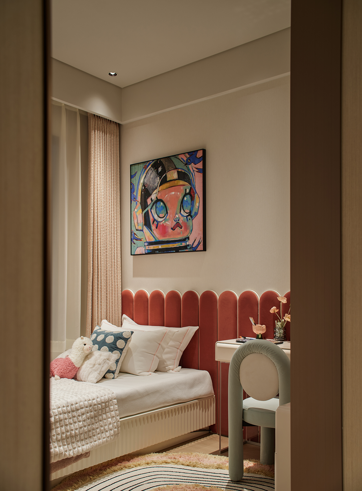 2. 私密区域: 各卧室在统一温润的基调下,进行个性化功能布局。主卧强调套间般的私密与仪式感;次卧通过浅木纹墙面营造酒店式舒适休憩感;儿童房的布局创新则完全围绕“安全与成长”展开,所有家具圆角化处理、预留充足活动区域,布局灵活可变,适应孩子不同成长阶段的需求。 -