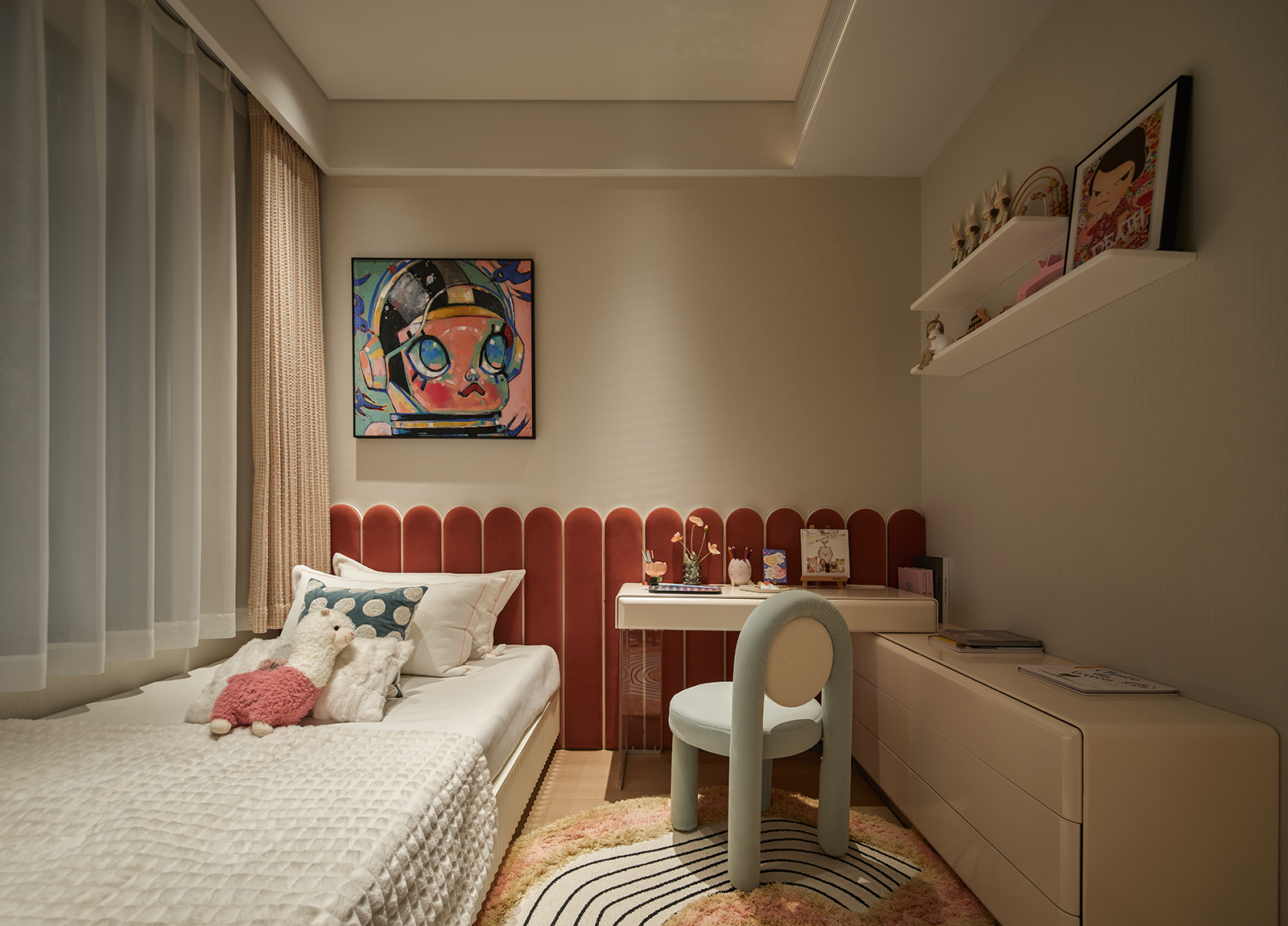 1. 即时效果: 步入空间,用户能立即被宁静、温馨的氛围包裹。柔和的色调与自然光影缓解视觉疲劳,多样的材质触感丰富探索乐趣。儿童房的安全设计让家长彻底安心。