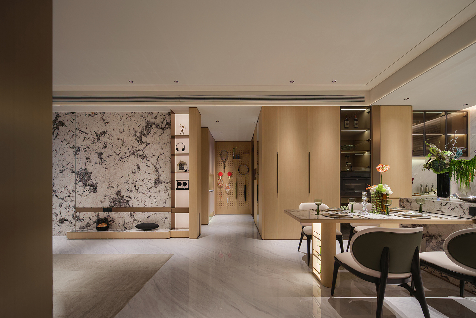 空间布局:1. 公共区域: 采用一体化设计,客厅、餐厅无缝衔接,强化家庭互动。背景墙与餐台的一体化石材设计,是布局的一大亮点,它既是视觉焦点,又作为功能性的空间软隔断,暗示了功能分区,确保了空间的通透性与整体感,体现了现代“去客厅化”社交生活理念。